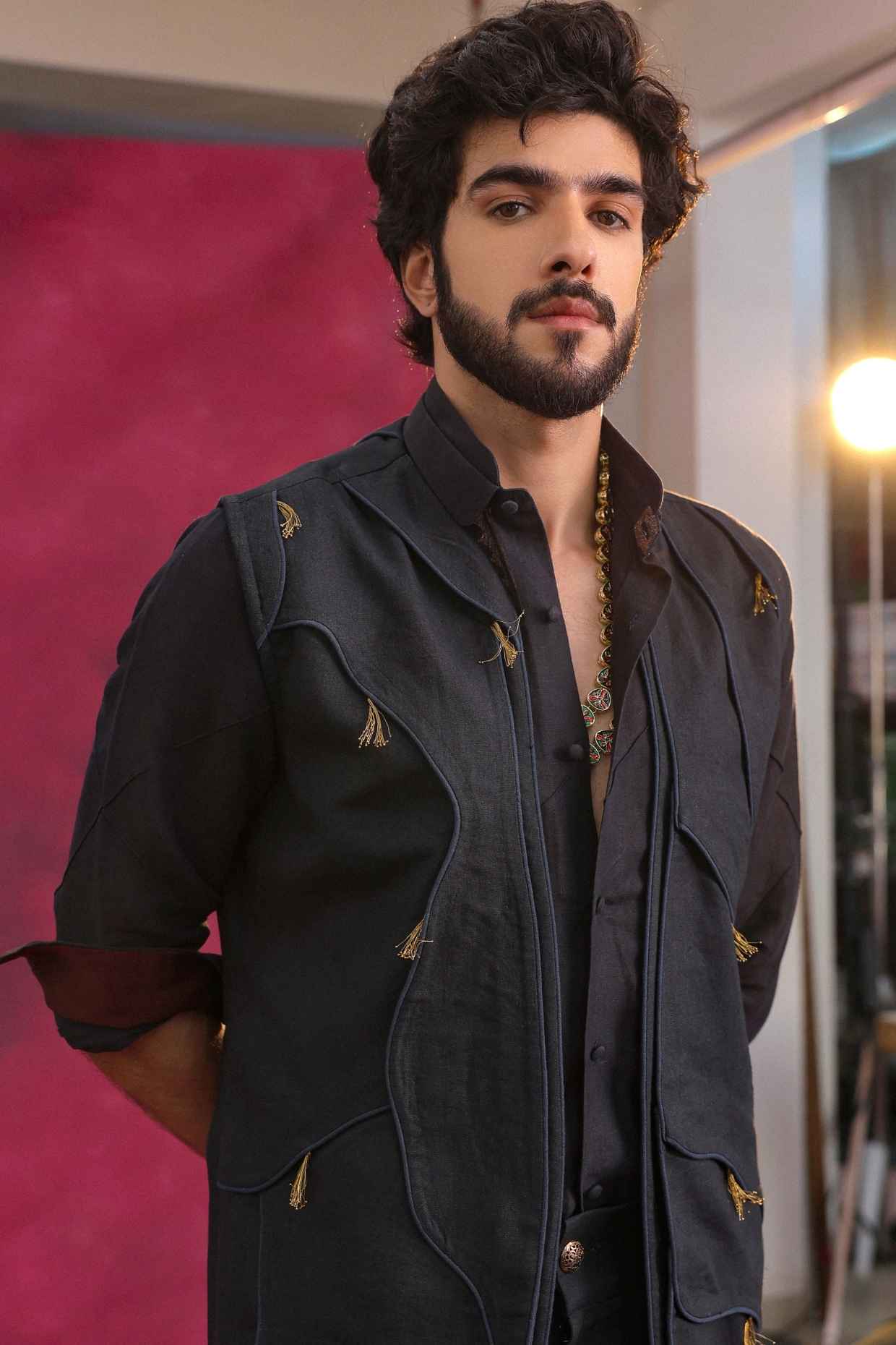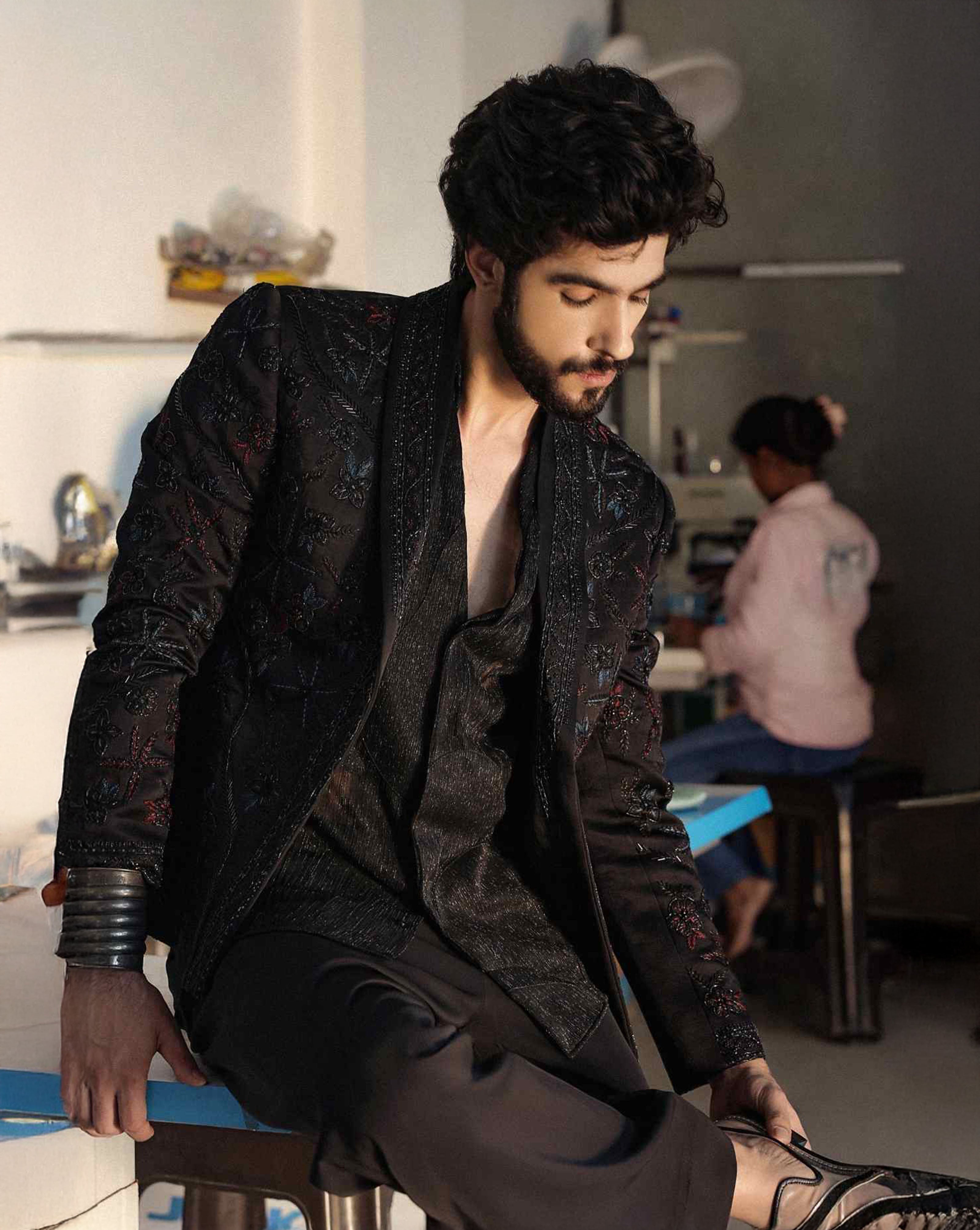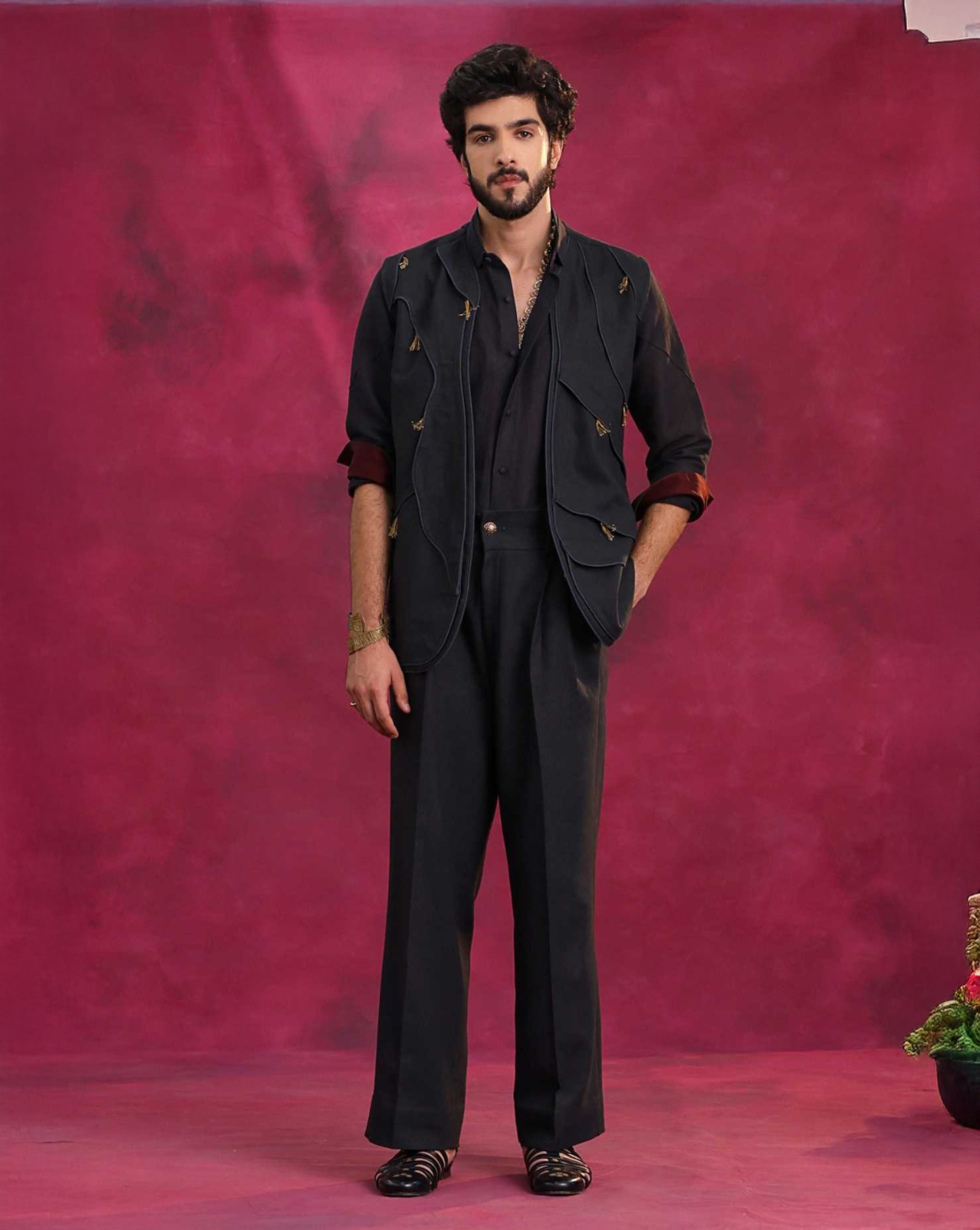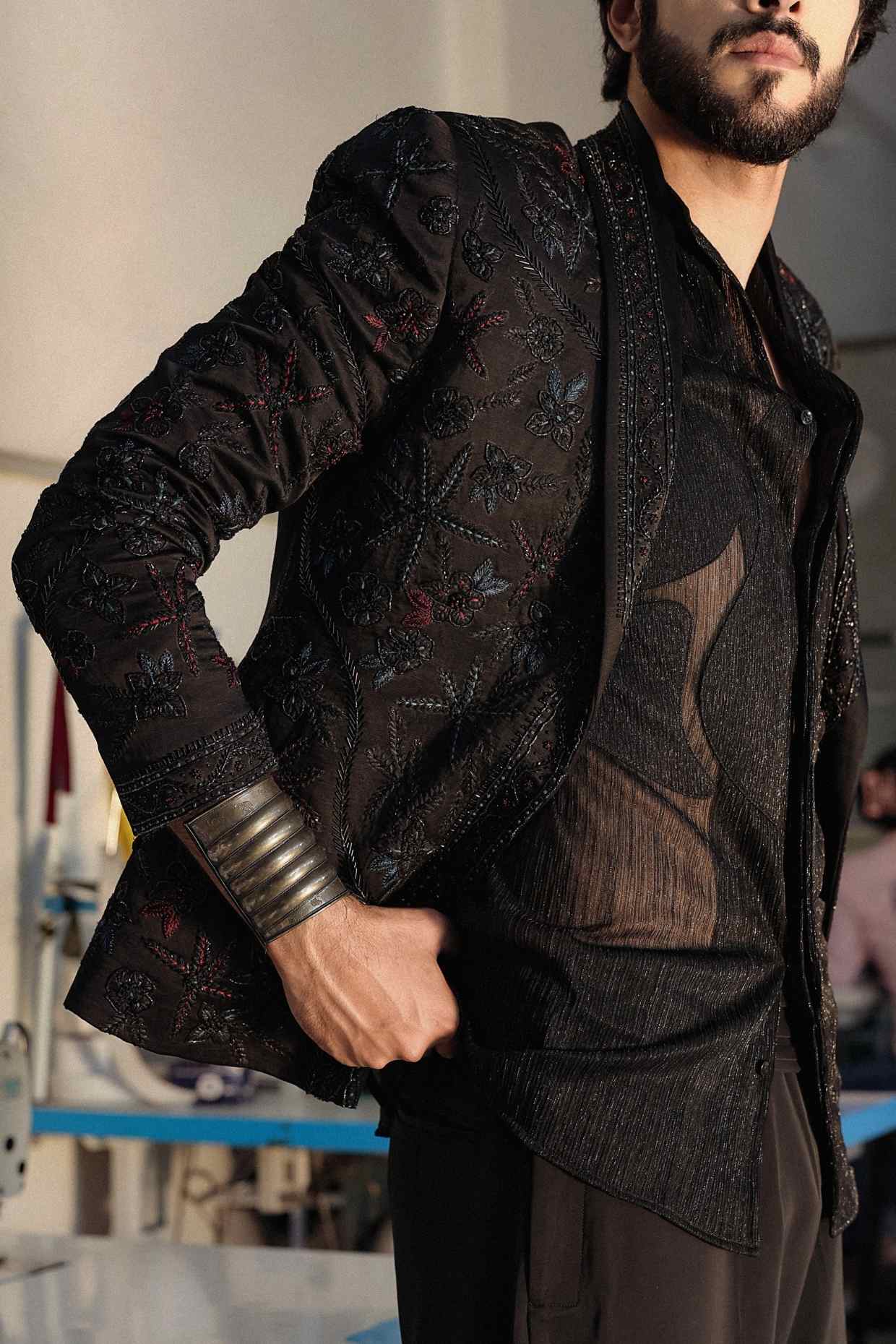 Black Thread Work Open Jacket Set