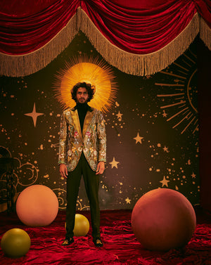 Antique gold tissue Paper Doll tissue appliqued and embelished blazer with black lapel