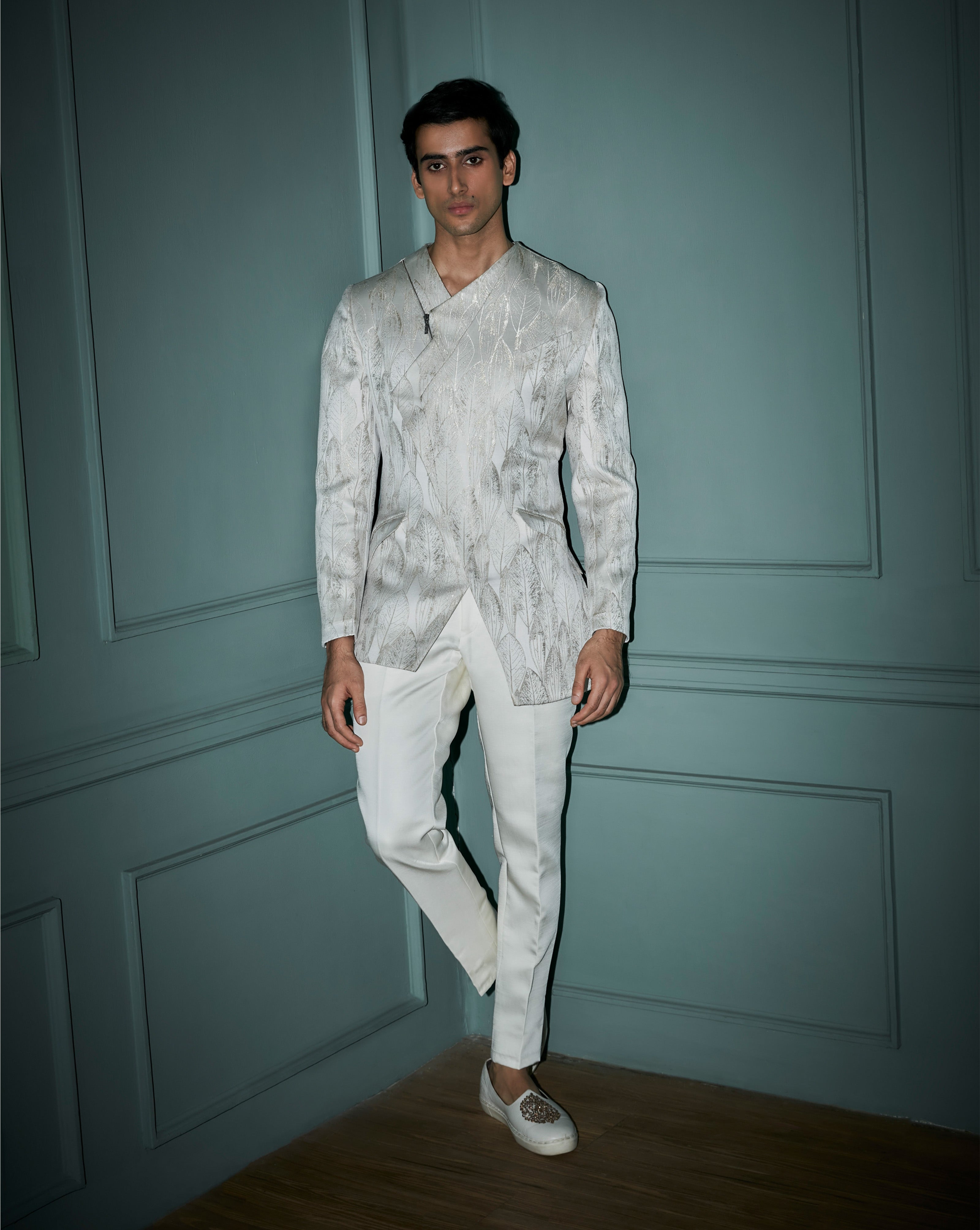 Exclusive Jacket set tailored in a textured fabric. It comes with a matching pant making you look all dapper.