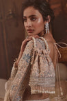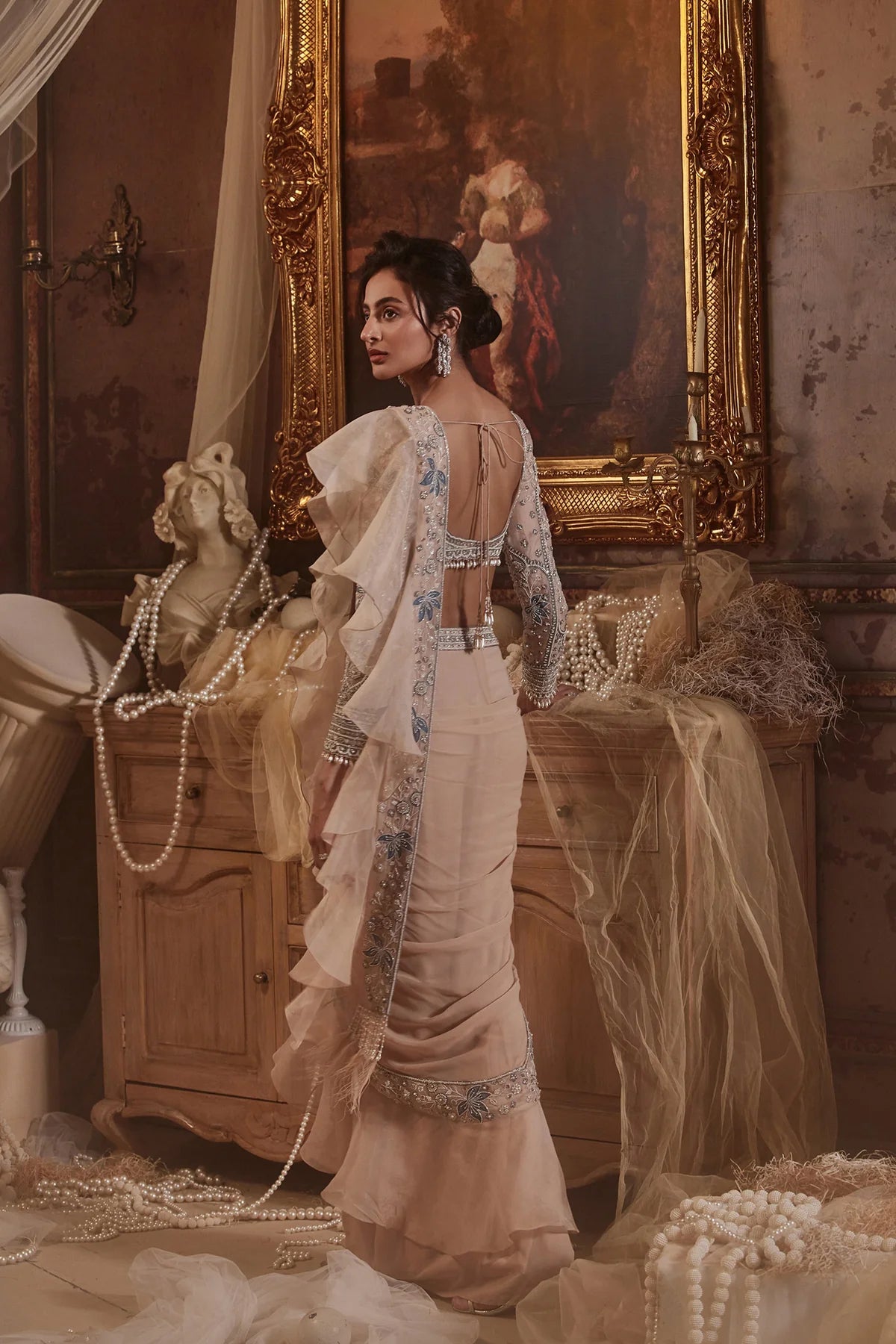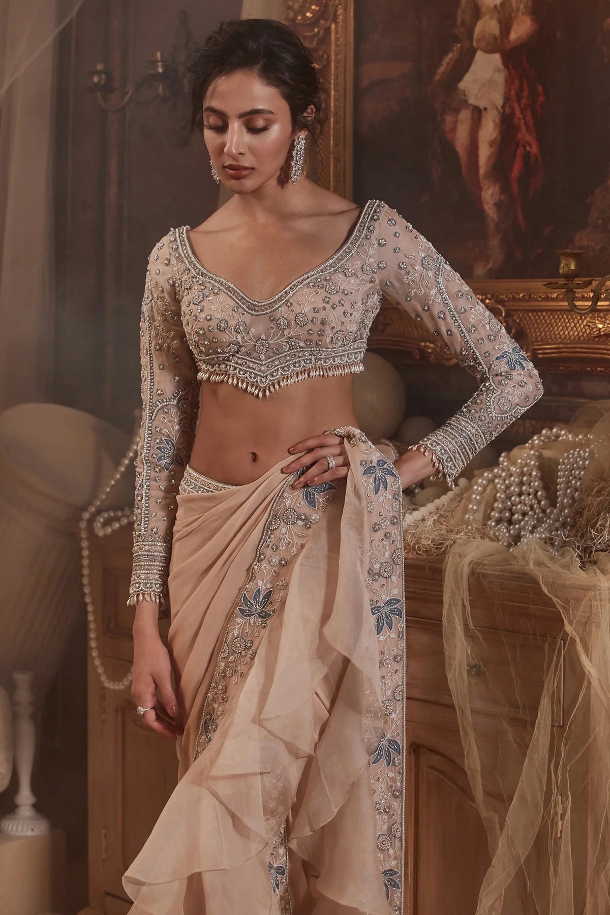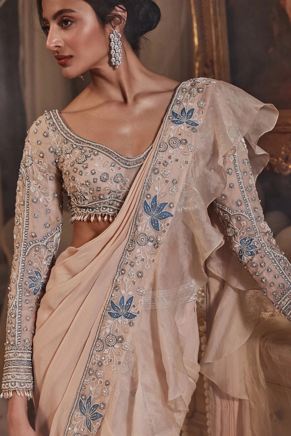 Featuring Adileh, A soft peach ruffle saree based on Georgette with an old-school vintage aurora. The blouse is based on organza and has full sleeves, intricate blue embroidery, and hanging tassels in the front. The saree is based on organza and Georgette with intricate border all across and is finished with a ruffle palla.