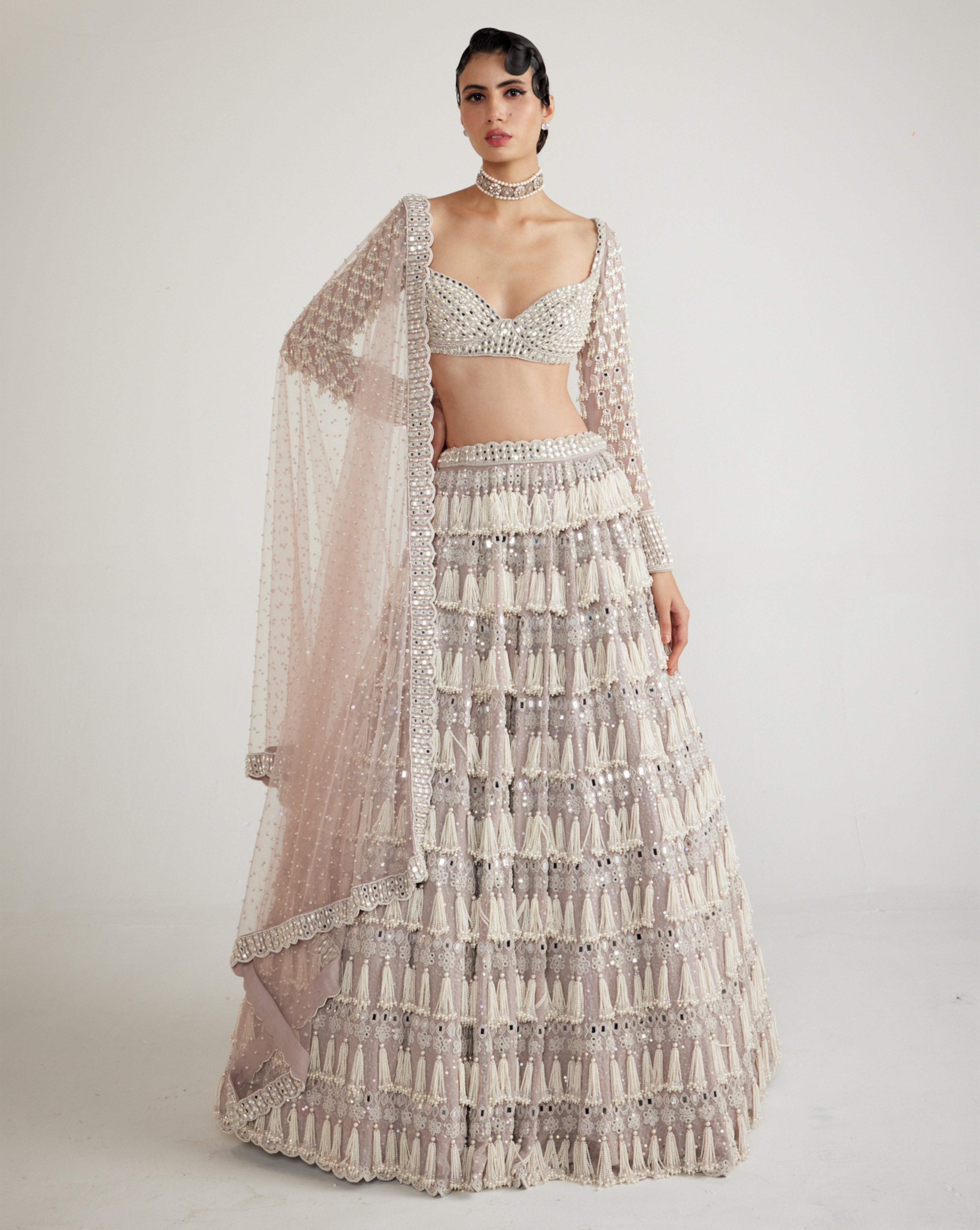 Ash Pink Chandelier Pearl Drop Full Sleeve Lehenga Set