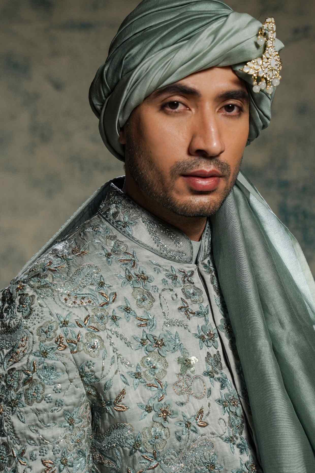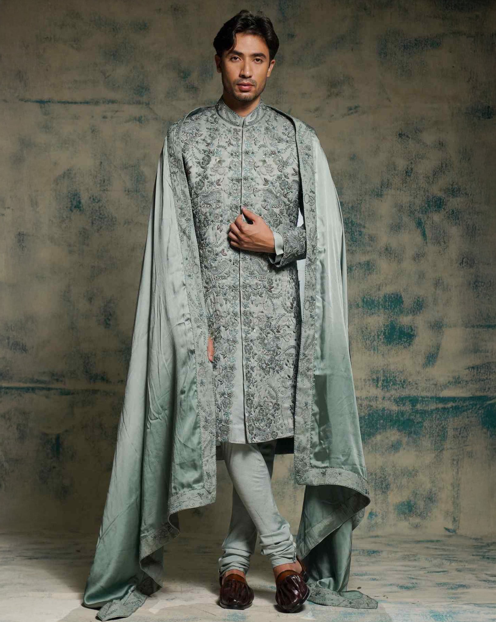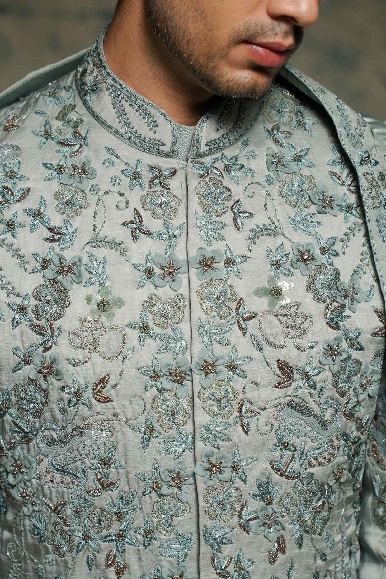 Presenting ASHWAT, a Sherwani set in a striking Chateau Gray hue. Meticulously hand-embroidered by our artisans using diverse techniques with organza, net, resham, and delicate elements, the design comes alive in the form of a trident, embodying the gunas of the Trishul. Hidden between the intricate floral motifs lie subtle depictions of the Damru and serpent — powerful emblems of Shiva’s cosmic energy. Paired with a kurta and churidaar, this ensemble is a true harmony of symbolism, craftsmanship, and contemporary elegance..