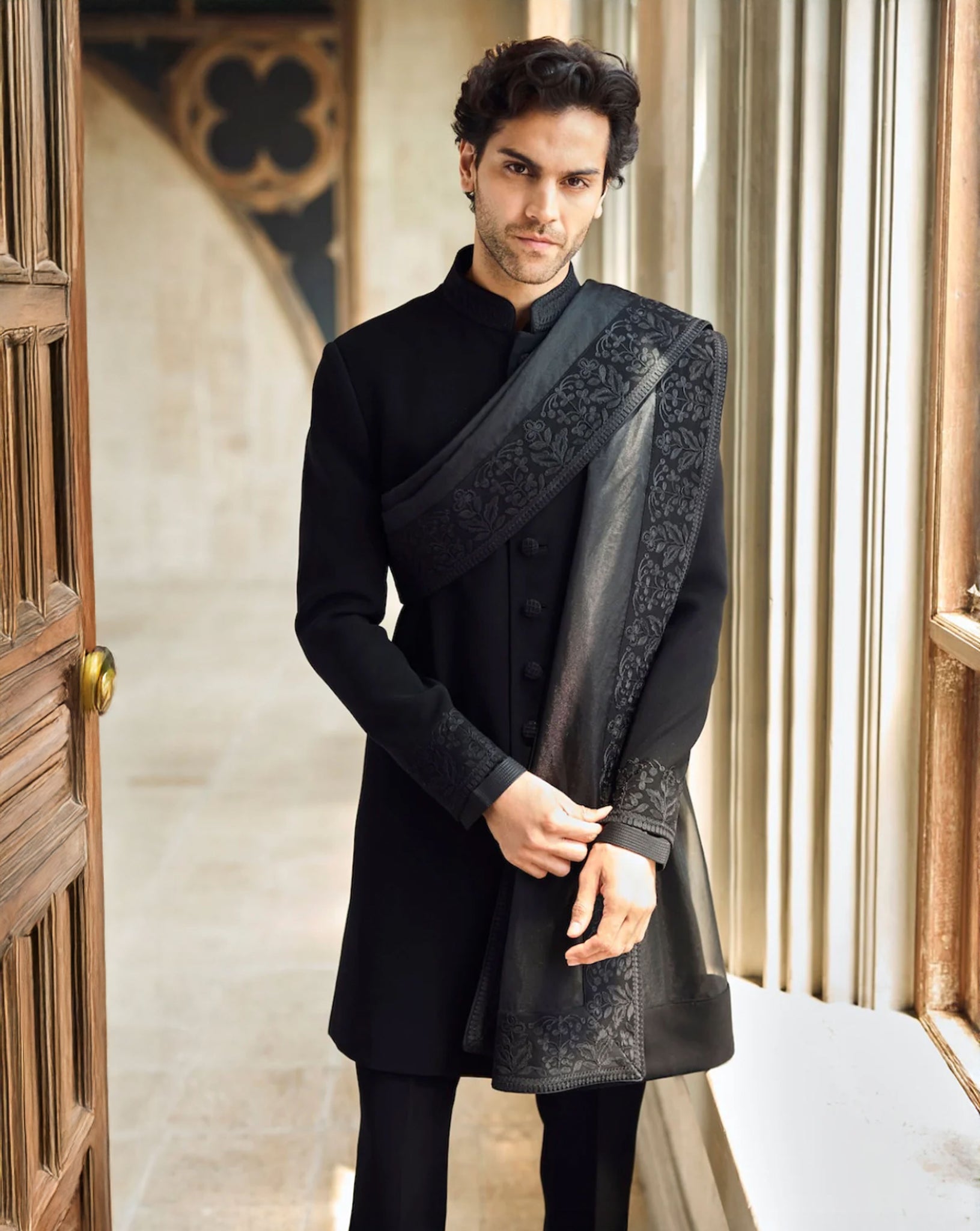 This black sherwani set features tonal thread embroidery on the cuffs and a stepper collar detail on an italian crepe base. This ensemble is paired with a matching crepe kurta and straight pants. Complementing stole and footwear is also available.