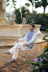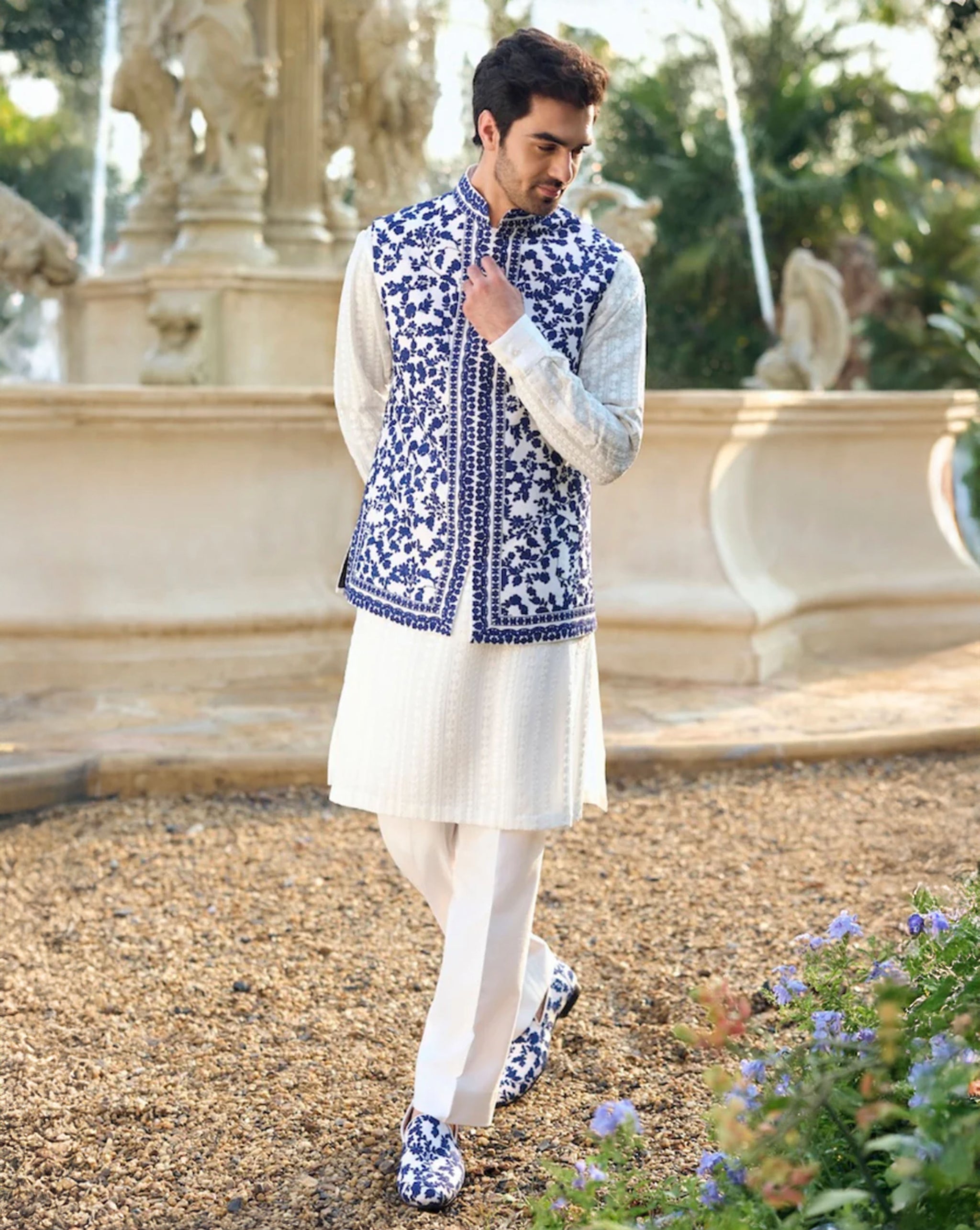 This blue bundi set features intricate thread work embroidery on a silk base. The outfit is paired with an ivory embroidered silk kurta and straight pants. Complementing footwear is also available.