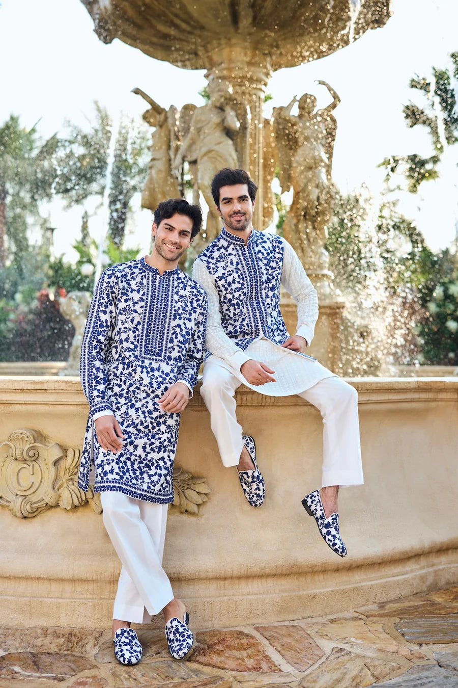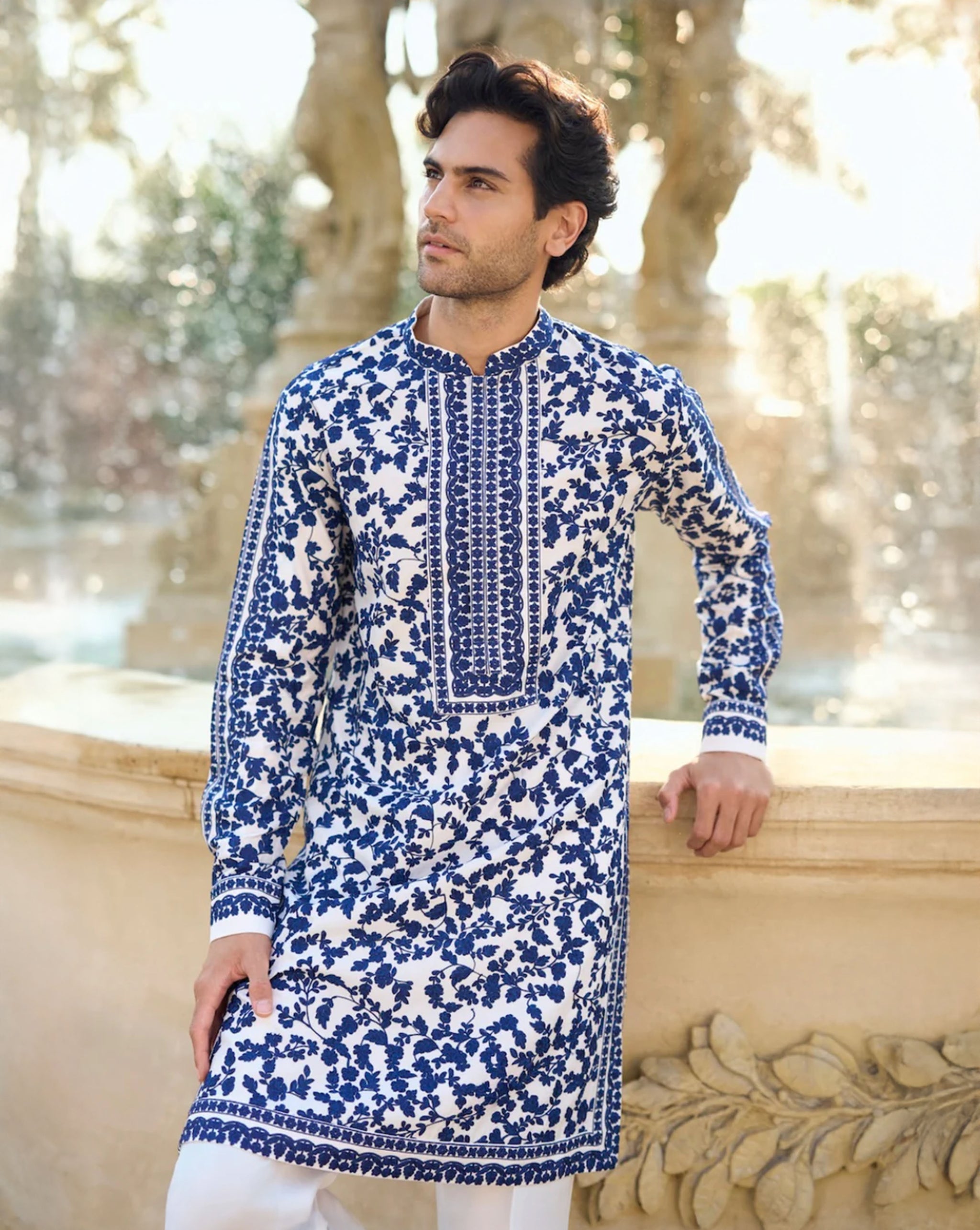 This blue kurta set features intricate thread work embroidery on a silk base. The outfit is paired with an ivory straight pants.Complementing footwear is also available.