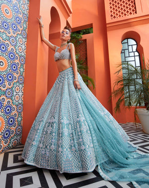 The Camellia Lehenga set is Turkish blue taffeta , heavily embroidered Lehenga set. The Dupatta is a beautiful net embroidered dupatta.