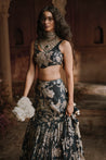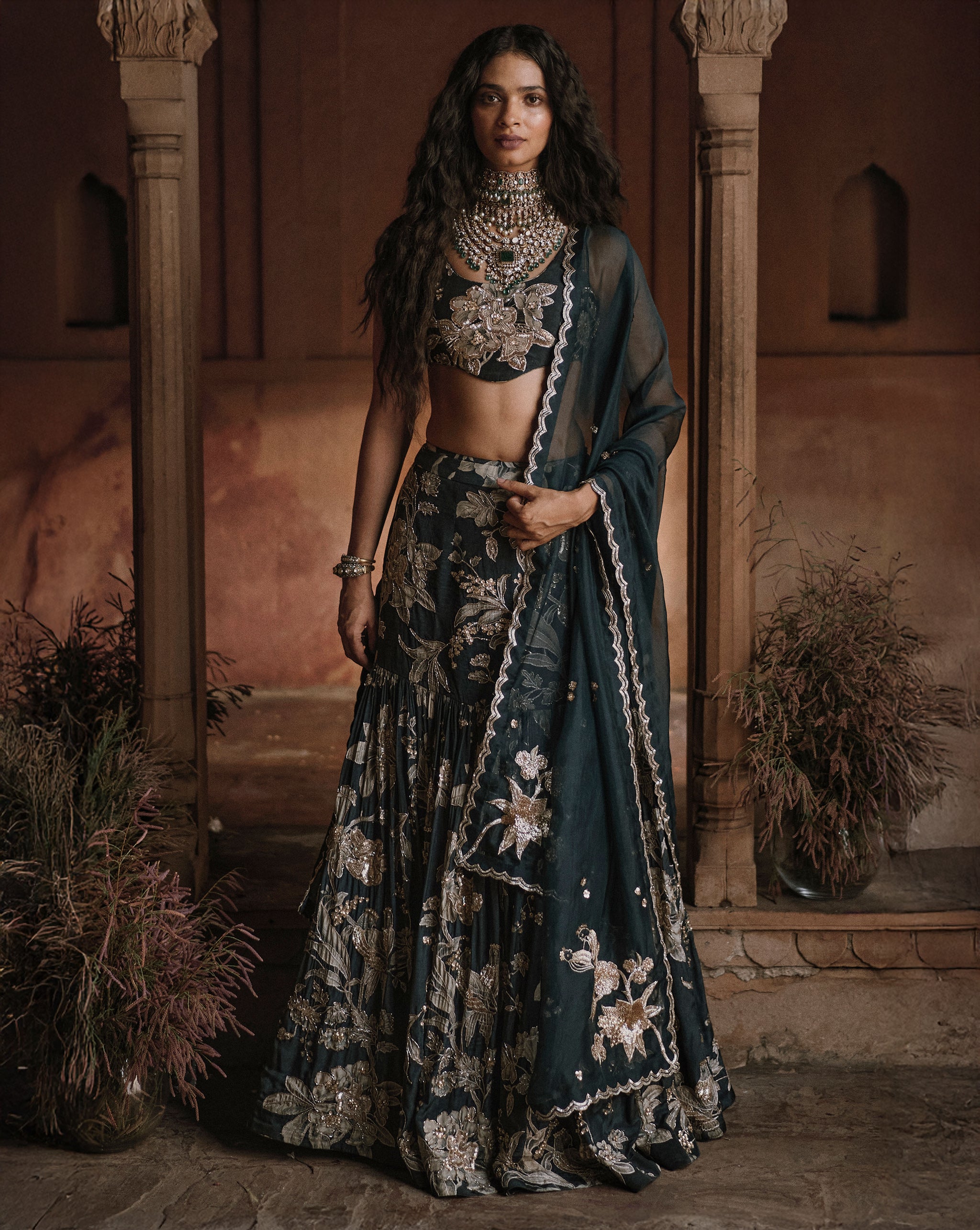 A romantic fish cut lehenga in our signature Roop flip bird print, featuring a pair of birds in their enchanting habitat. Hand–embroidered in mixed techniques, the print truly sings.It is paired with a U cut sleeveless blouse, featuring ornate hand-embroidery and an organza dupatta with scallops and delicate buttis.
