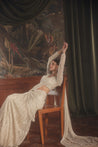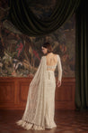 An ode to everlasting ivory-draped saree. A seamless cascading sequins, glimmering crystals, and intricate bugle beadwork unveil a spellbinding symphony of opulence and grace. The draped saree based on the net is an effortless amalgamation of timeless couture. Every stitch reflects a dedication to artistry, with intricate, seamless patterns that flow across the fabric like a delicate masterpiece. Each design is a masterpiece of dazzling brilliance, adorned with lustrous metallics, intricate embellishments, and reflective textures that shimmer like liquid light.