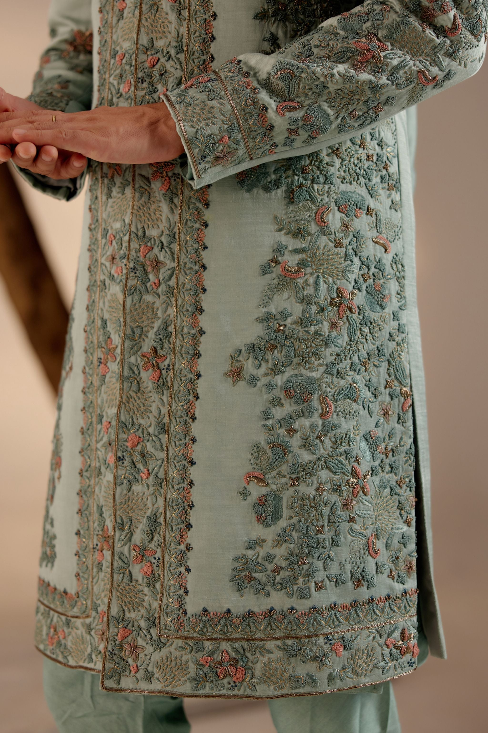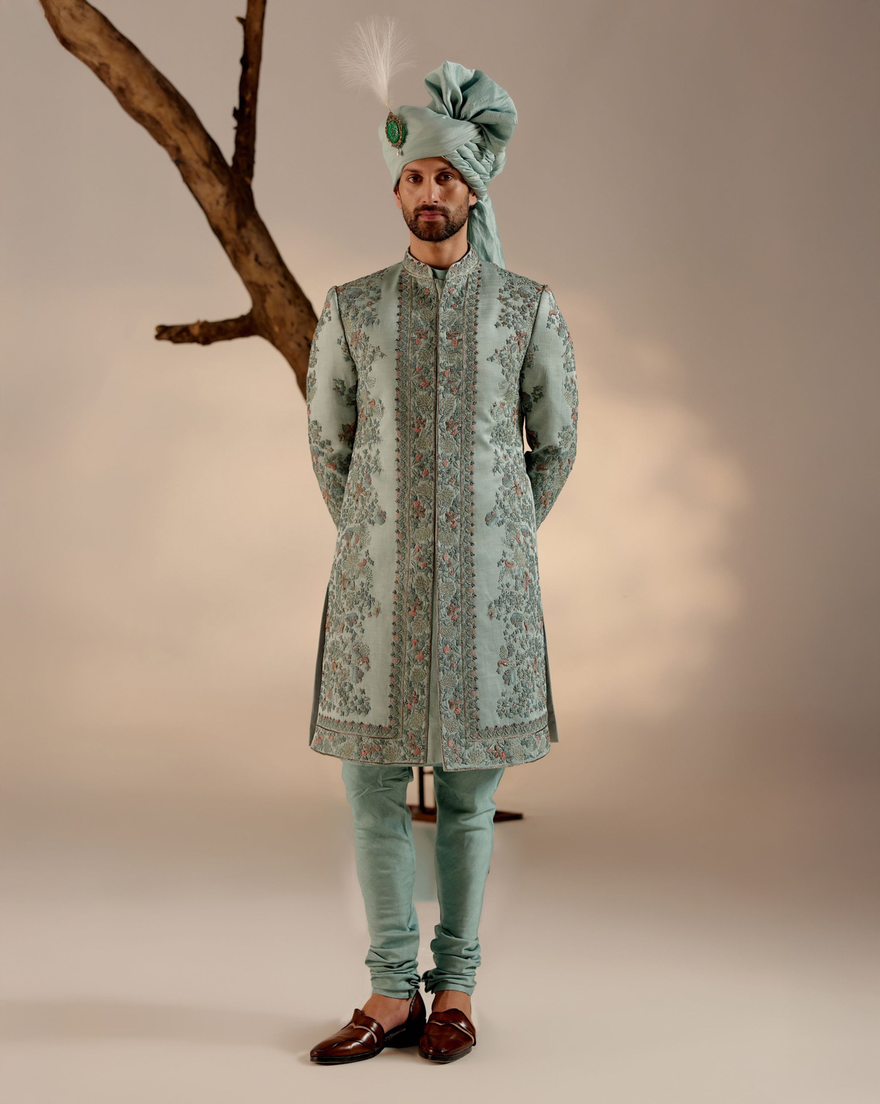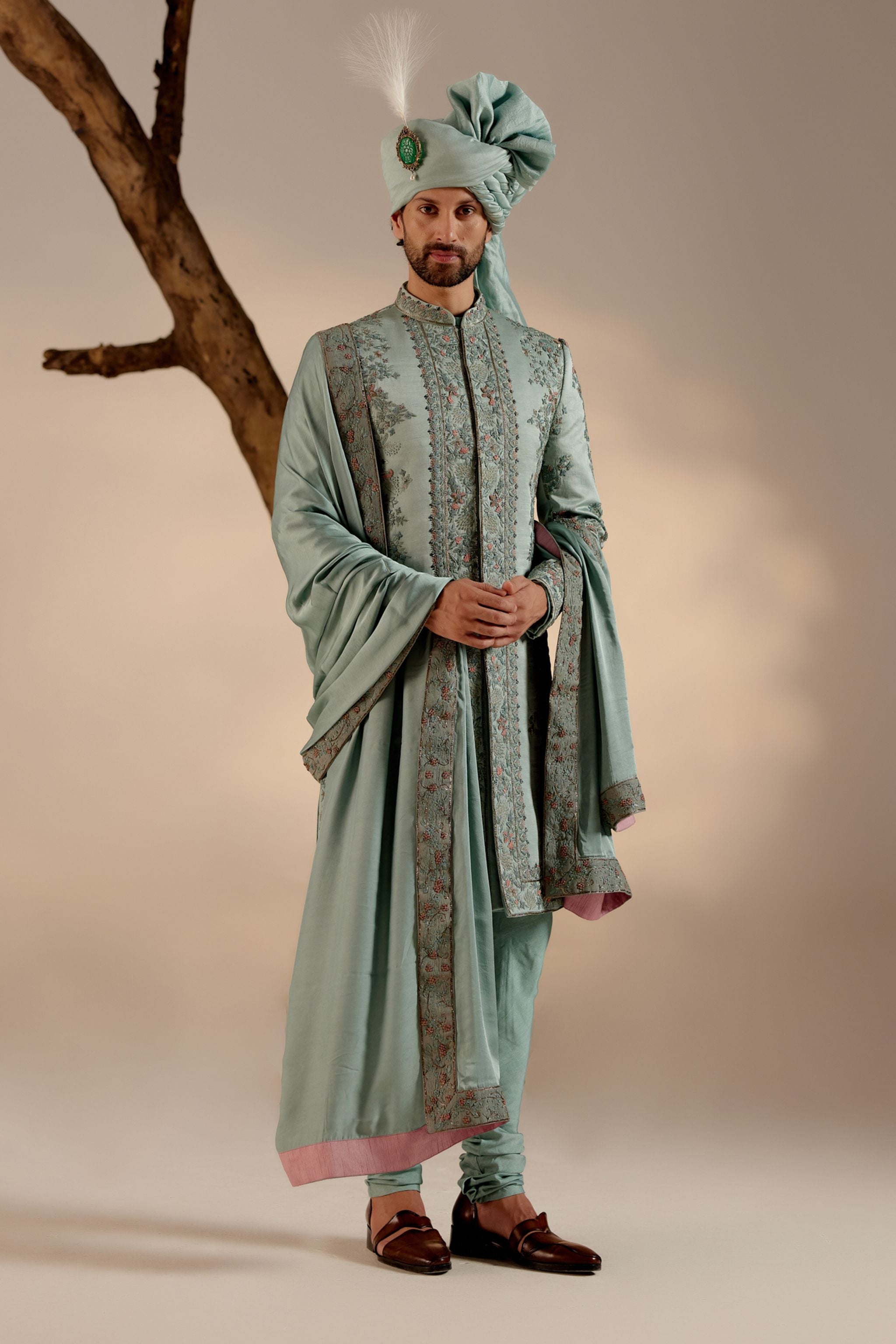 Featuring heavy hand-embroidered sherwani in chateau grey color with double border detail work on both sides of the placket. Highlighted with 3-D elements, dabka, and zari. Paired with a tone-on-tone hand-embroidered stole with contrast color backing detail and safa.
