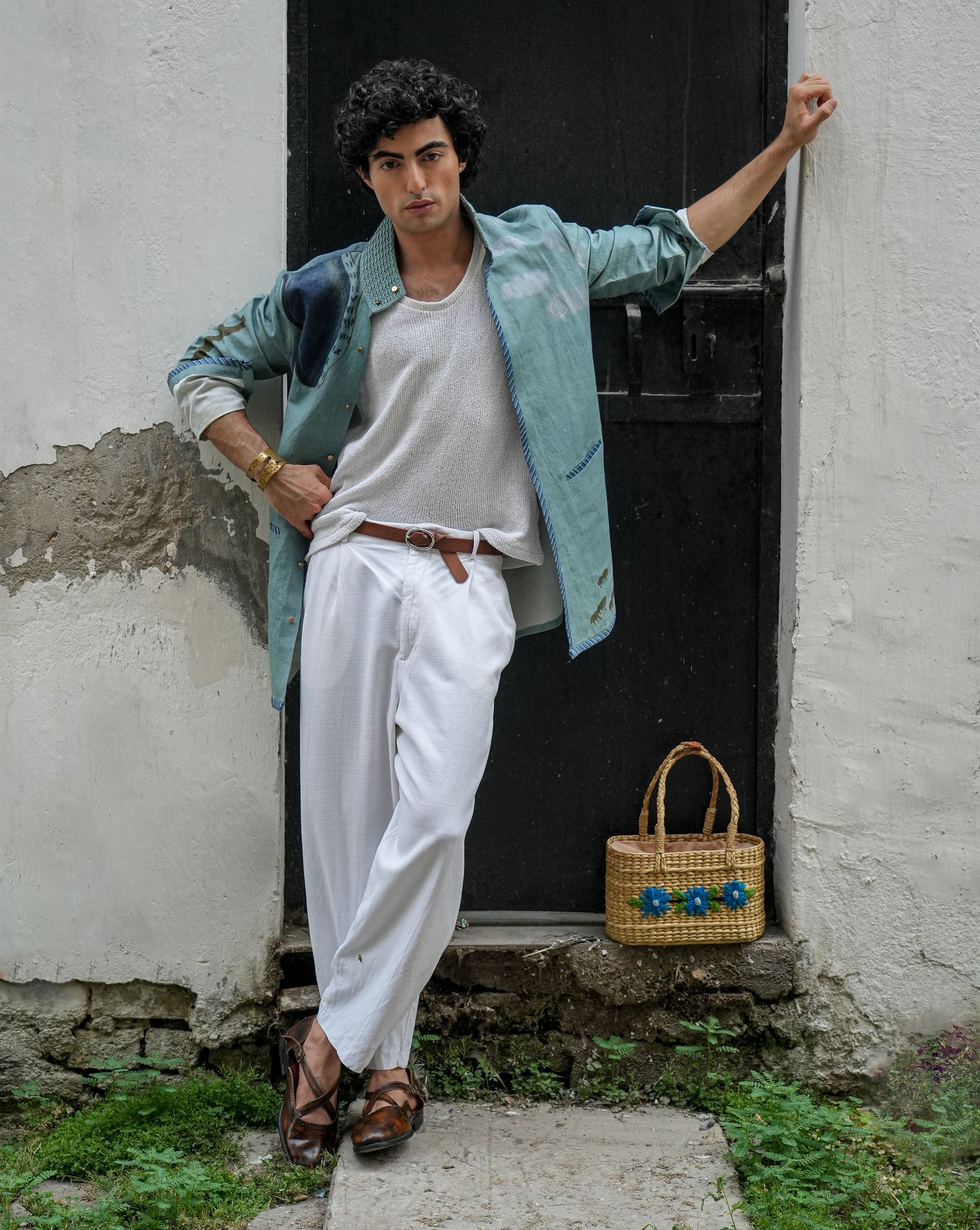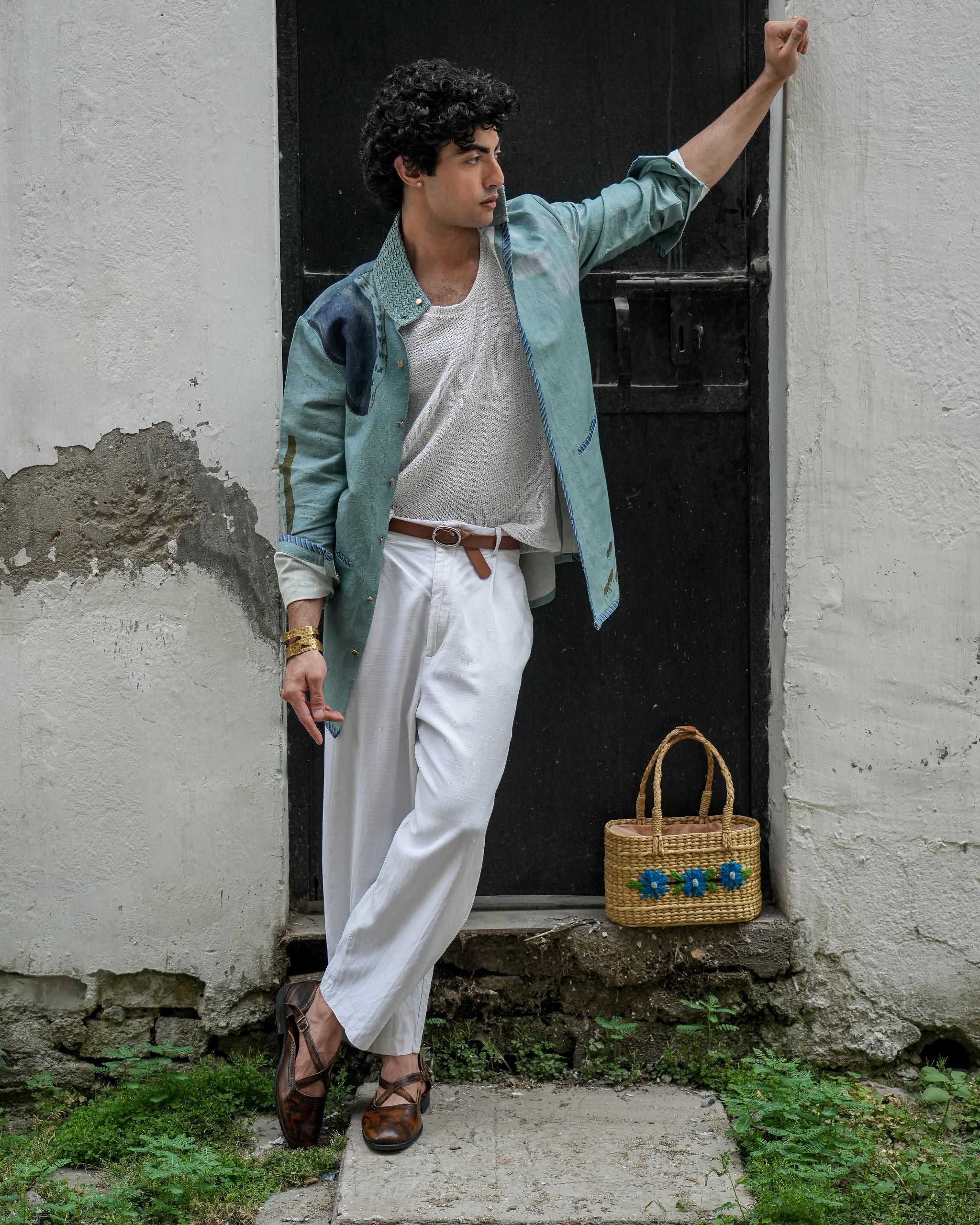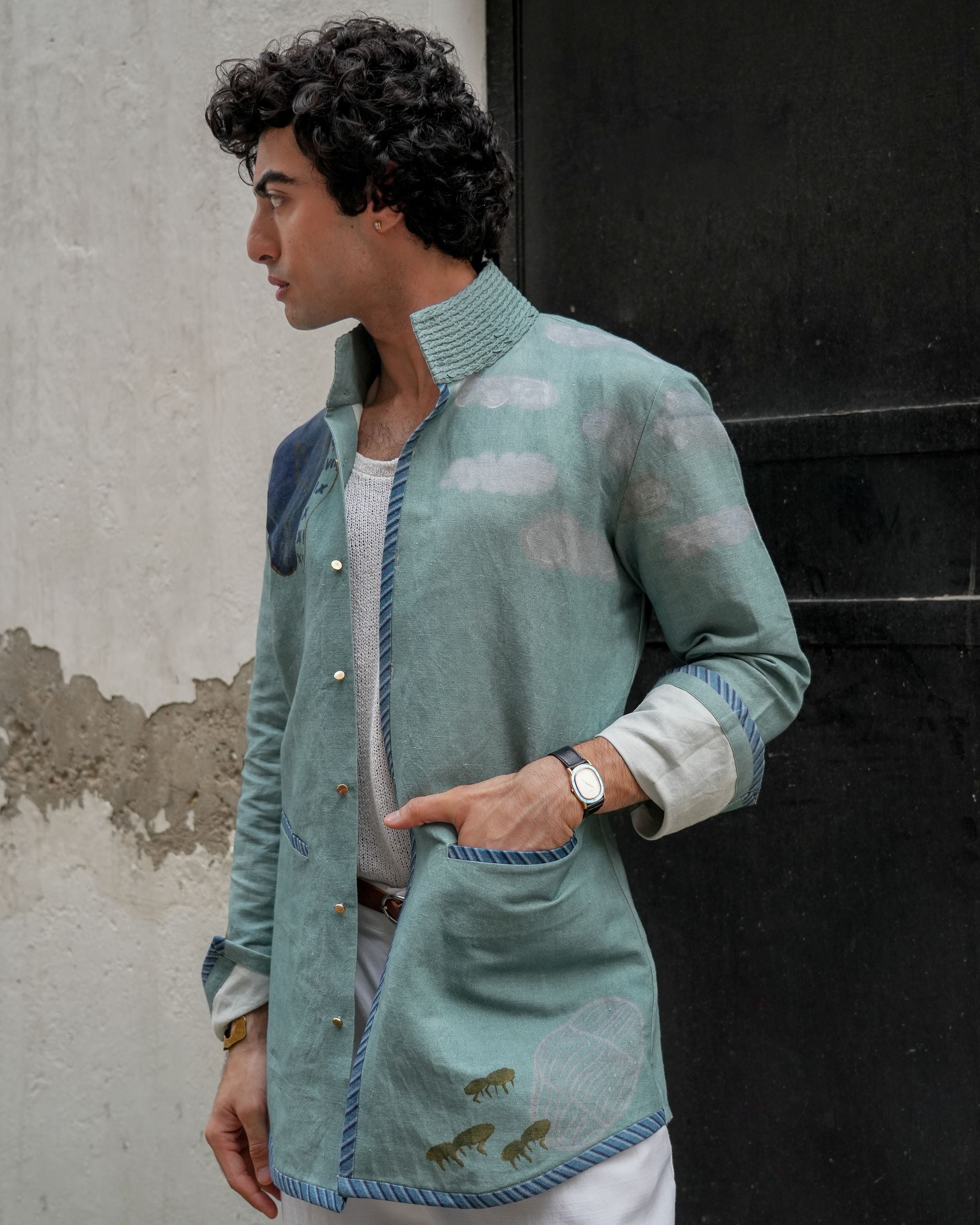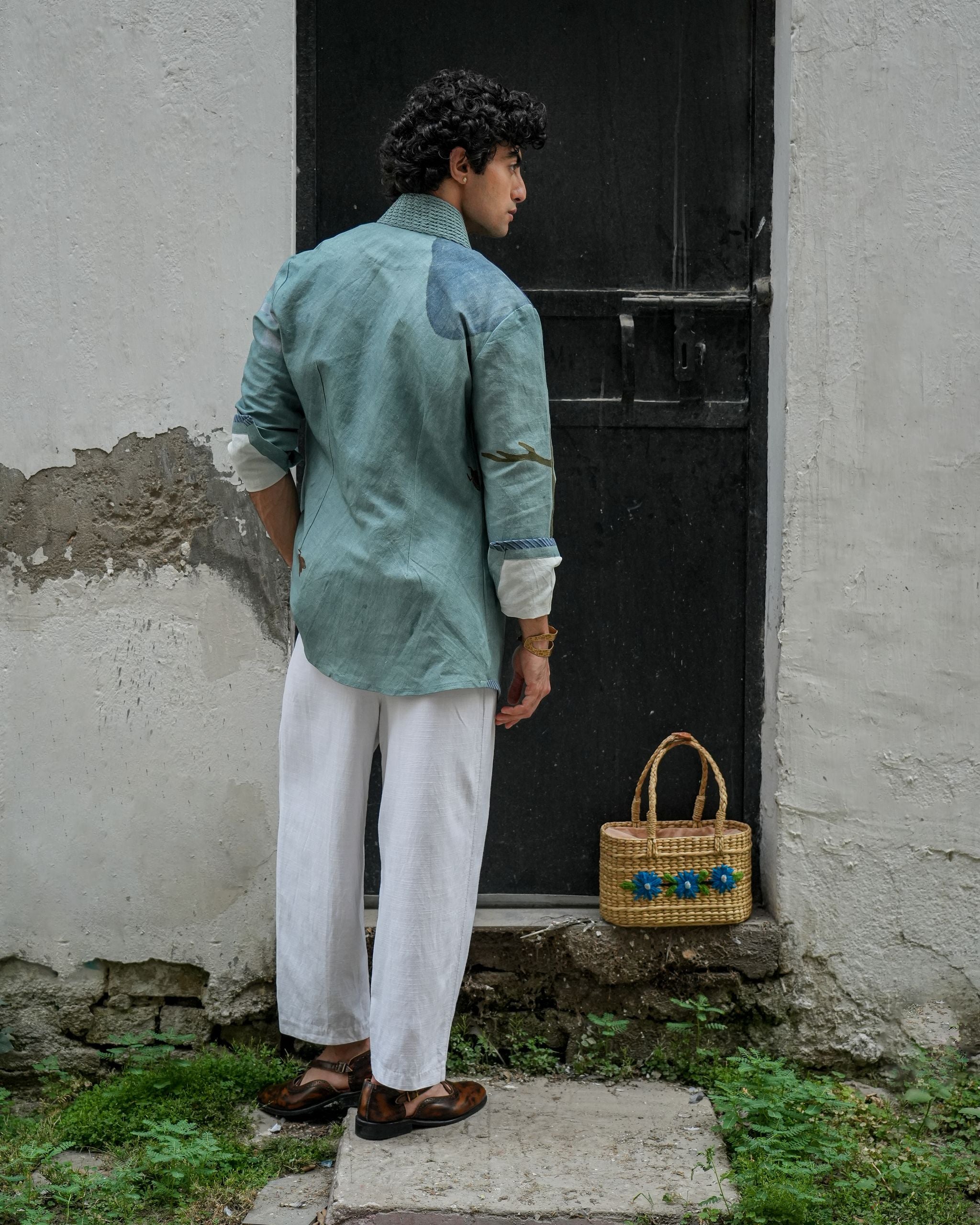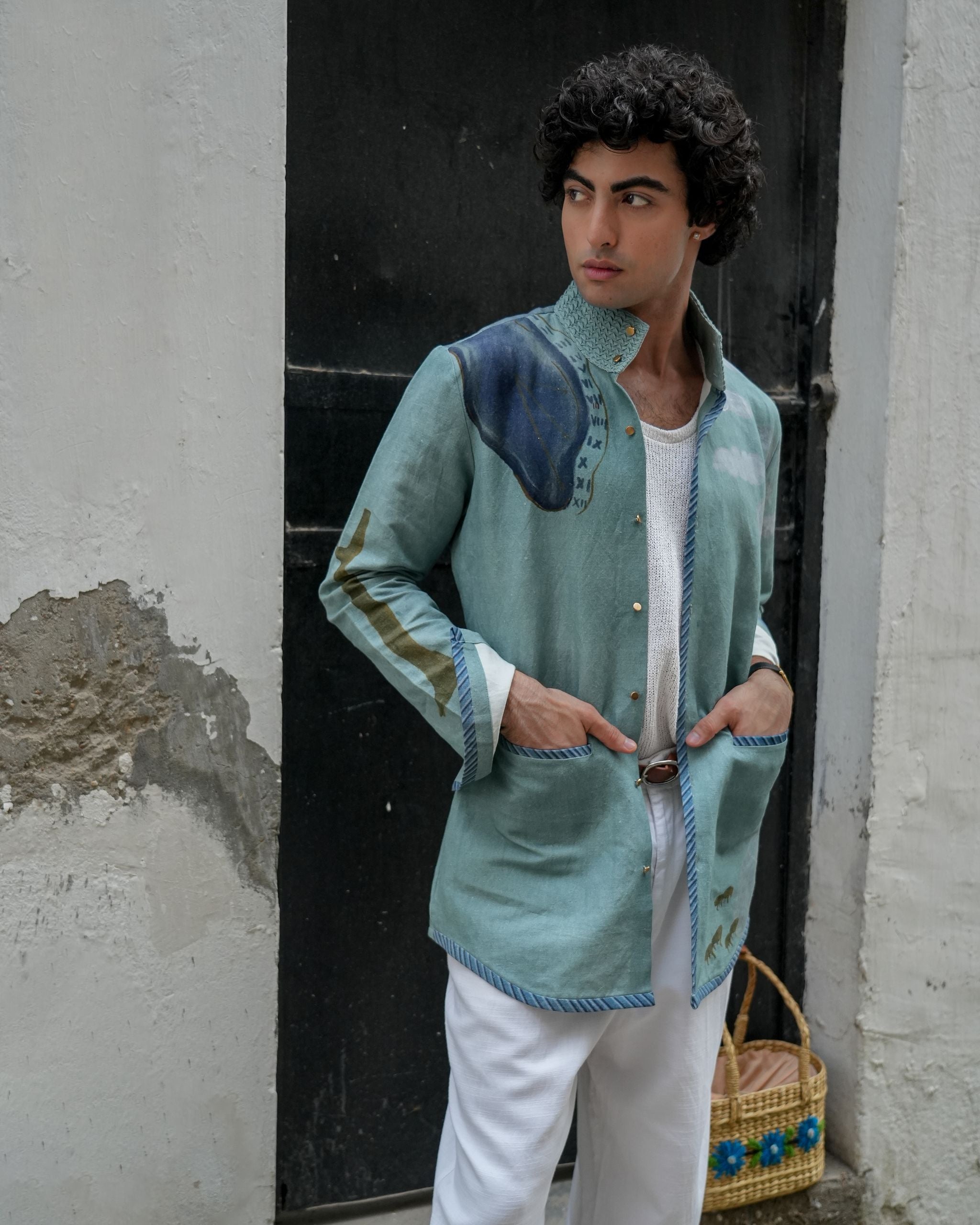 Introducing The Holiday Overshirt Set in our Chateau Grey color, crafted in cotton linen fabric with a unique abstract placement pattern, never seen before at JMC. Paired with a matching cotton linen Ivory Joggers