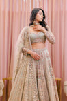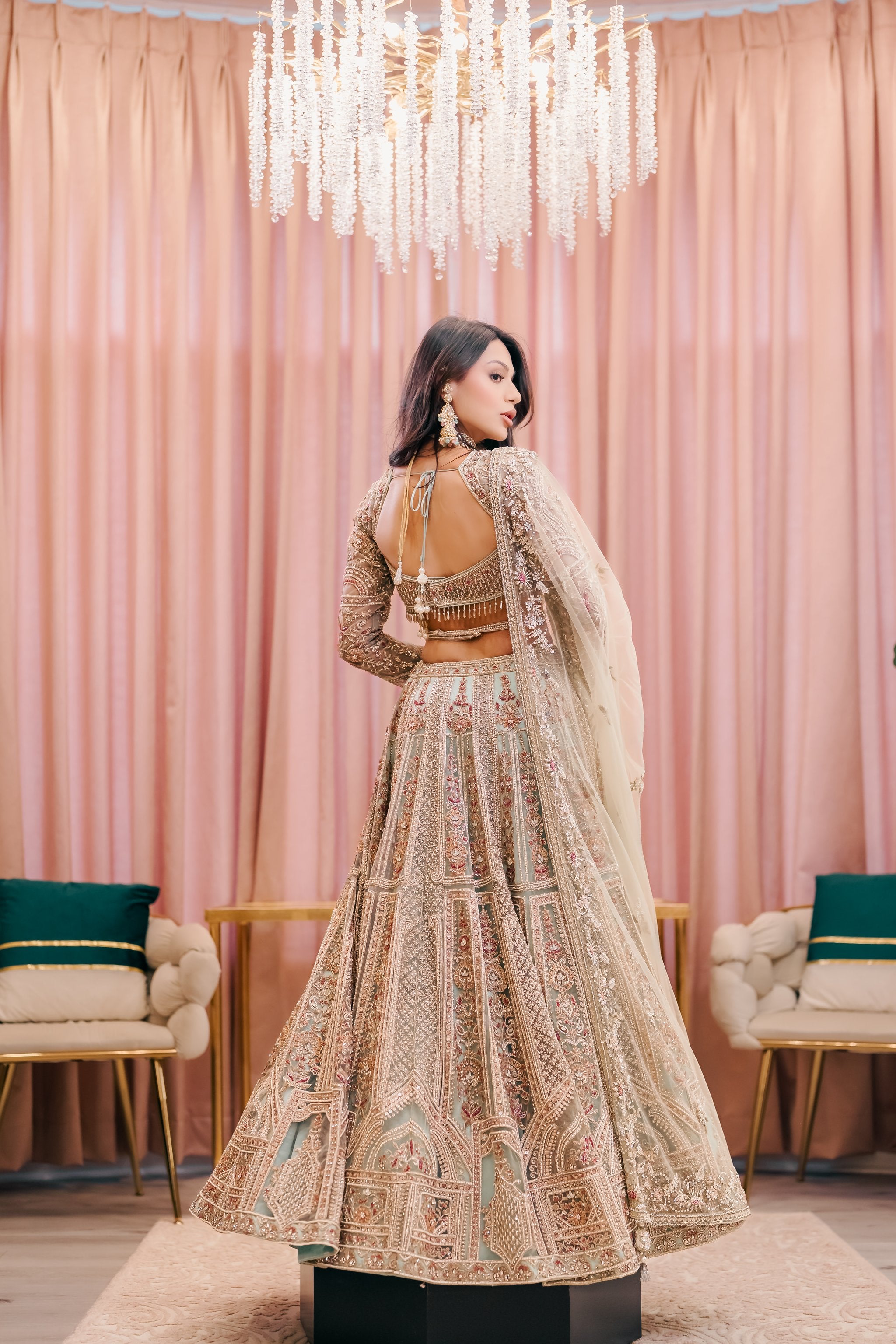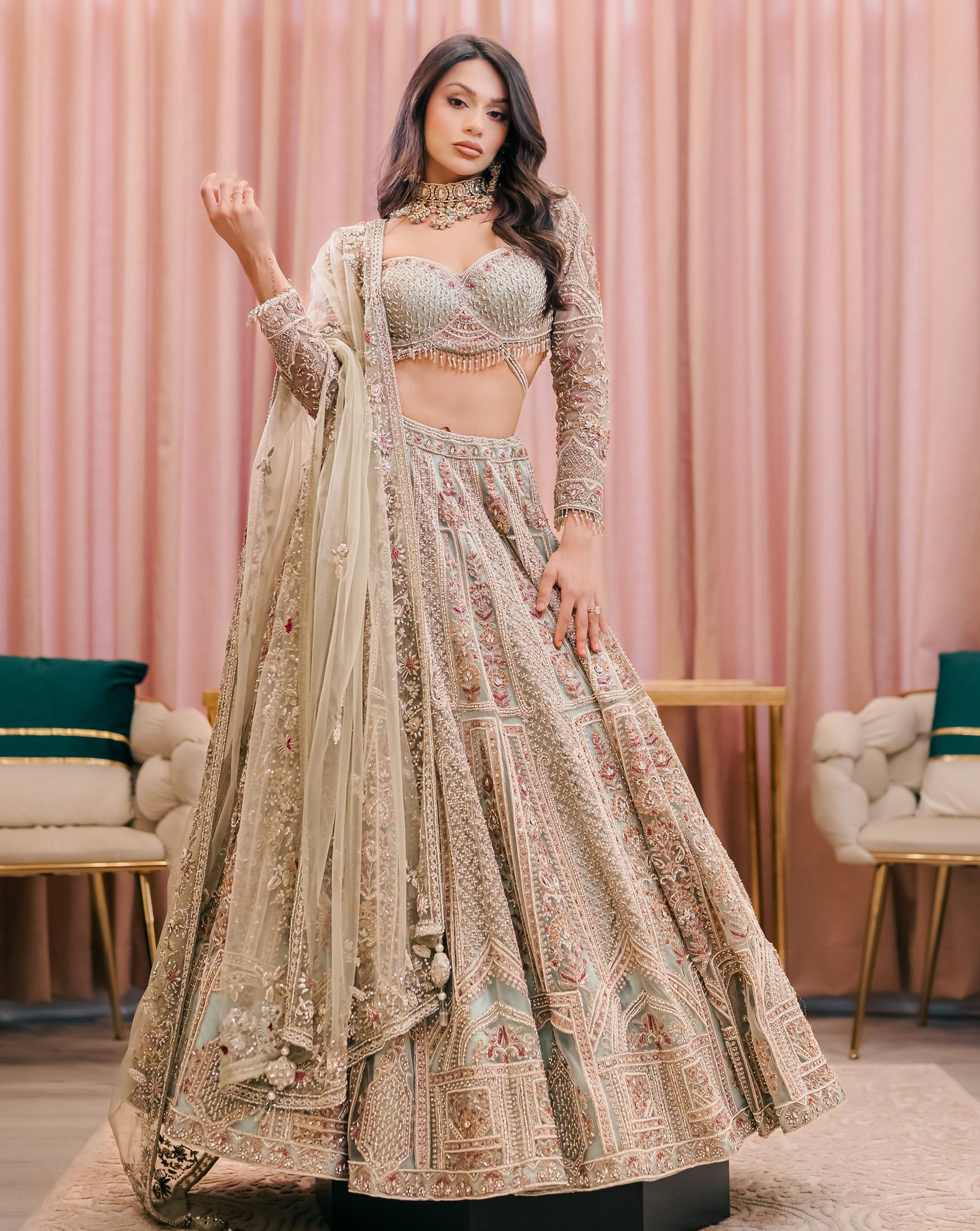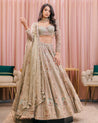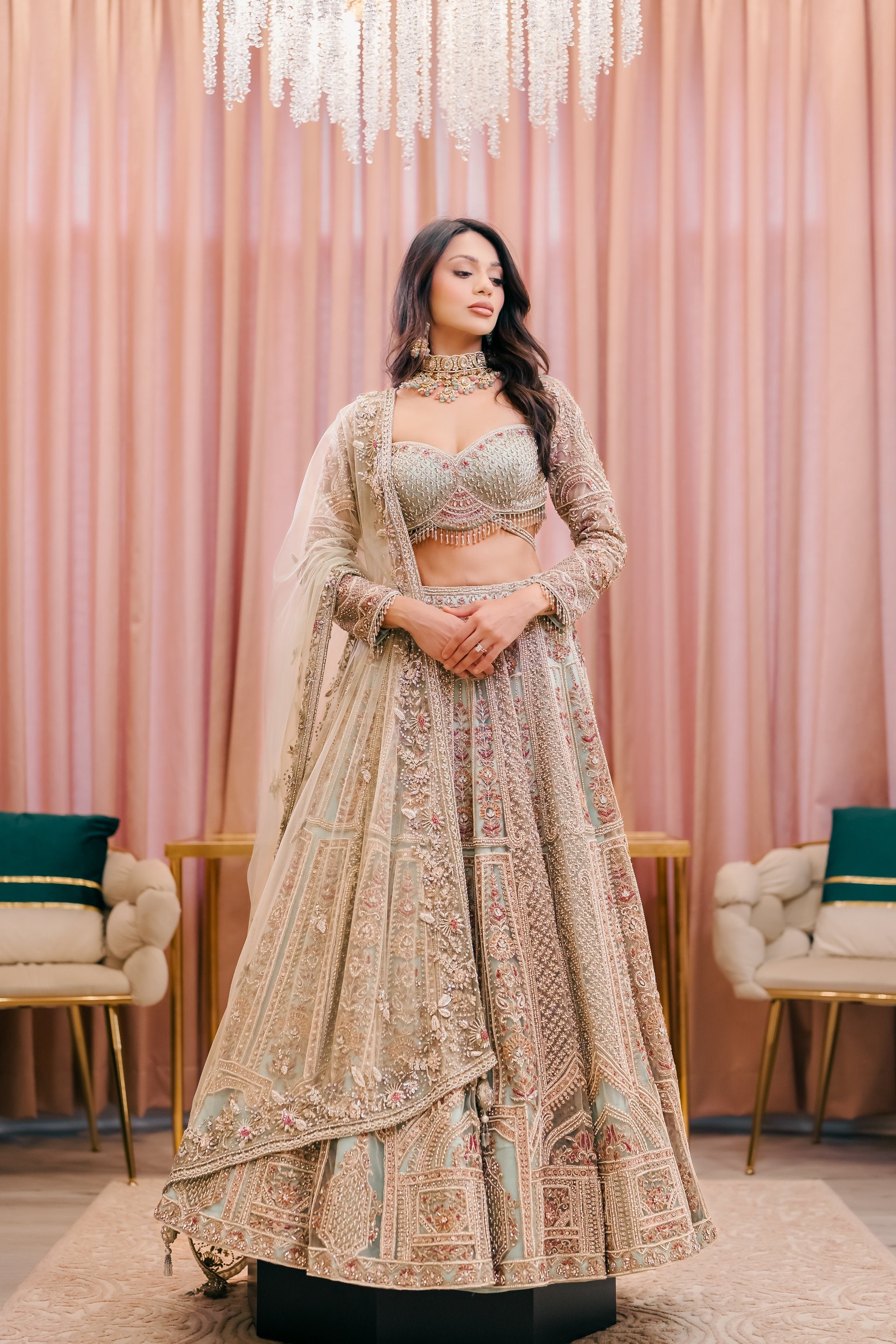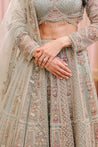 Chloe is a sage green lehenga set embroidered with colorful threads, sequins and beads. The full sleeve blouse has belt detailing and beautiful tassels. The net dupatta is embroidered on all four sides.