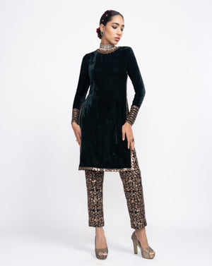 Well-fitted velvet kurta paired with hand embroidered velvet trousers.