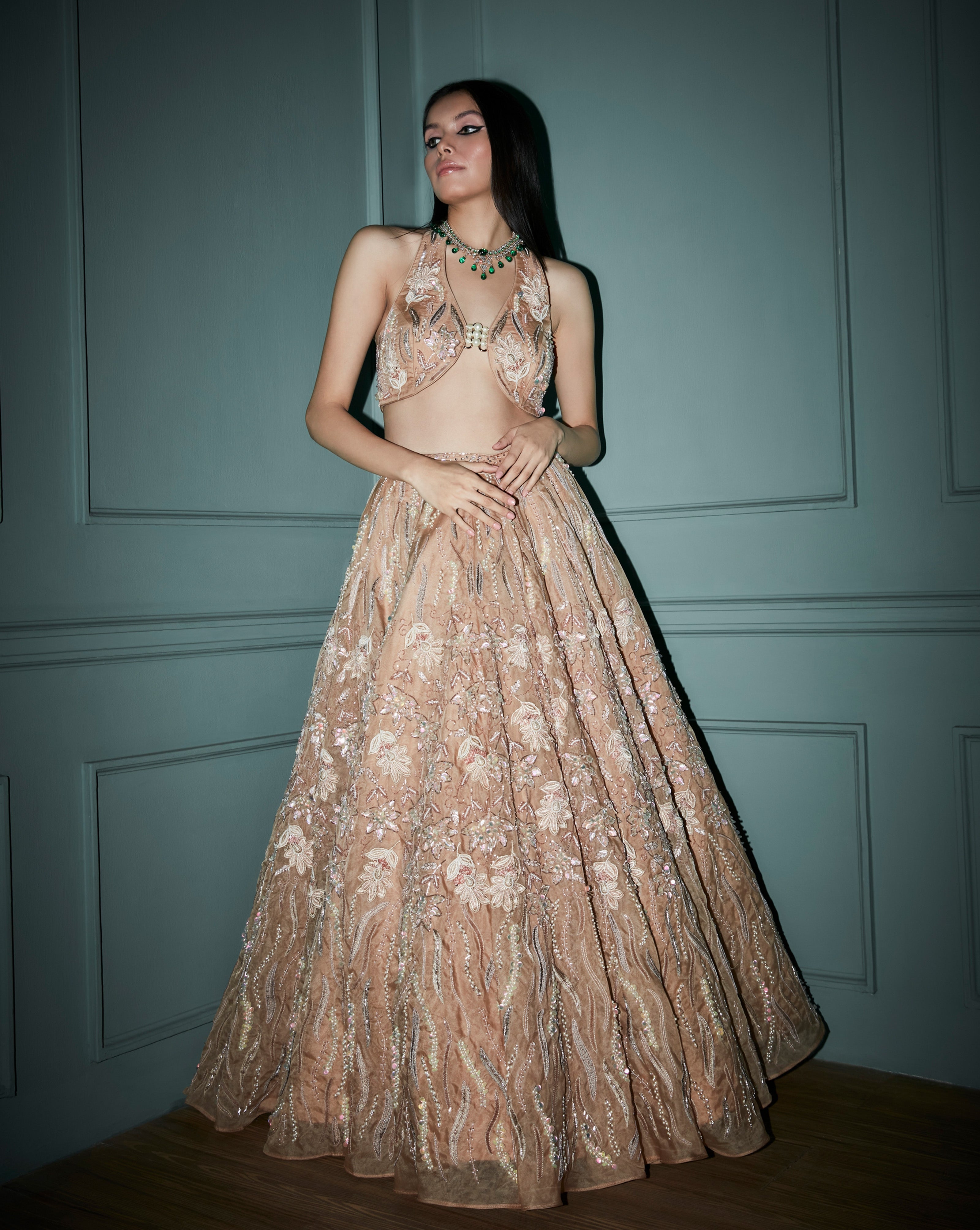 Desert dust lehenga set with floral patch embroidery embellished with cutdana and sequins. The intricate fancy work graces the set, creating a mesmerizing play of textures. The blouse is a true statement piece, featuring a butterfly patch at the back.