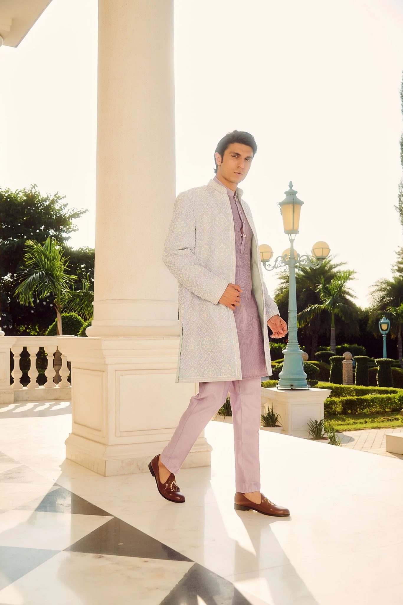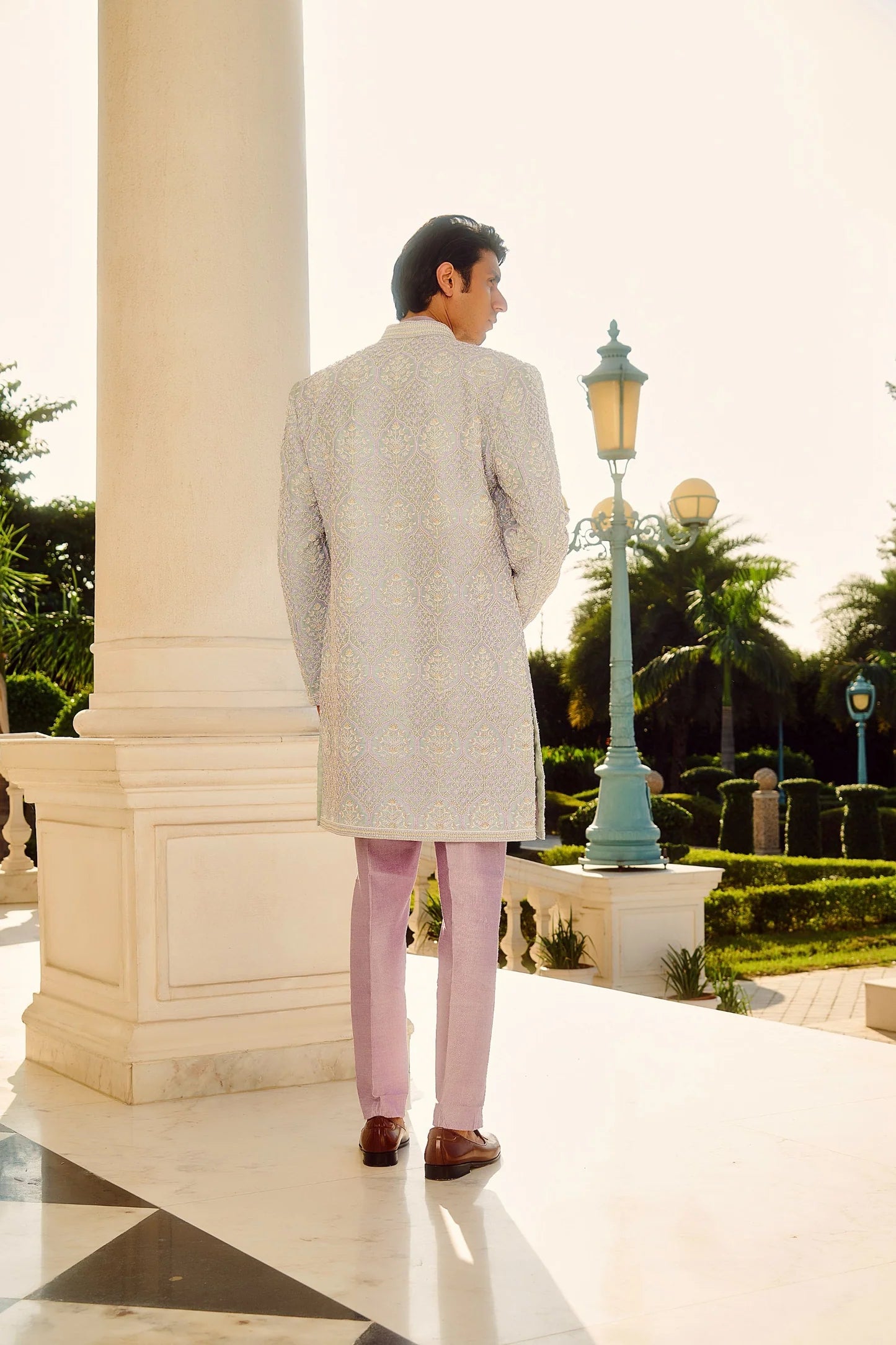 Introducing the Emery Sherwani from our Naayab collection. This opulent sherwani is adorned with delicate hand-embroidered glass beads, pearls, crystals, cut dana, and sequins. Soft hints of pink add a subtle charm, creating a harmonious blend of elegance and refinement. A true masterpiece for those with a discerning eye for detail.