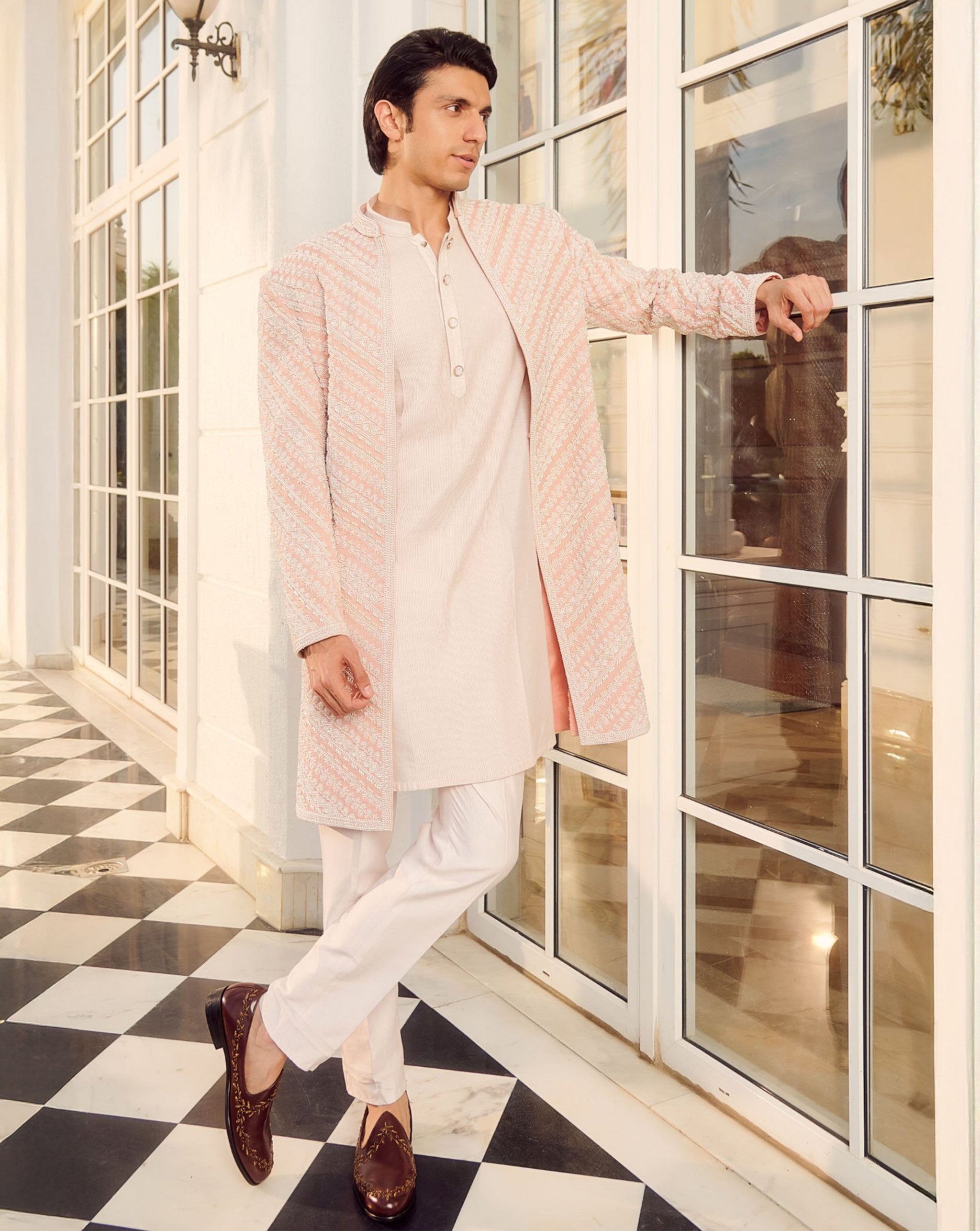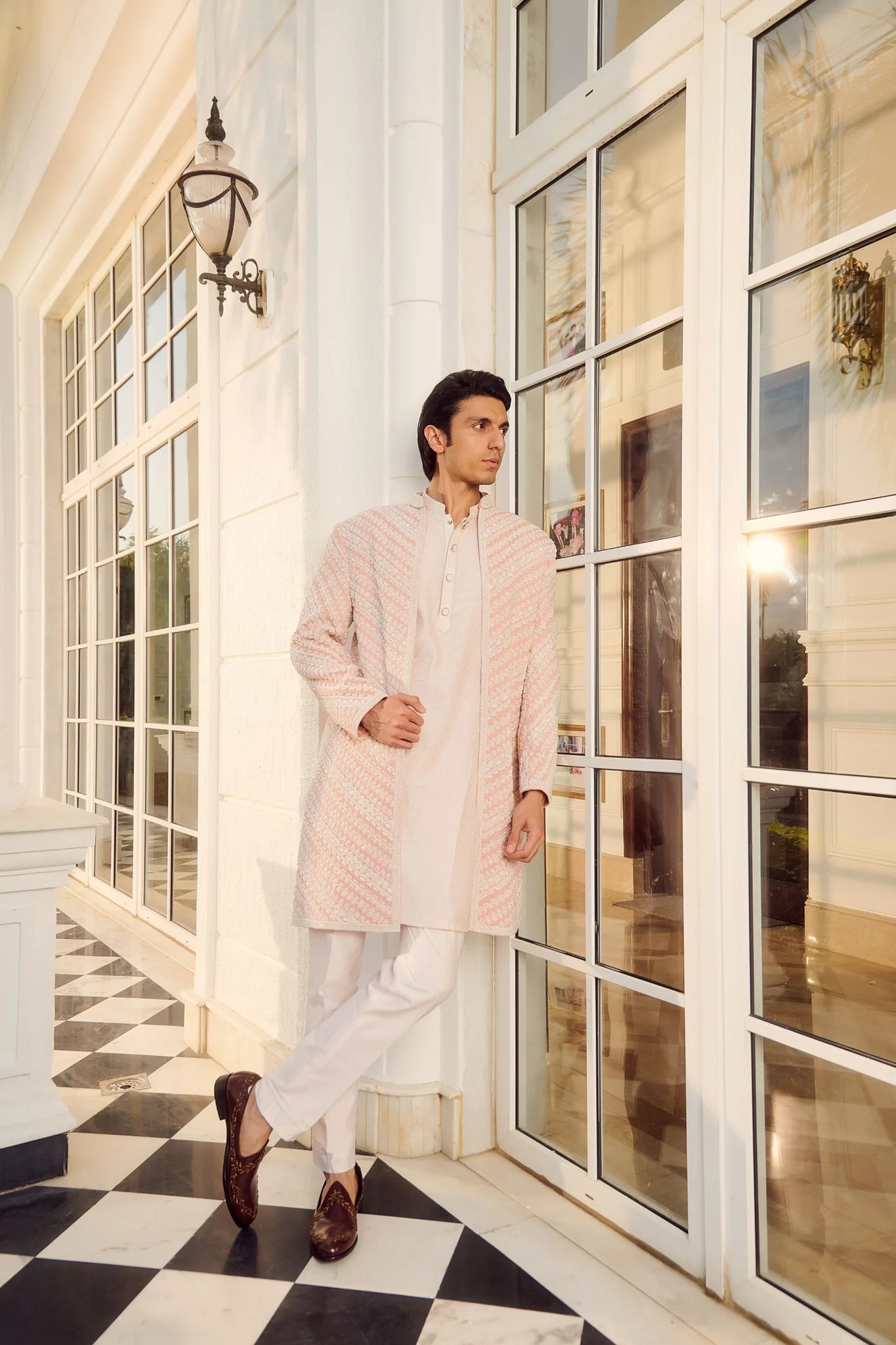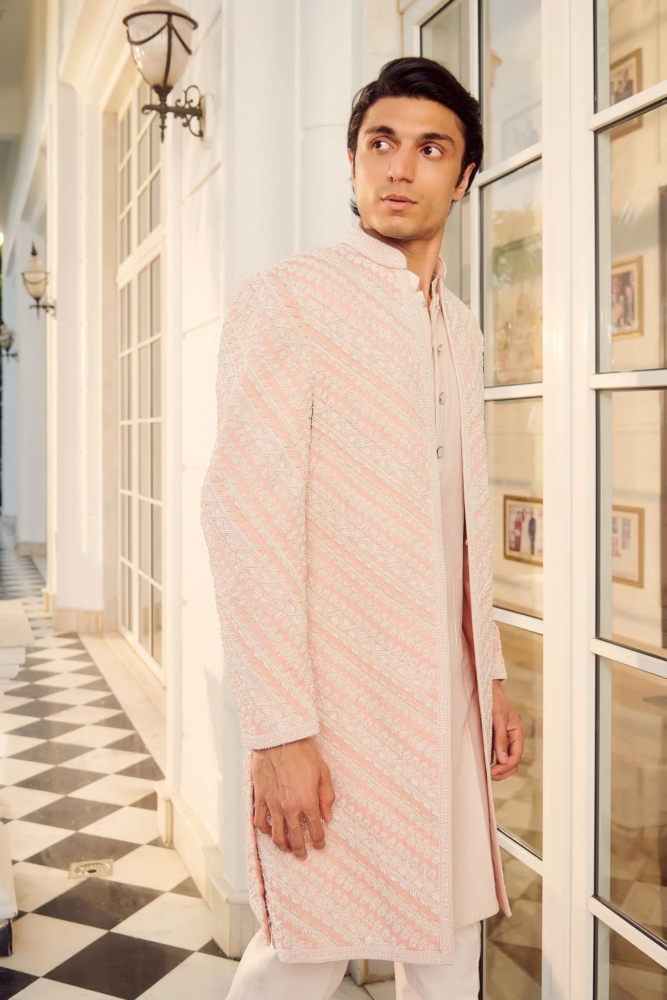 Introducing the Estelle Sherwani from our Marjorie collection. This elegant sherwani, in a soft caramel hue, is intricately embellished with delicate hand-embroidered glass beads, crystals, cut dana, and sequins. A stunning combination of subtlety and sophistication, perfect for those who appreciate refined craftsmanship.
