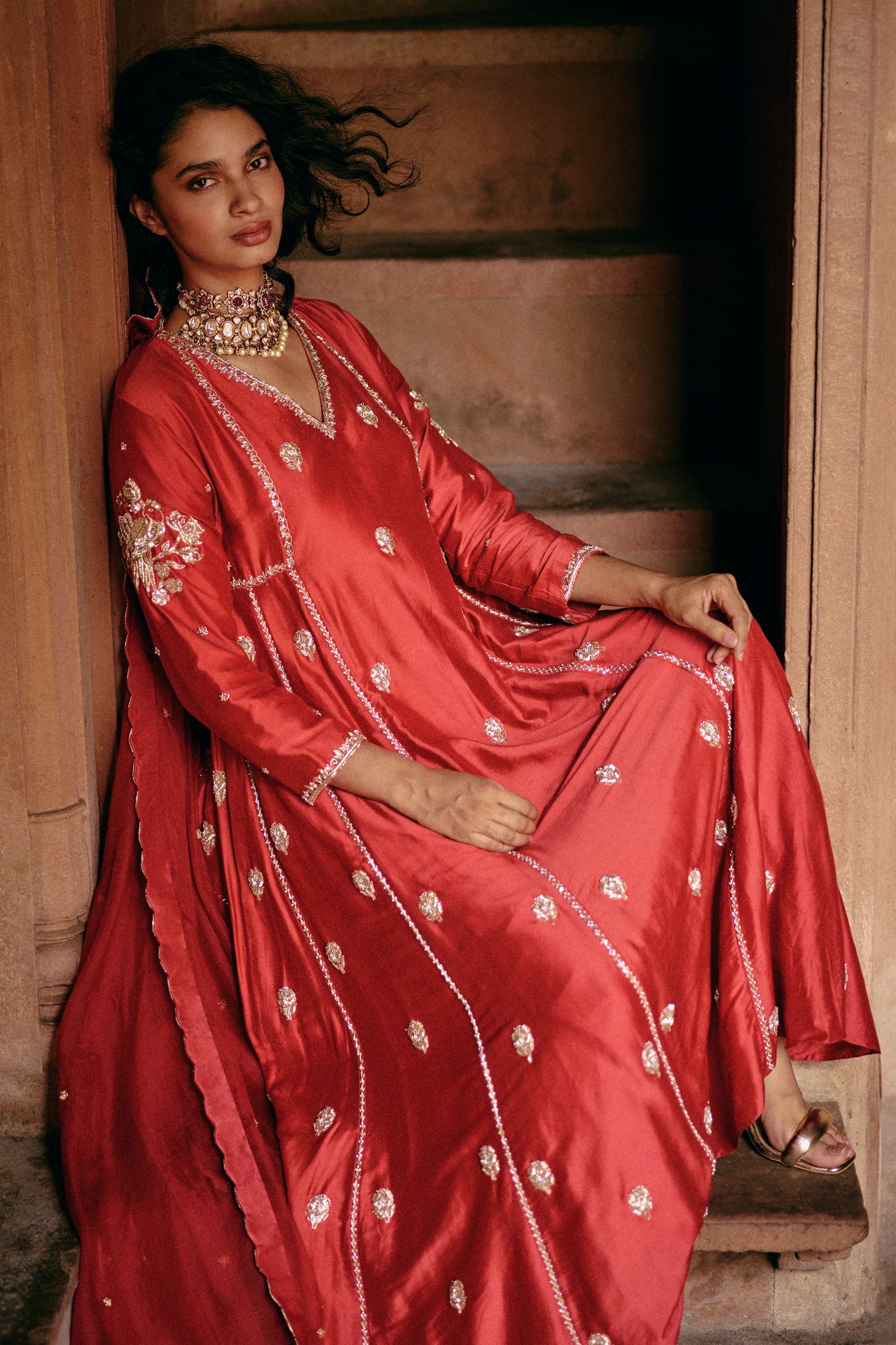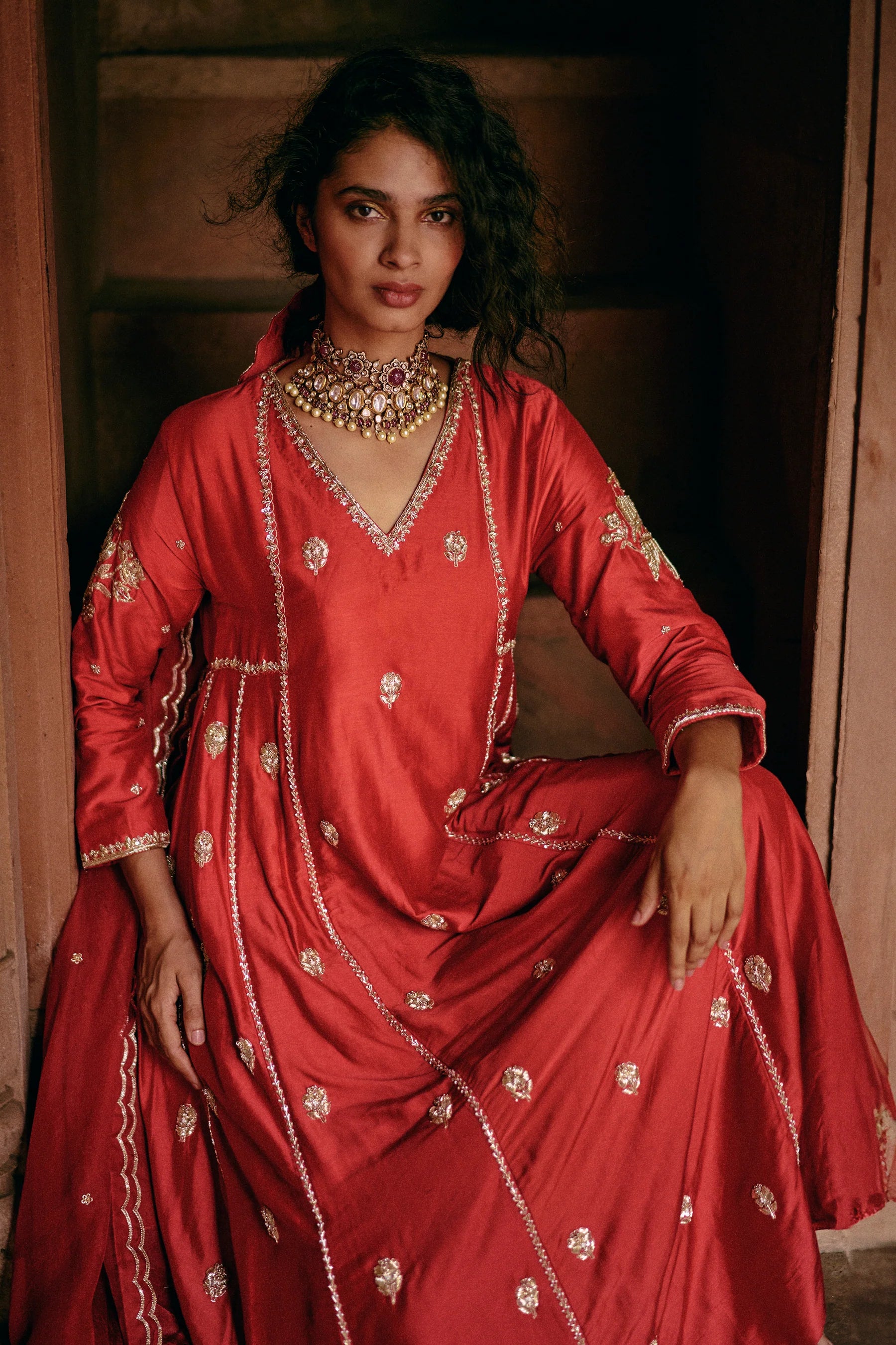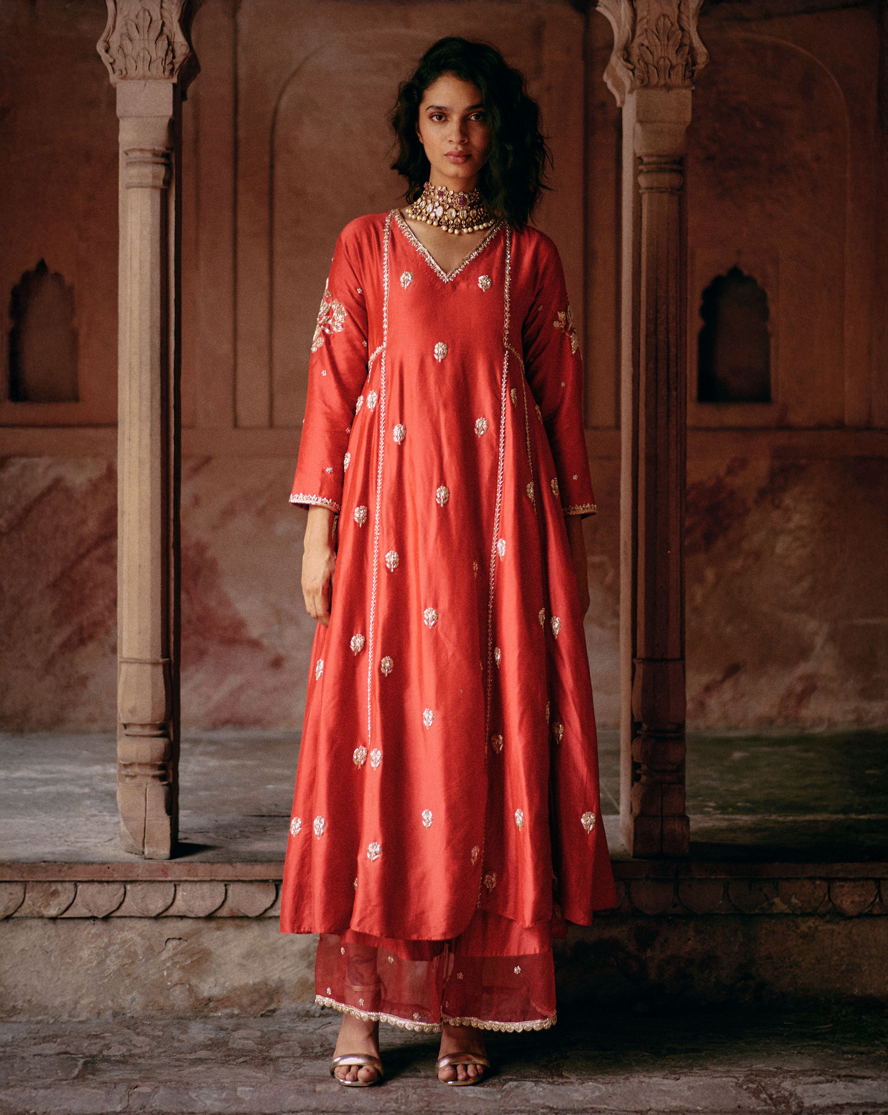 A hand-embroidered anarkali in delicate all-over buttis and our signature Roop flip birds, on the sleeves. It is paired with pants hand-embroidered with lace and buttis, with organza panels and an organza dupatta with hand-embroidered buttis and scallops.