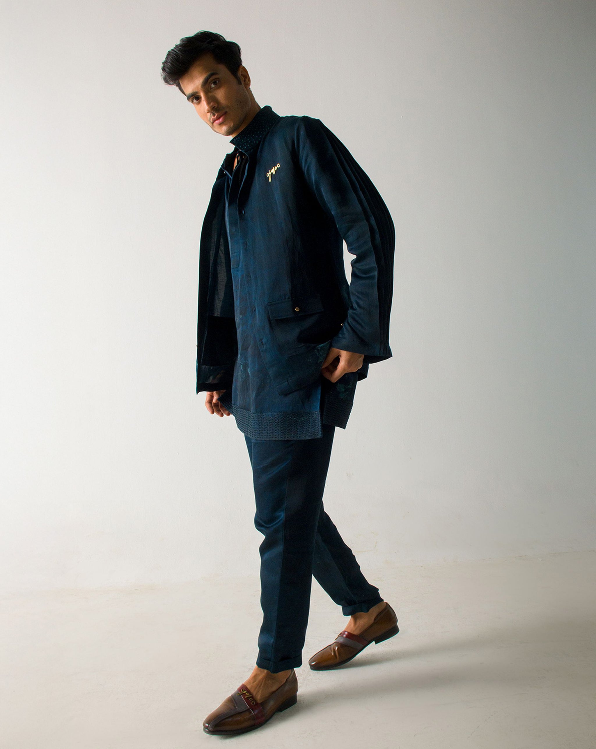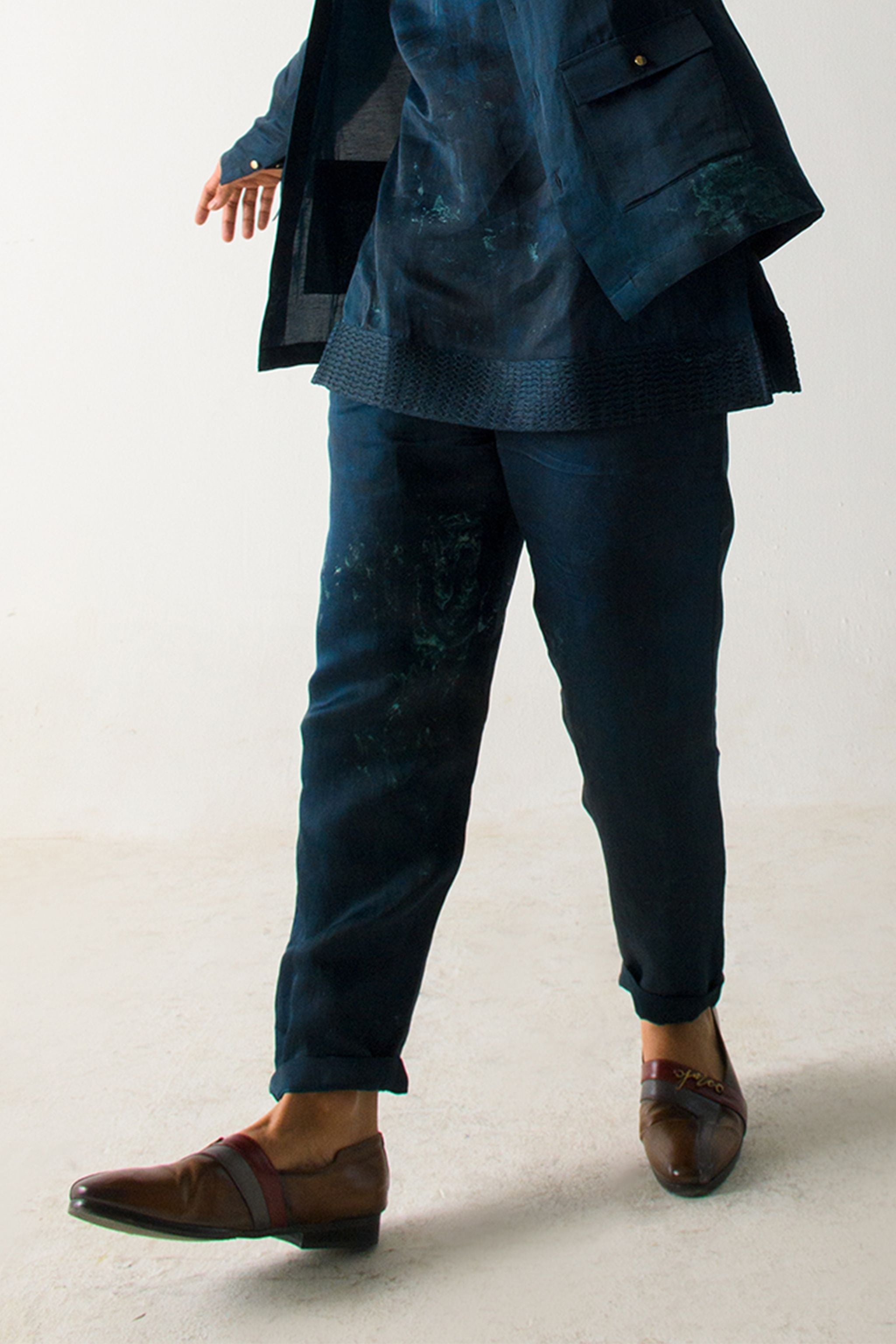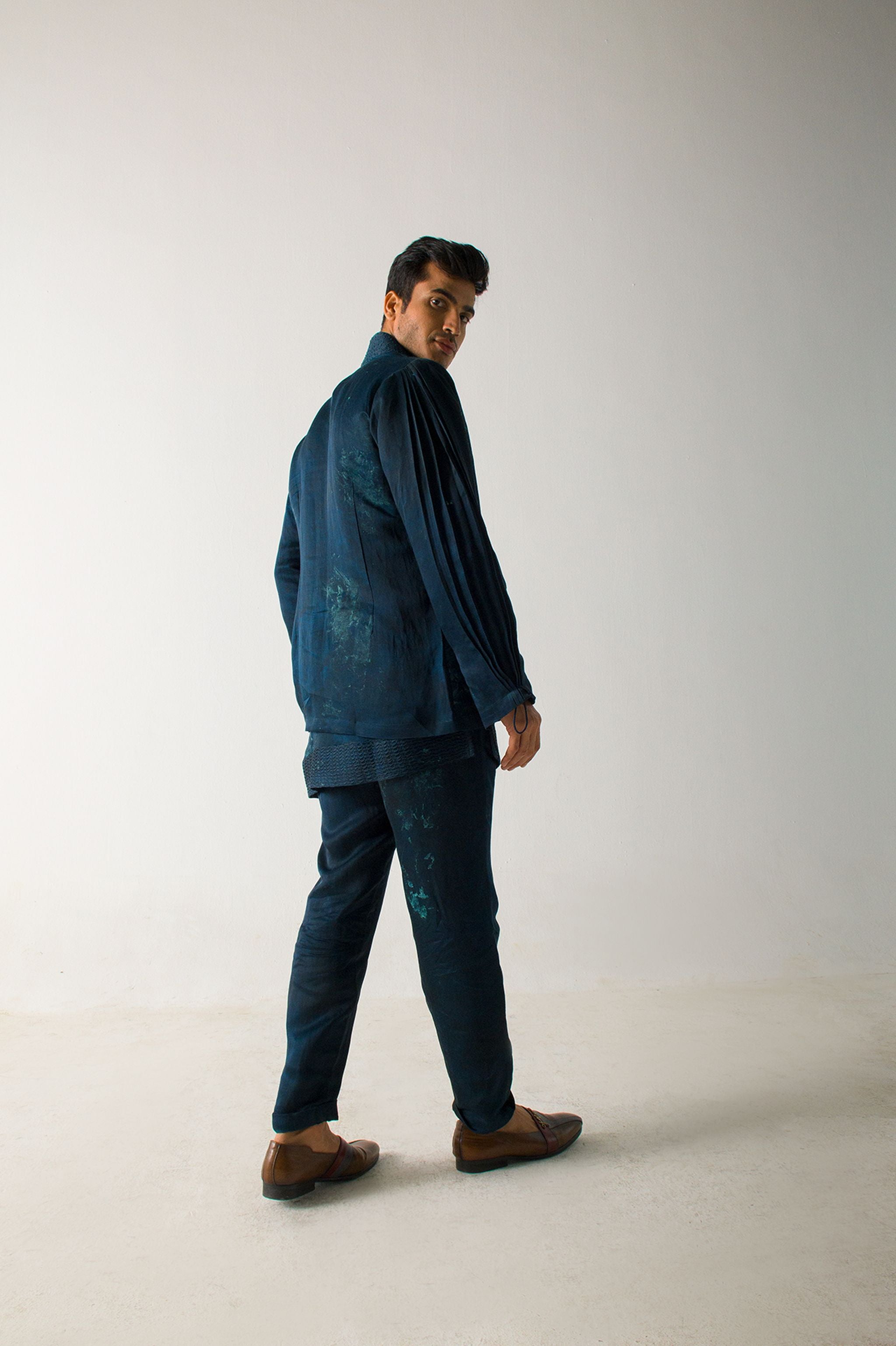 Featuring A Marble Dyed Short Jacket In Peacock Green Colour With Pleated Sleeves Detailing. Paired With A Marble Dyed Short Kurta And Paper Bag Trousers.