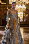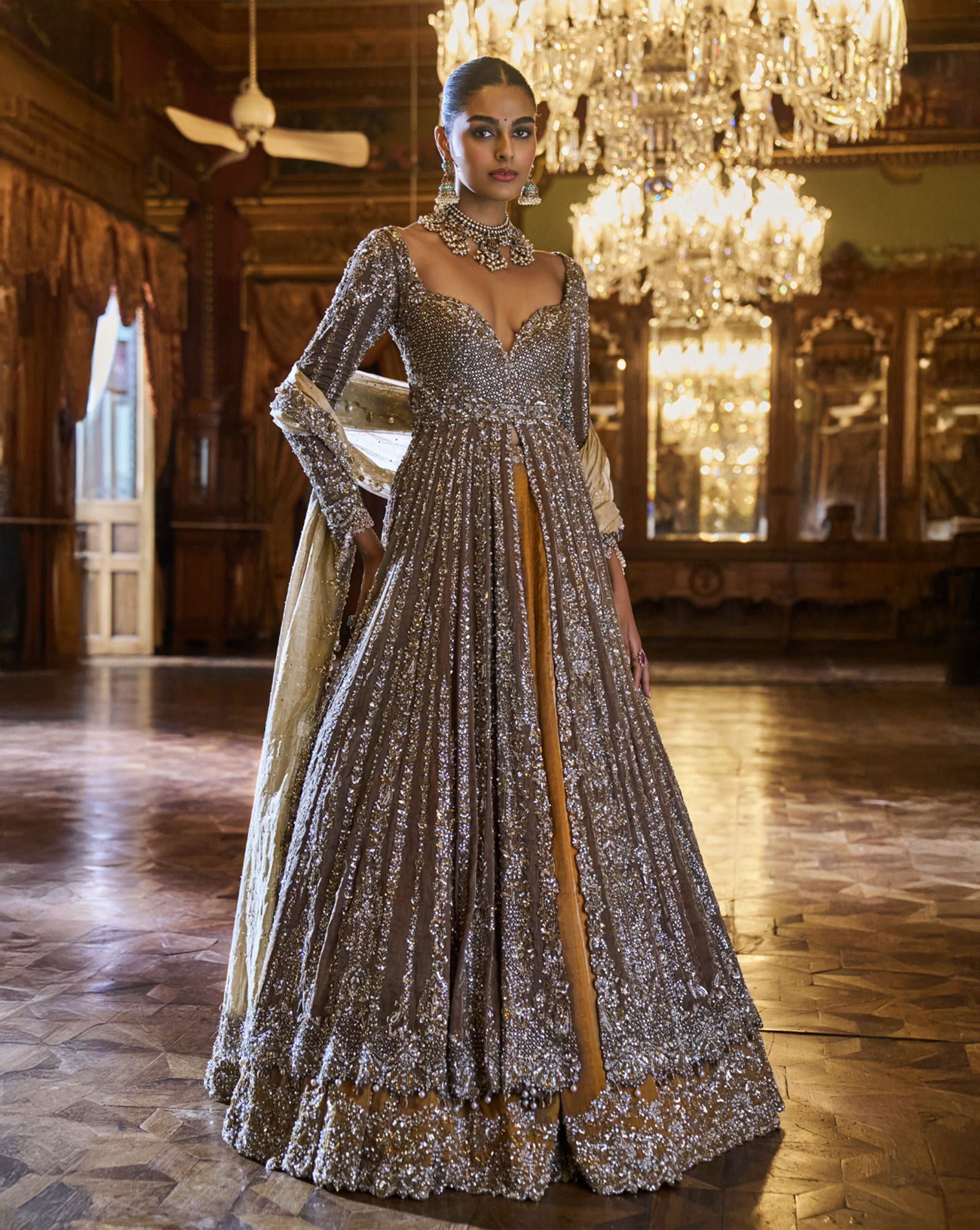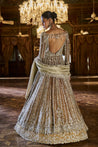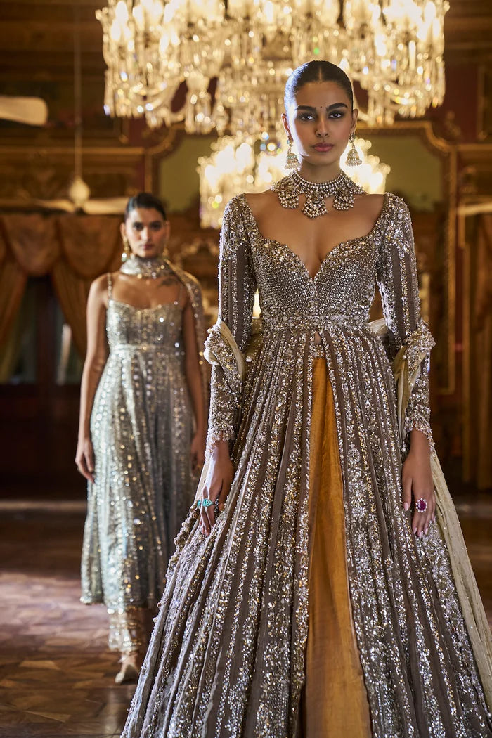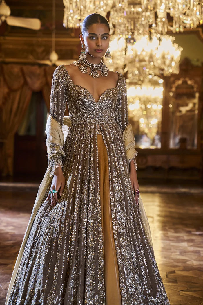 This set features a coffee brown jacket in tissue silk with delicate embroidery with bugle beads, sequin and crystal. The lehenga is in contrasting deep mustard lehenga has a broad border at the bottom. The slate tissue dupatta has a cut work border on all four sides