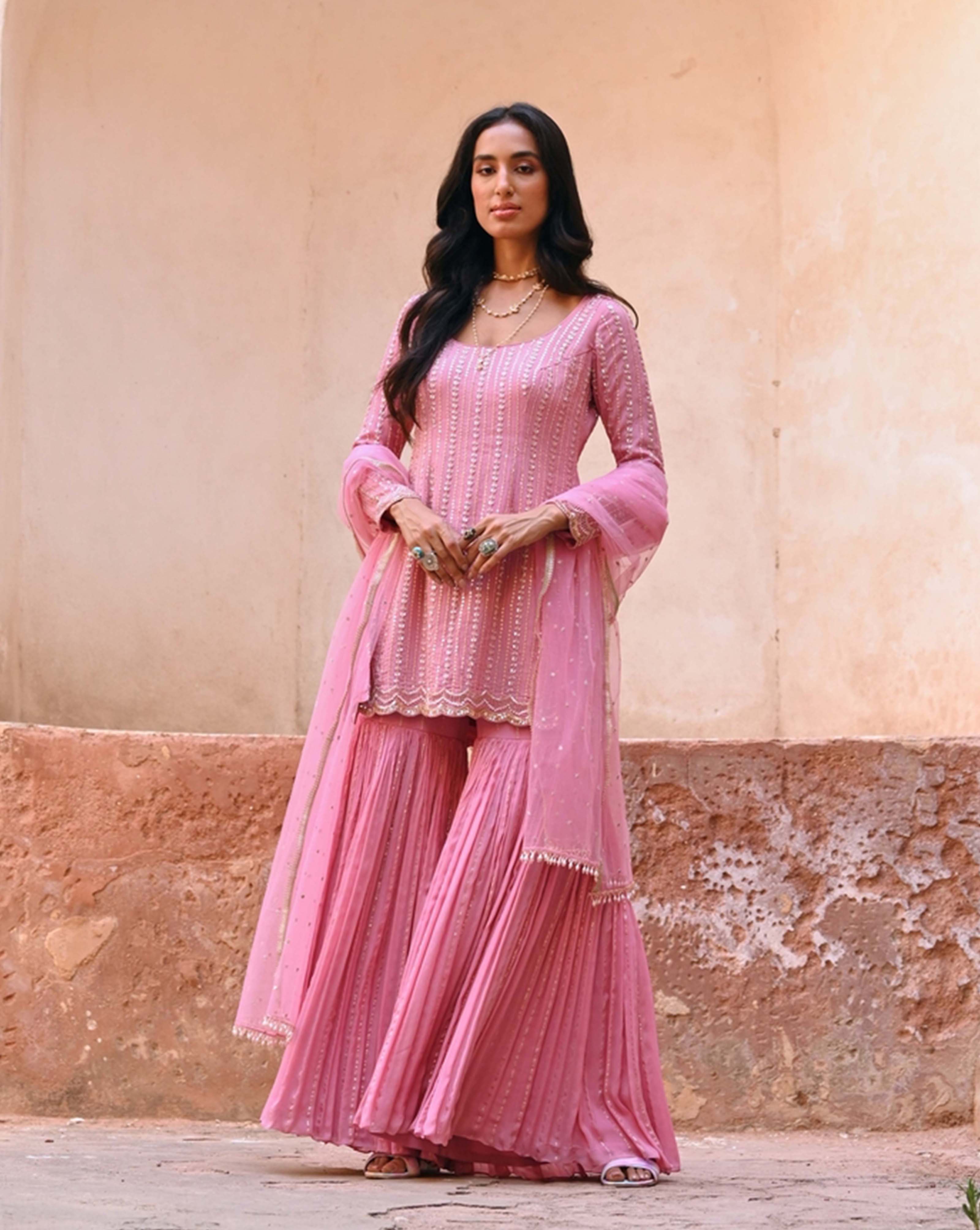 Crepe kurta with glass beads and zardozi embroidery paired with flared pants and tulle dupatta