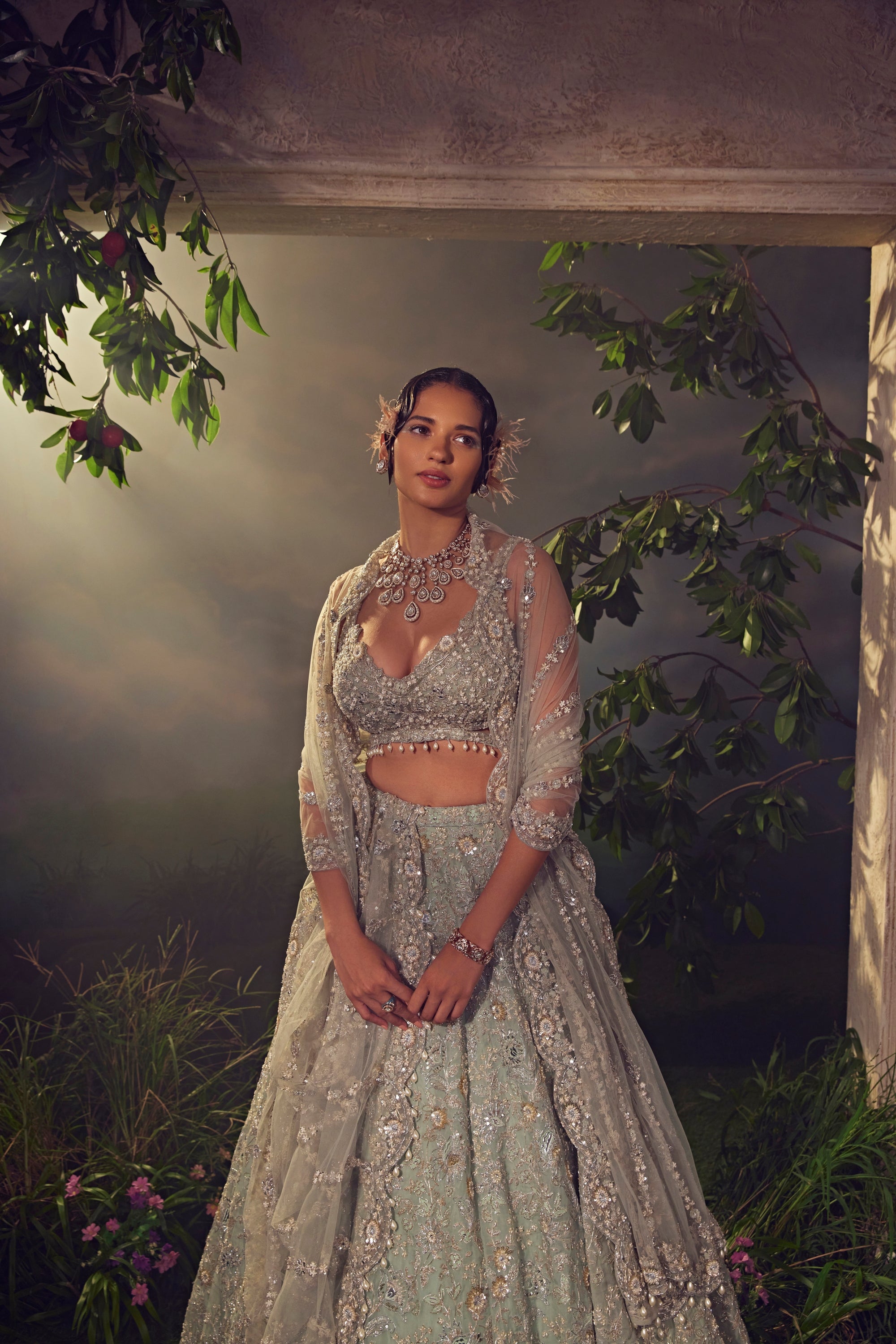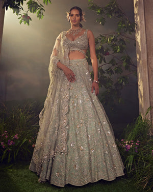 Featuring a jade green organza lehenga embellished with Japanese bugle beads, pearls, sequences and dori embroidary. Paired with a linear jaal embroidered dupatta and a stylised blouse accentuated with pearl drops