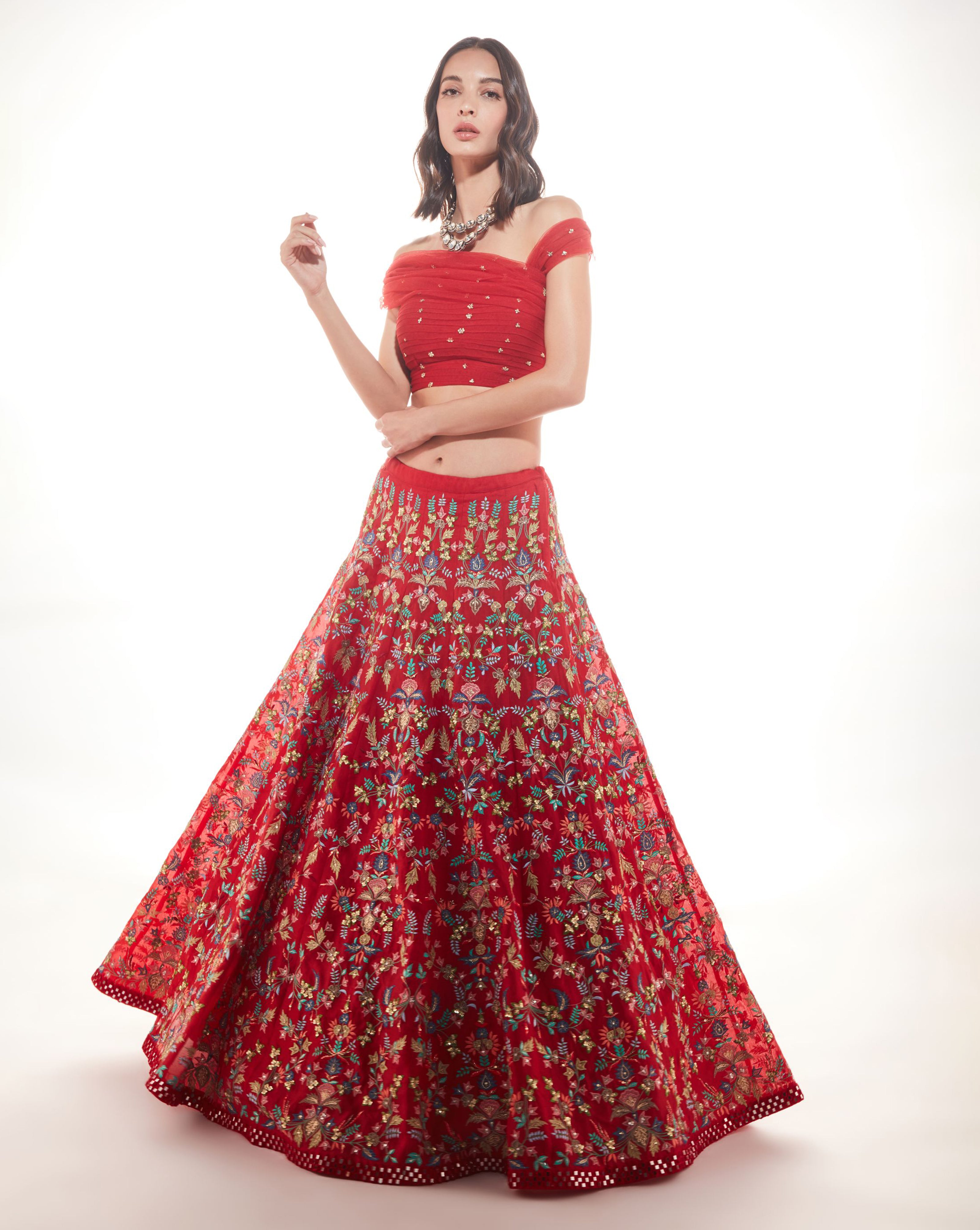 A multi-hued organza lehenga with resham and appliqué work, paired with a net rushed top