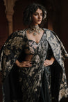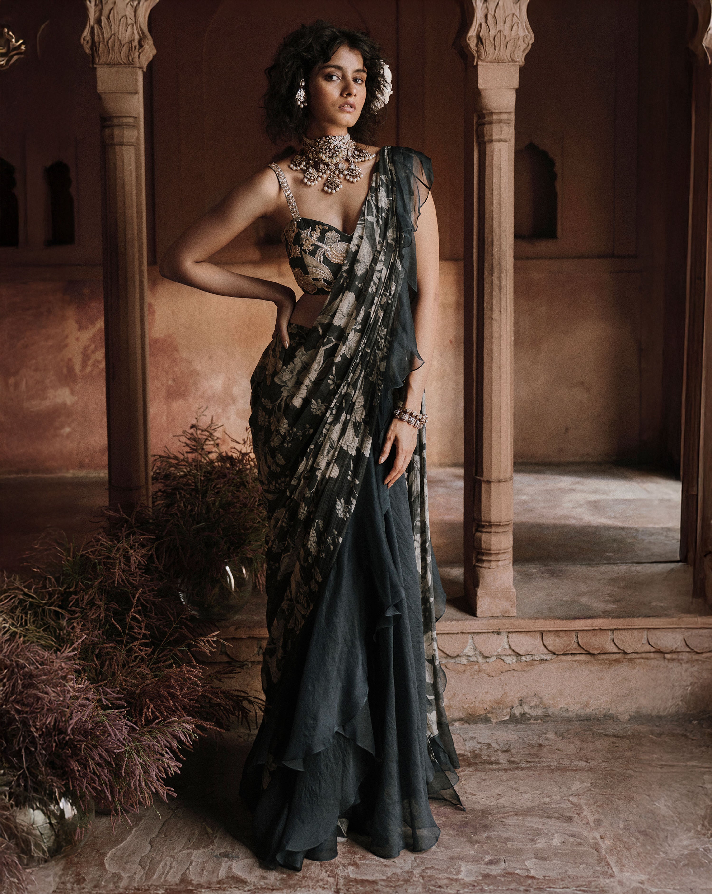 A navy blue pre-stitched saree set that evokes the charm of a bygone era. The romantic saree features our signature Roop flip bird print, featuring a pair of birds in their enchanting habitat with hand-embroidery highlights on the pallu. It is paired with a hand-embroidered blouse that elevates the look. The look can also be paired with our delicate printed hand-embroidered silk jacket