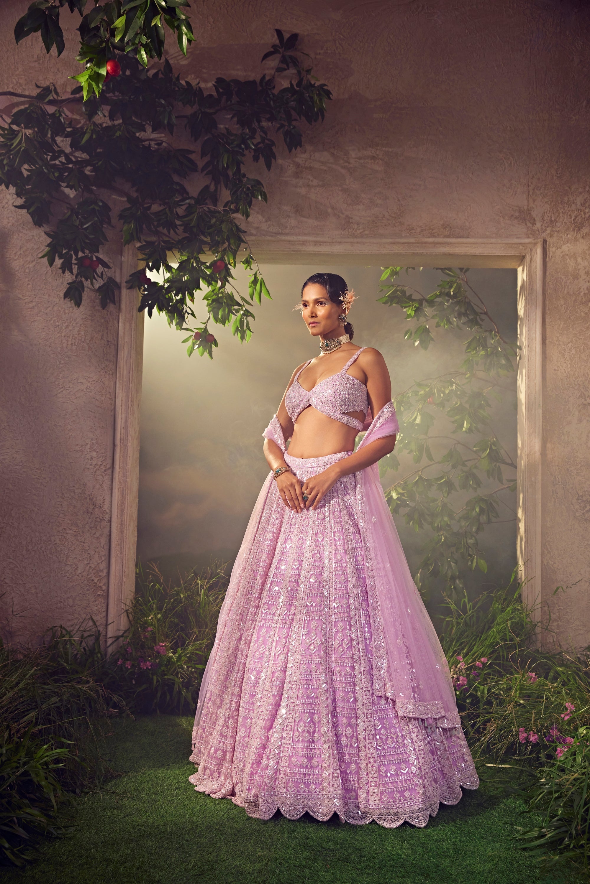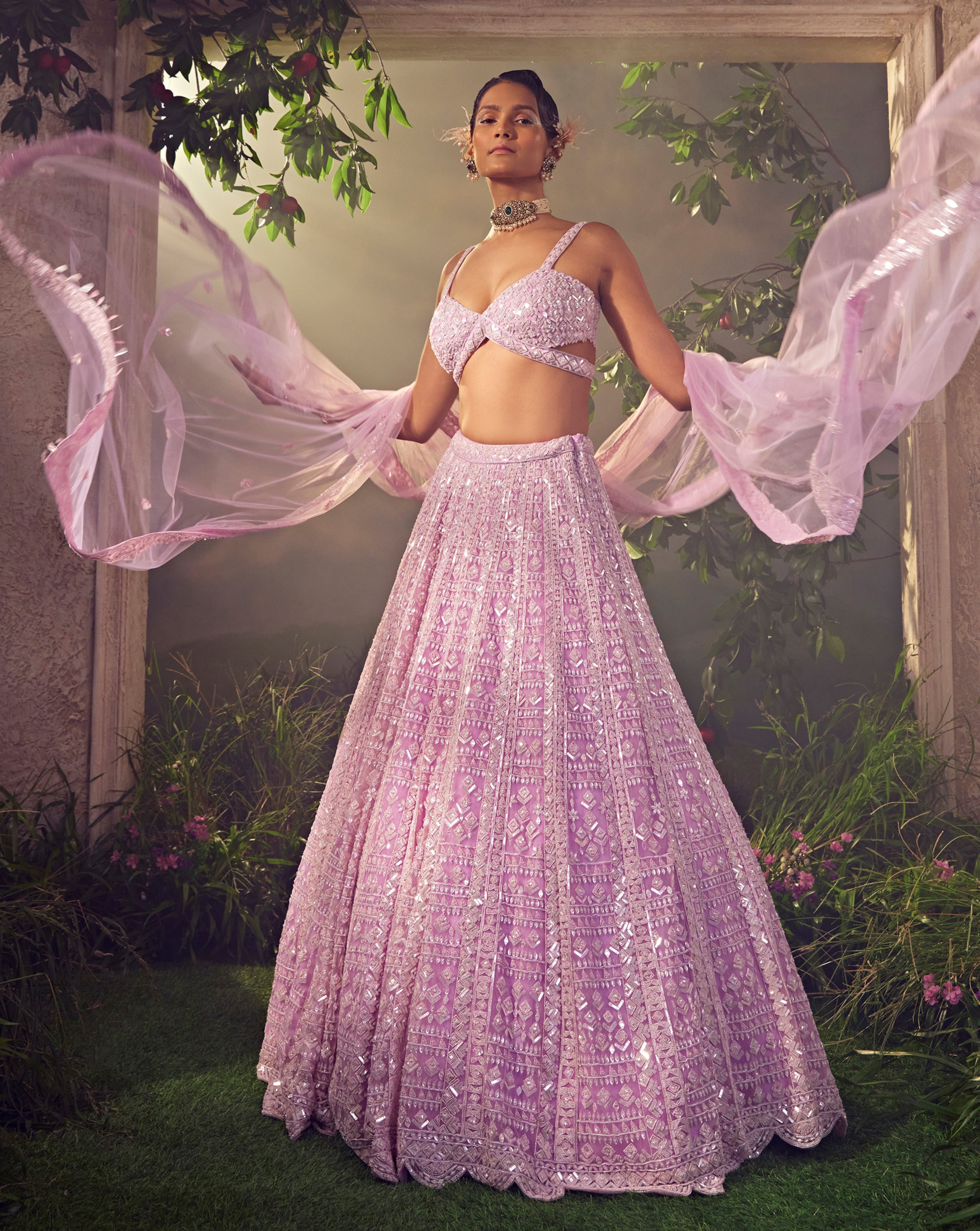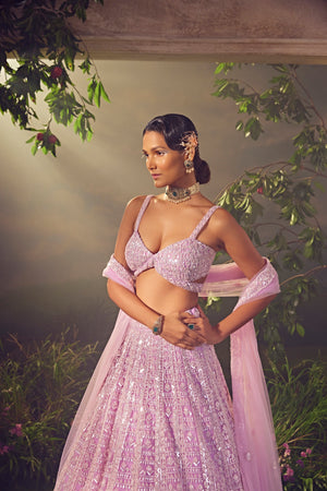 Featuring a lavender tulle lehenga embroidered fully by hand with various ornamental sequences and Japanese bugle beads. It is paired with a scallop dupatta and a stylised blouse .