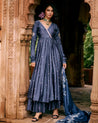 An elegant modal silk anarkali featuring hand-embroidered zardozi and pita work buttis all over. It is paired with a hand-embroidered skirt and our signature Roop flip bird printed hand-embroidered dupatta.