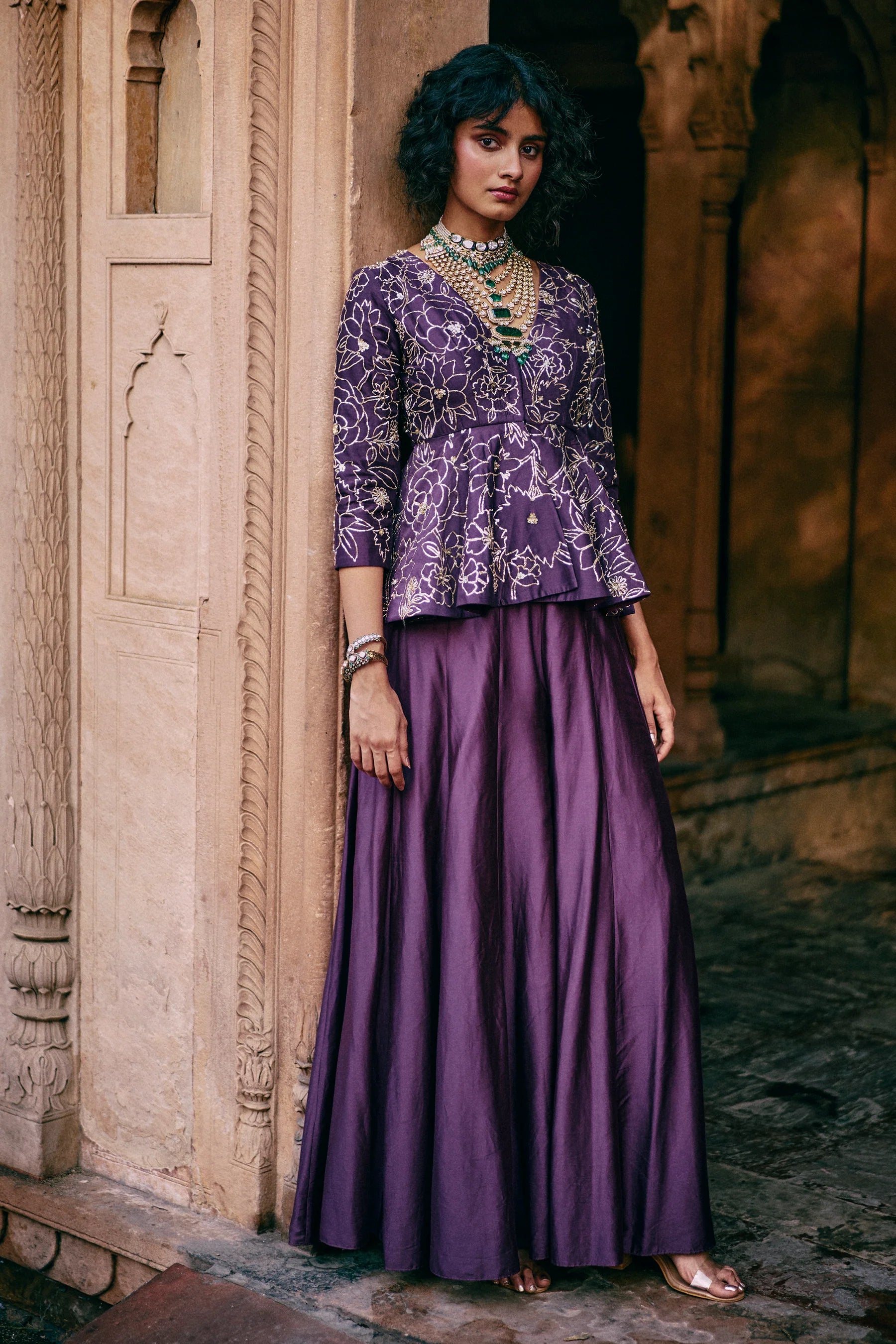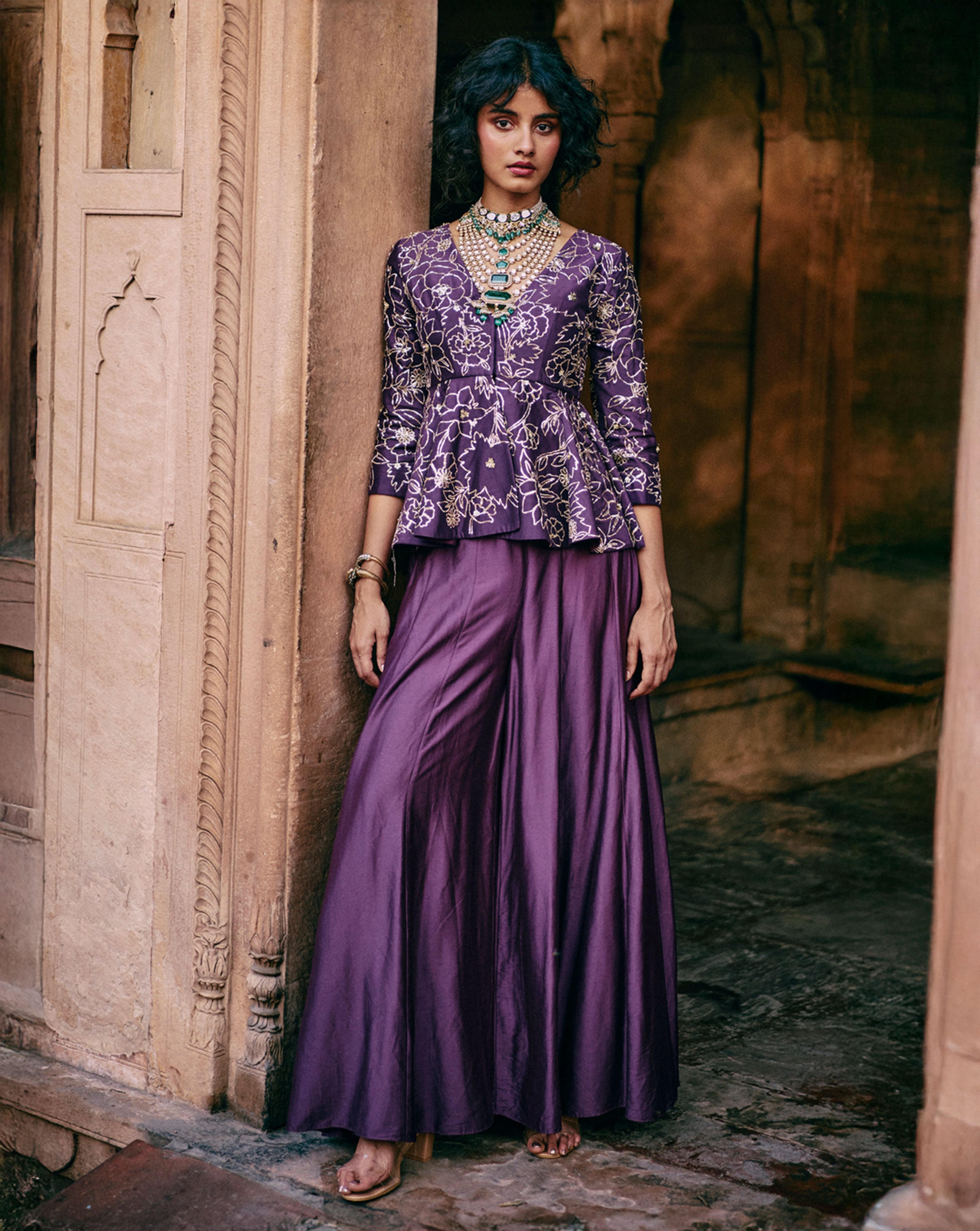 A plum vintage style peplum, evoking an old world charm in delicate pita hand-embroidery in floral motifs, paired with solid palazzos.