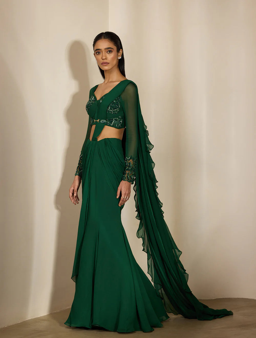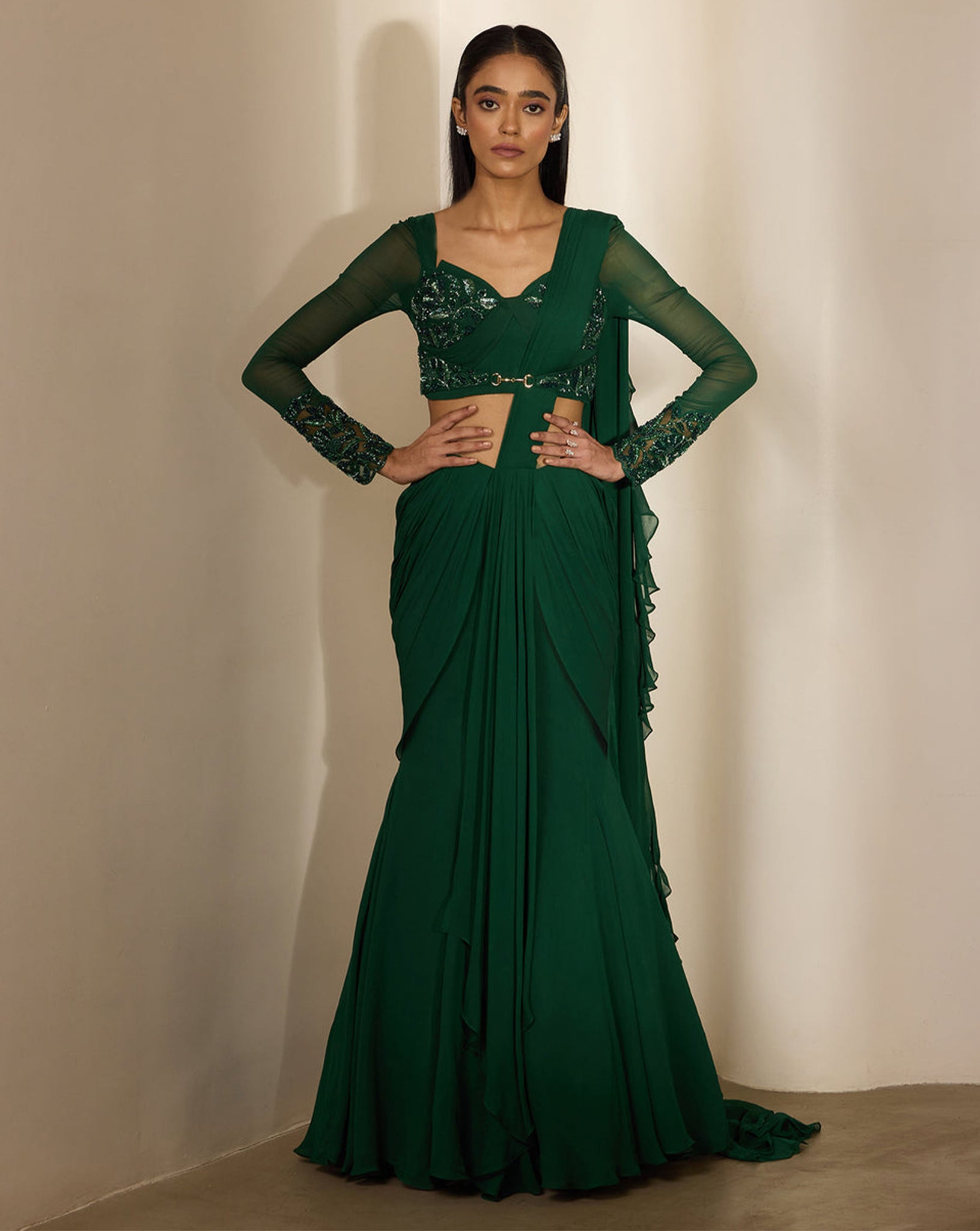 Emerald green fishtail sari paired with a concept corset blouse with full sleeves - with placement tonal fan flower hand embroidery.