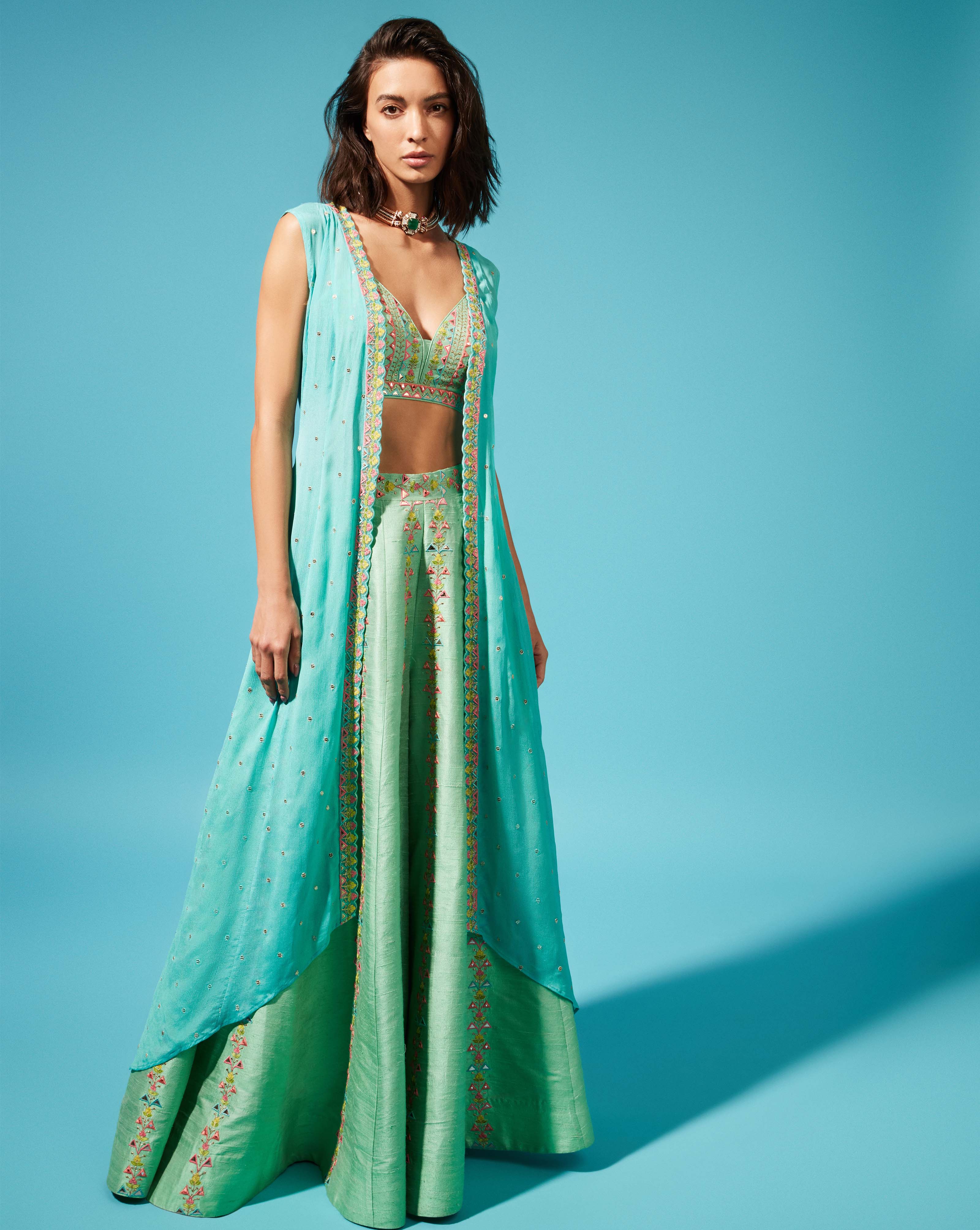 One of our favorites, the Maria outfit features silk palazzo pants and bustier, embroidered with delicate thread and mirrors. Complete this look with a mirror-embellished jacket.