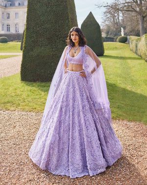 This lehenga set features intricate tonal sequin, beads and crystal embroidery. The blouse has a plunging neckline and comes with four sided embroidered net dupatta with long beaded tassels.