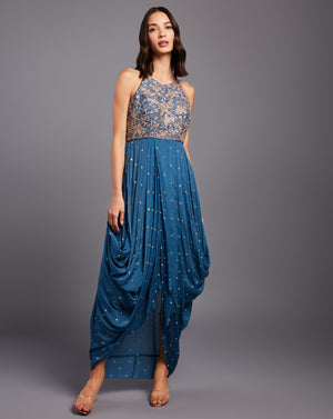 Blue cowl dress with glass beads and zardozi embelishment