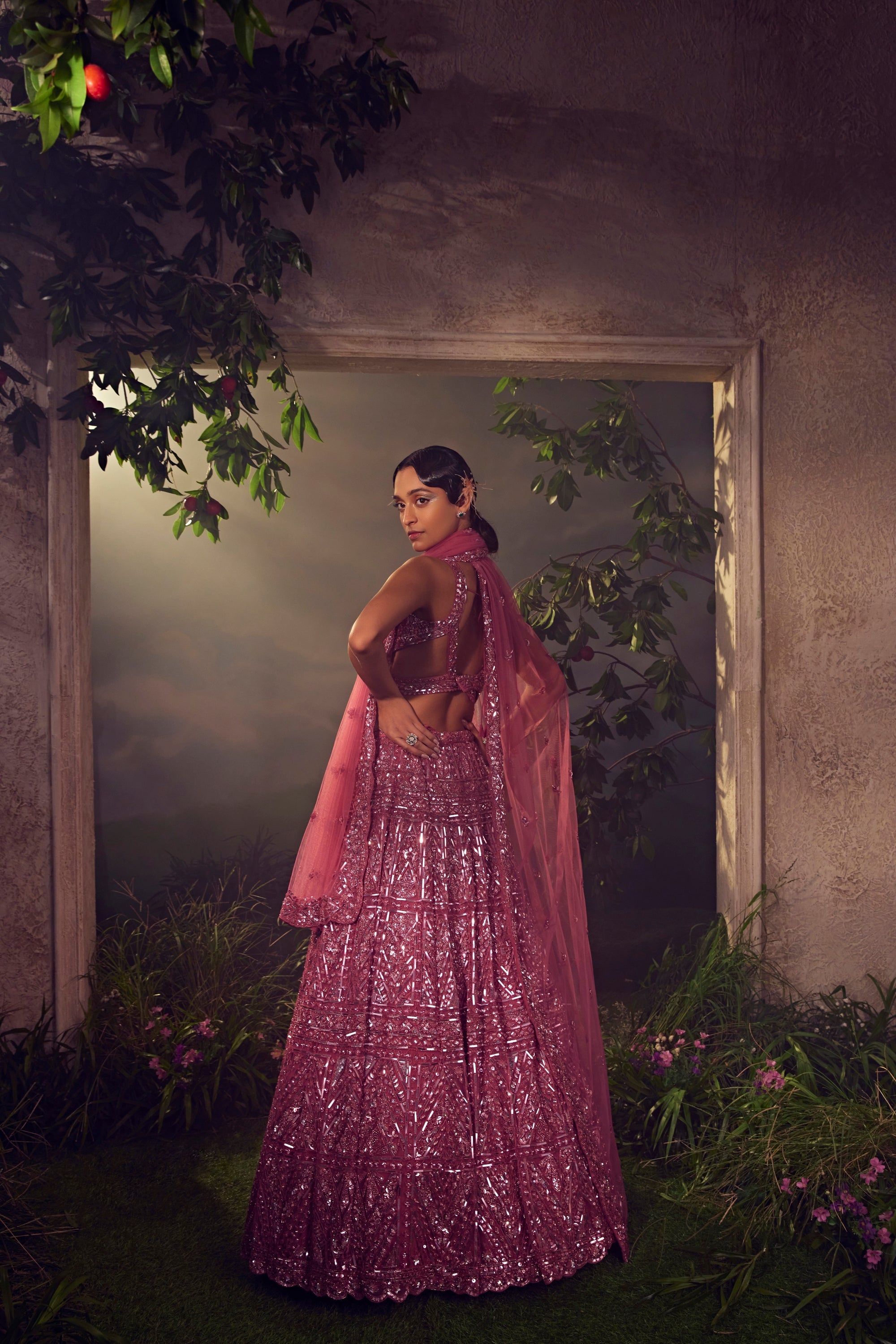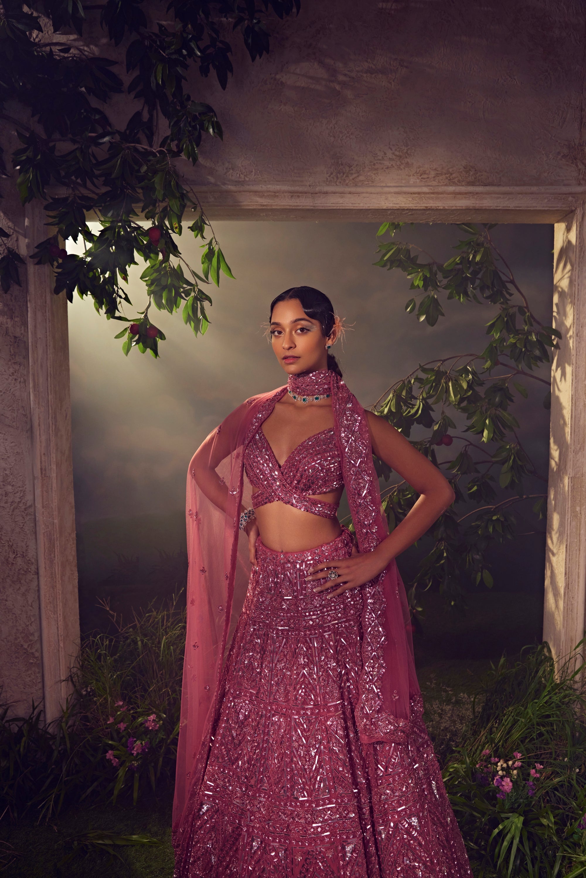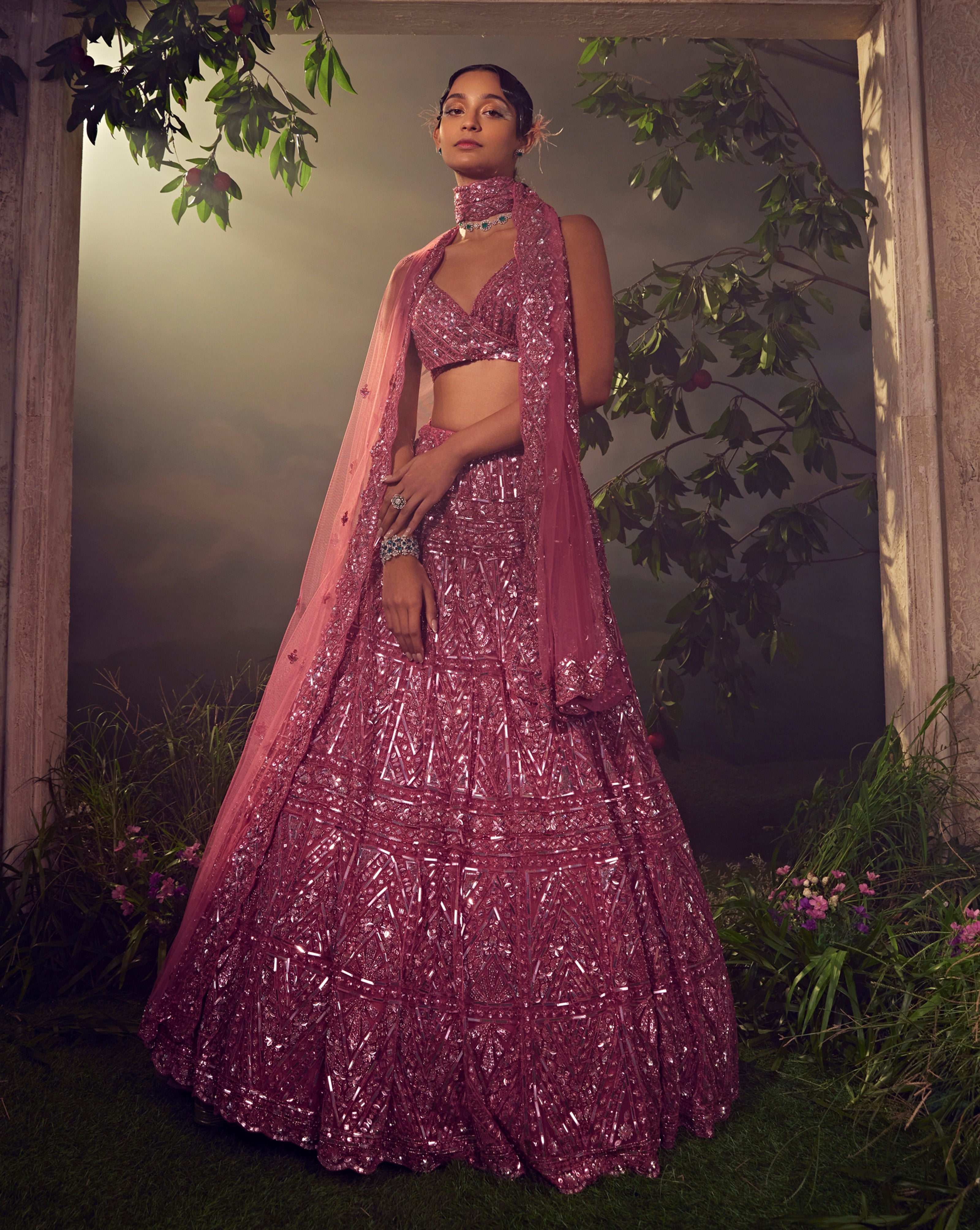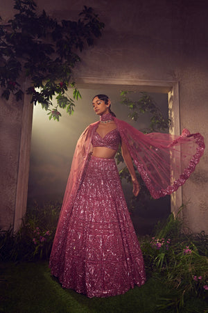 Featuring a metallic cashmere rose tulle lehenga embroidered fully by hand with various ornamental metallic sequences and Japanese bugle beads. It is paired with a dupatta and a stylised blouse.