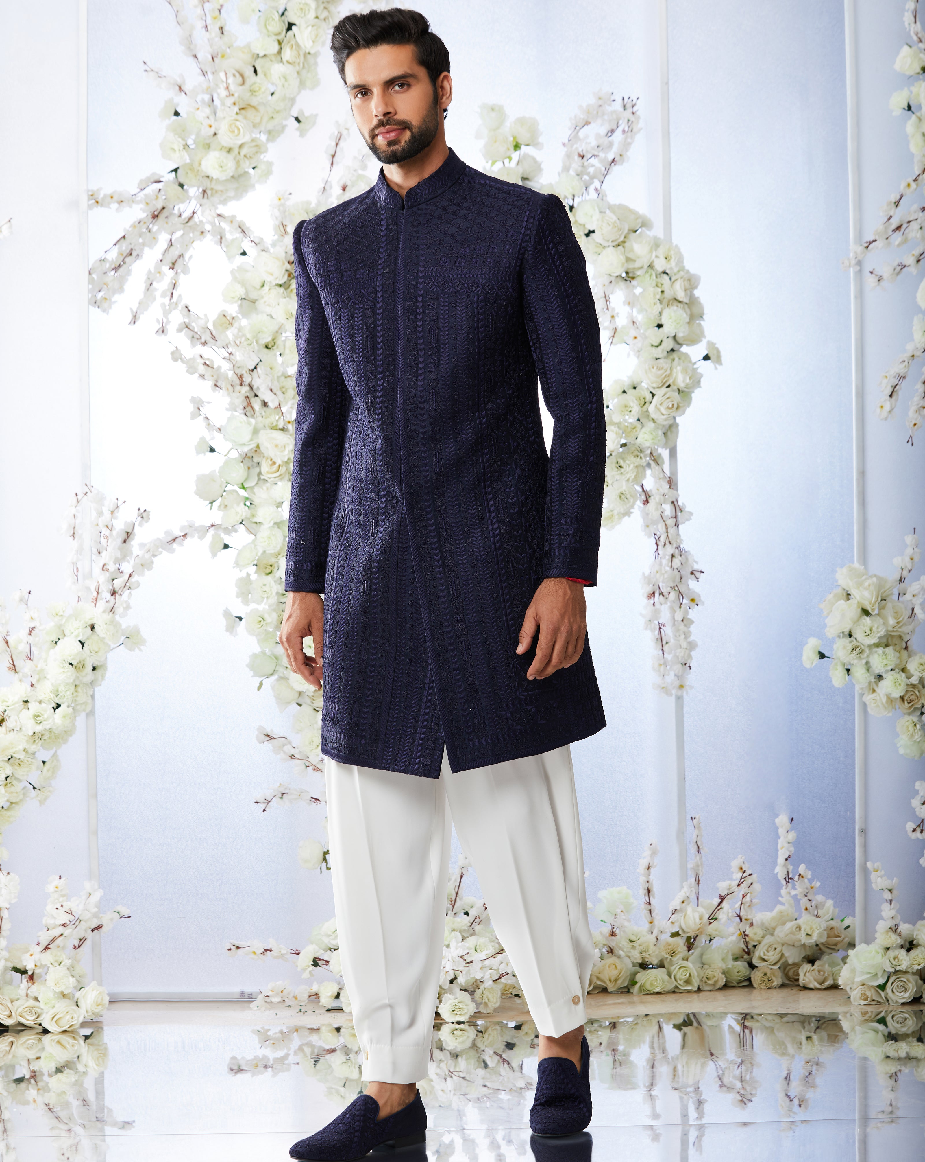 This midnight blue sherwani set features all over aari embroidery on a raw silk base. It is paired with a silk kurta and a white japanese drip pants. Complimenting footwear is also available.