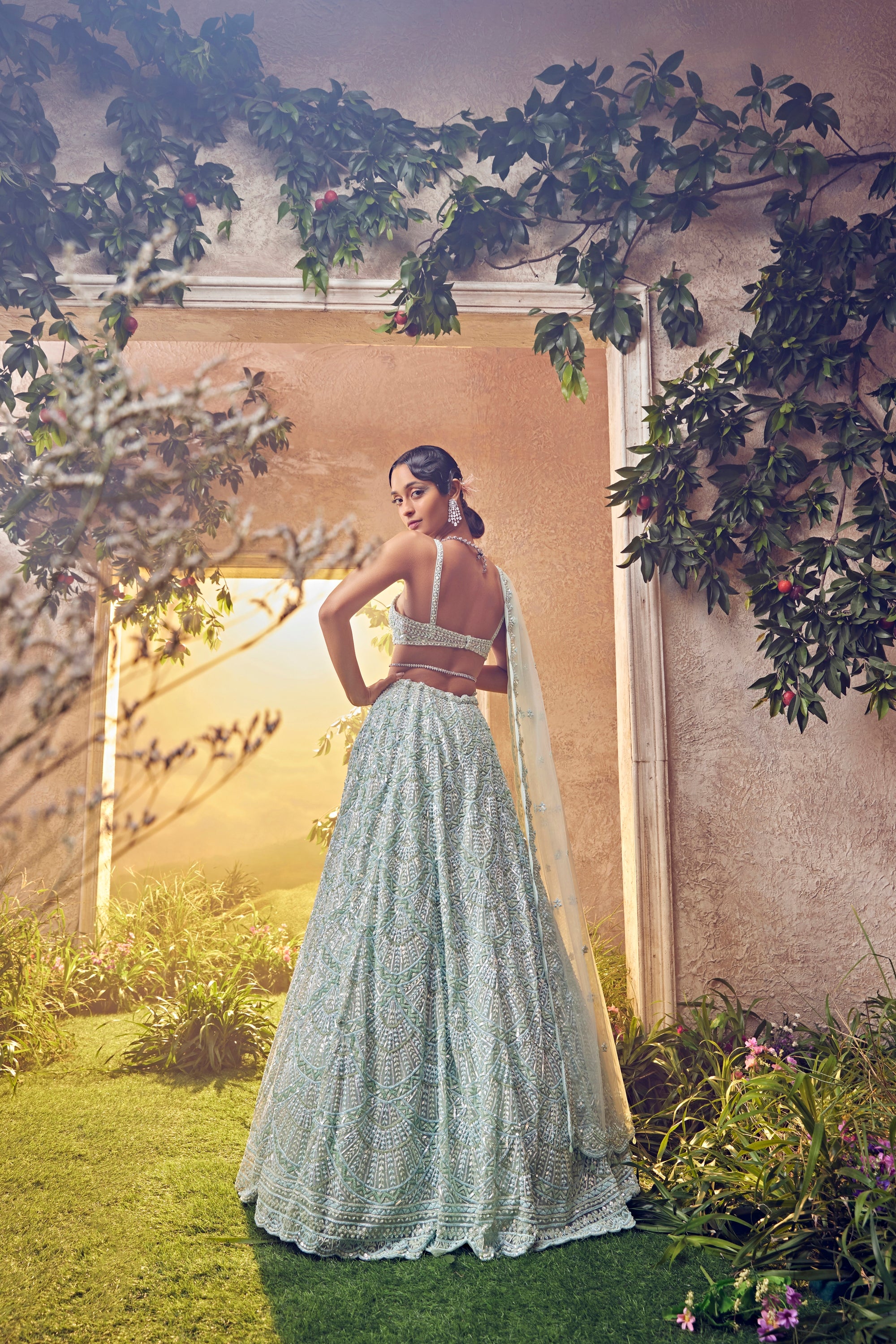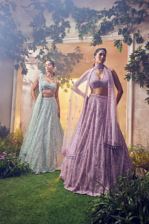 Featuring a mint green tulle lehenga embroidered fully by hand with various ornamental lustre sequences and Japanese bugle beads. It is paired with a scallop dupatta with crystal drops and blouse.