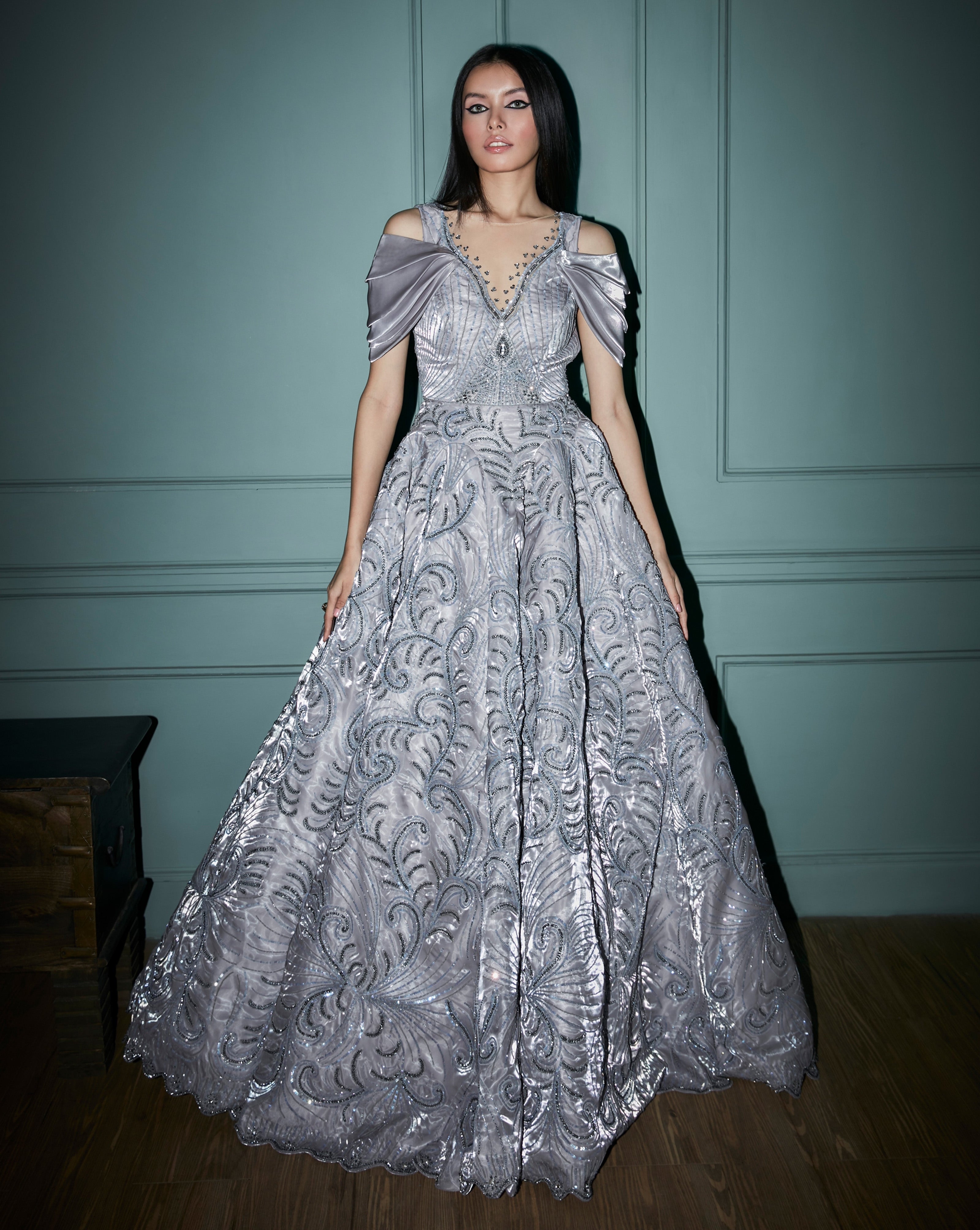 Our luxurious gown, designed to make you feel like a vision of elegance. This captivating gown features exquisite hand embroidery adorned with sequins and cutdana.