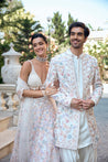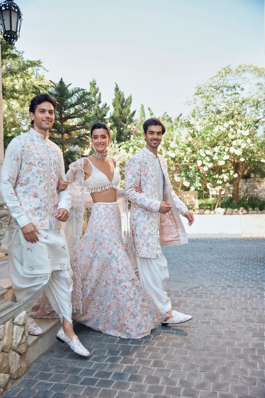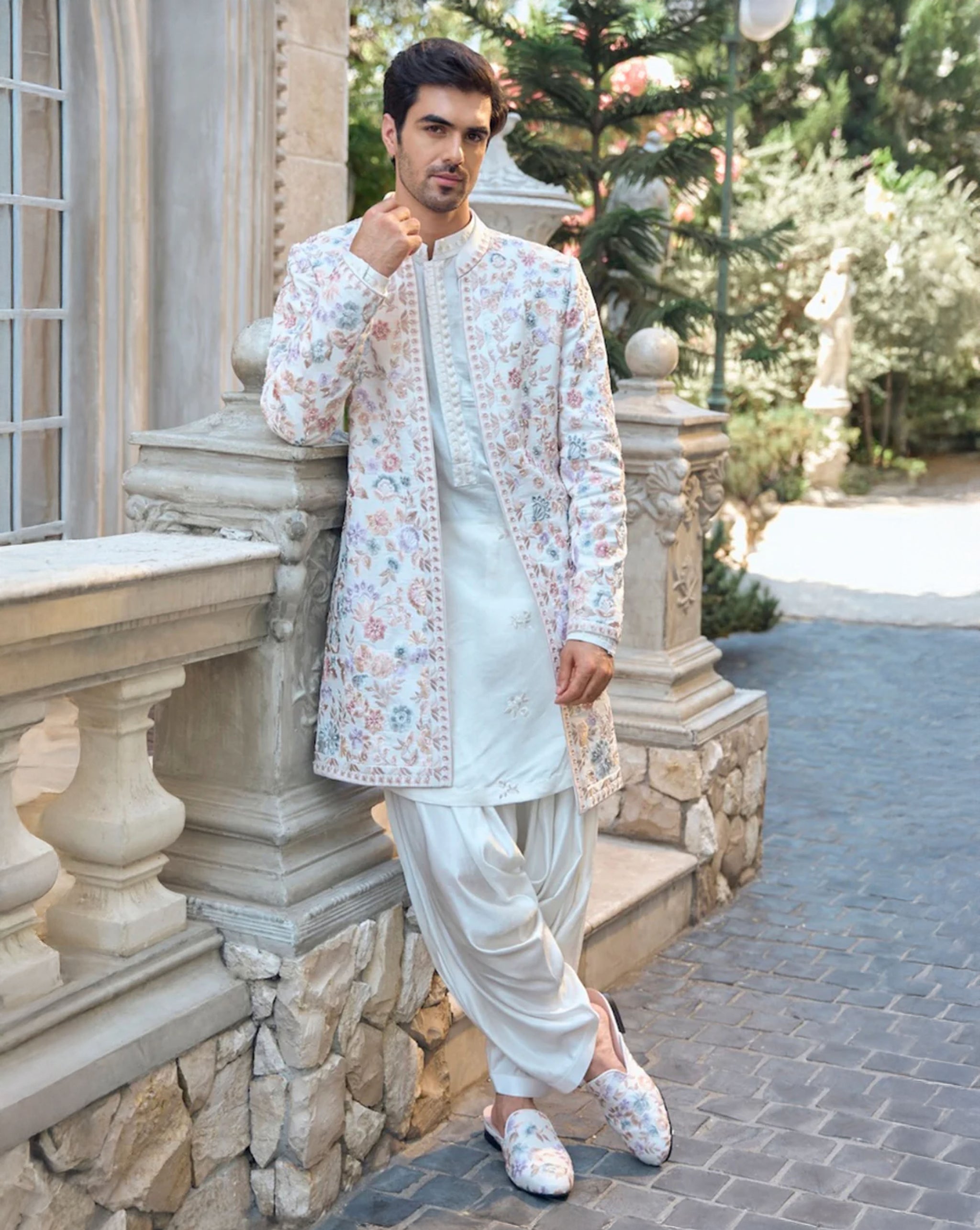 This set features all over thread embroidery in ivory, powder blue, peaches, mauves and sage green tones and highlighted with assorted beads and sequins. It is paired with an embroidered satin kurta and matching afghani salwar. Complementing footwear is also available.