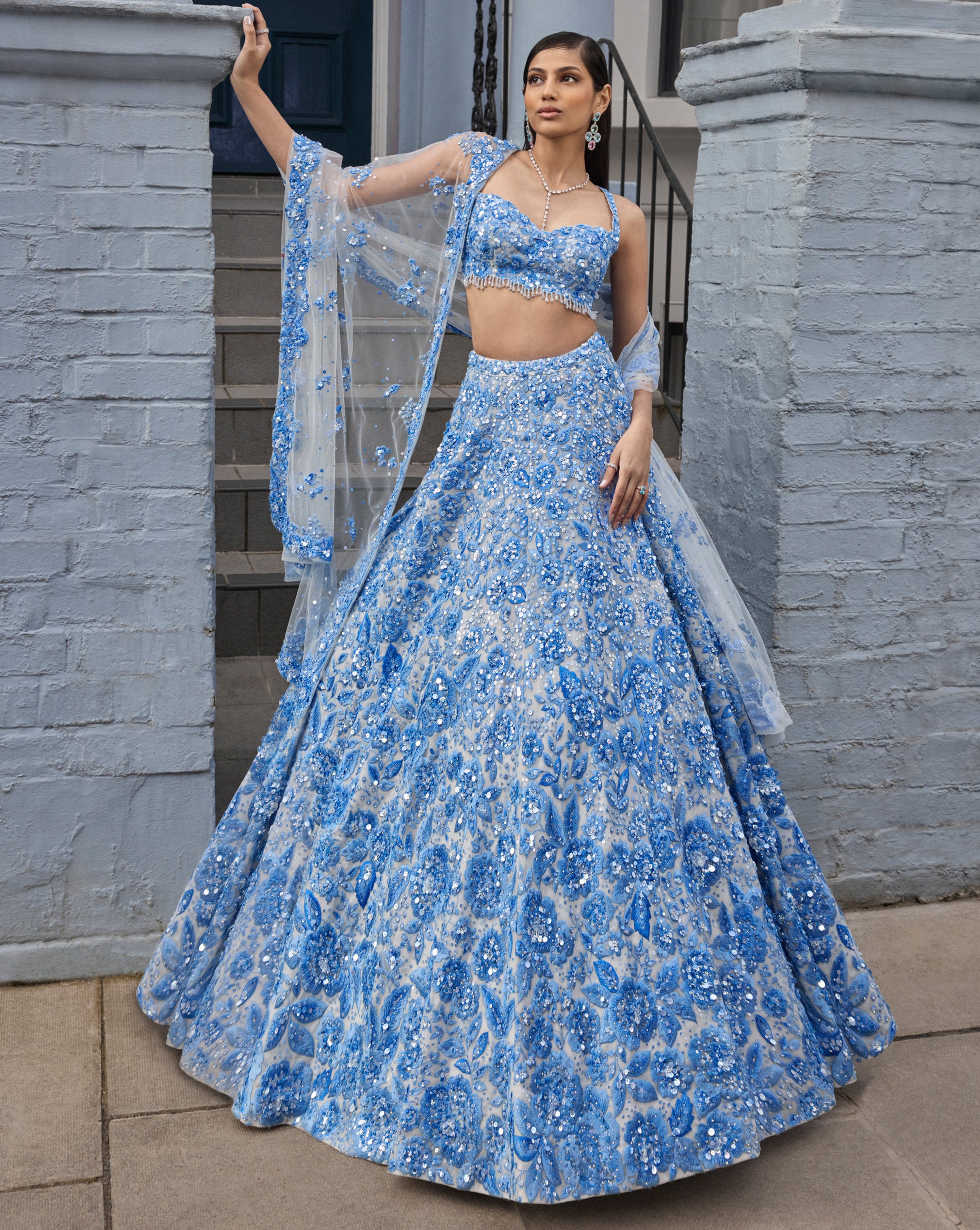 This lehenga set features powder blue three-dimensional floral embroidery, highlighted with crystals, pearls, and sequins on an ivory base. The waist of the blouse is scalloped and shows crystal drops. It is paired with a four-sided embroidered dupatta.