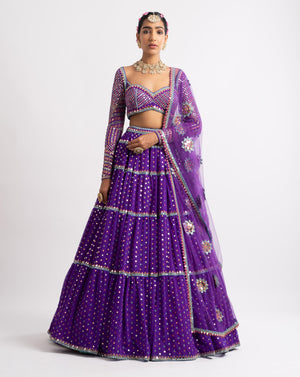 Intricately hand embroidered multi color sweetheart blouse with multi tier hand embroidered lehenga and a beautiful mirror work dupatta.