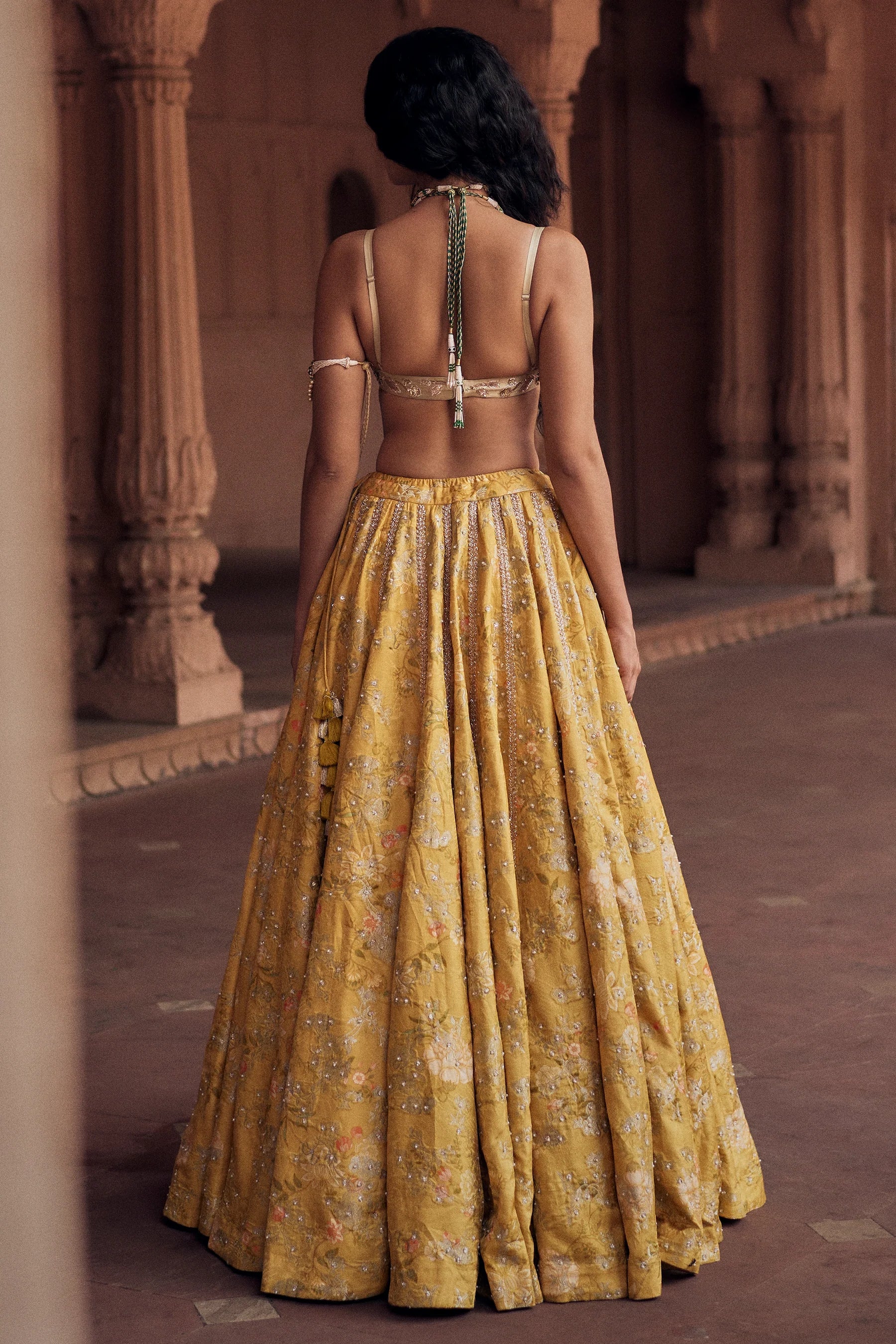 A self-woven jacquard lehenga in a soft tuscany yellow, with hand-embroidered lace borders and delicate pearls. It is paired with an off-white blouse hand-embroidered in delicate floral chintz and a scallop embroidered organza dupatta.