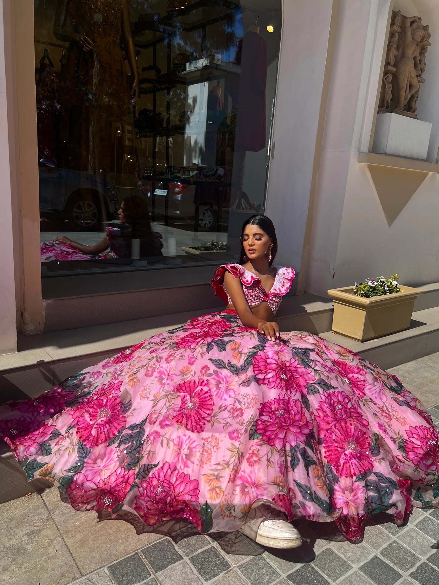 The Scarelette Lehenga is a delicate and lightweight masterpiece, featuring a charming butterfly blouse adorned with pink sequin flowers on soft organza fabric. Paired with a light, flowing can-can skirt, this ensemble combines grace and ease, making it the perfect choice for wedding functions where comfort and style go hand in hand.