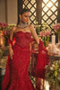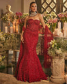 Scarlet red fishcut lehenga with all over sequin,crystal & cutdana tonal embroidery. Paired with a statement off shoulder blouse and matching dupatta to complete the set..
