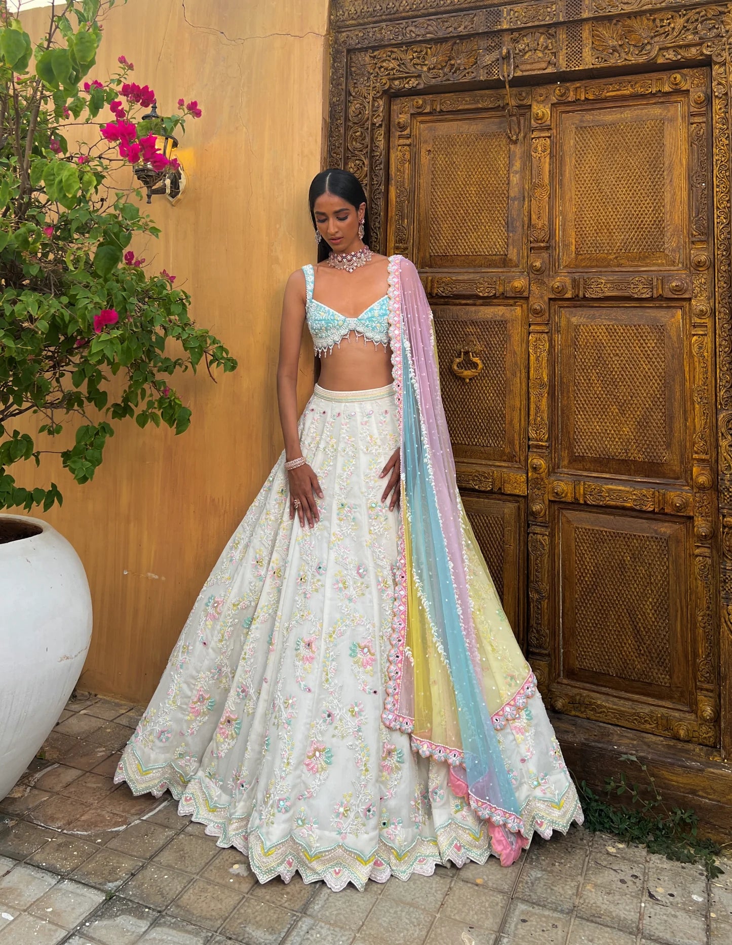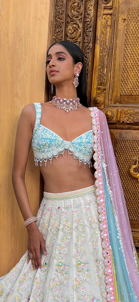 The Sumanjima Lehenga is a vision of elegance with its candy-colored tones and playful, multi-colored pastel dupatta that adds a vibrant touch to the ensemble. The pearl-embroidered blouse exudes sophistication, while the white lehenga skirt, adorned with intricate mirror and bead embroidery, offers a refined yet eye-catching look. Perfect for any wedding function.