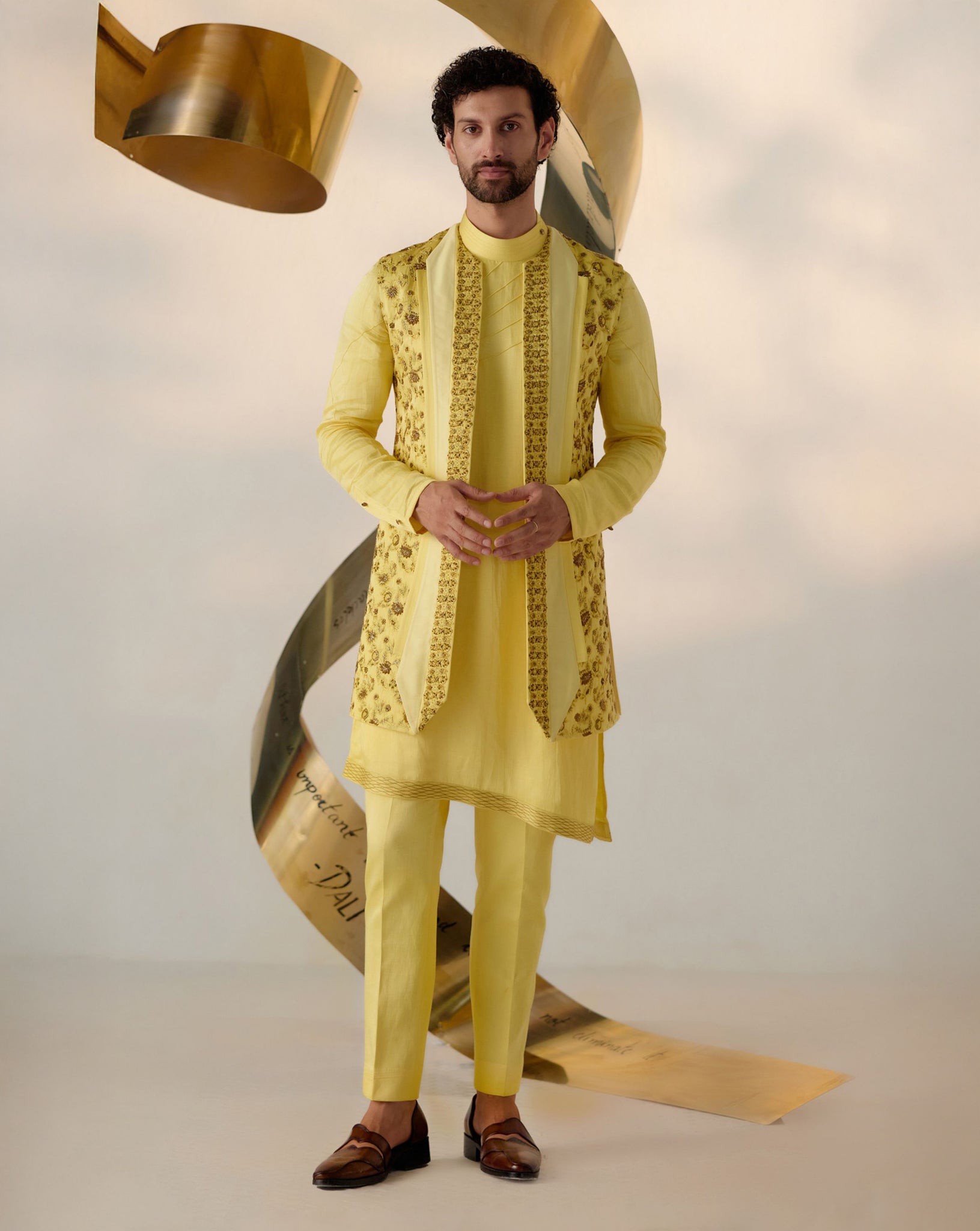 Featuring our new lemon yellow shrug set with intricate floral hand embroidery and three types of embroidered lapels in shades of yellow. Paired with an embroidered shoulder button kurta and tapered trousers.