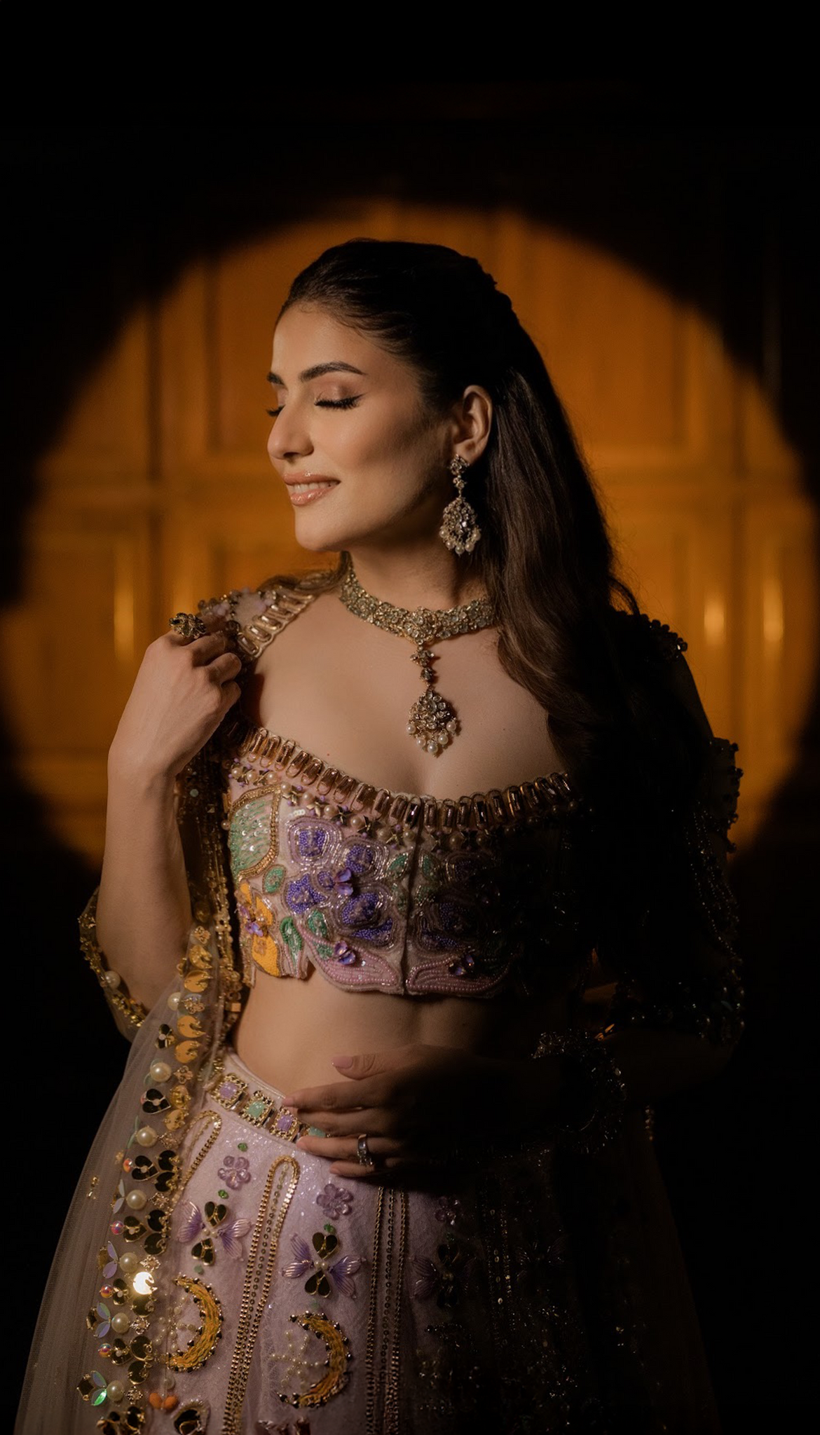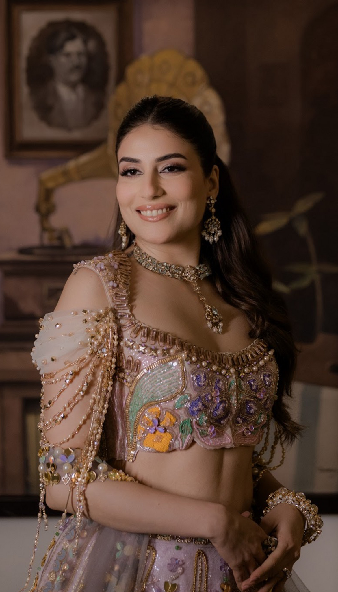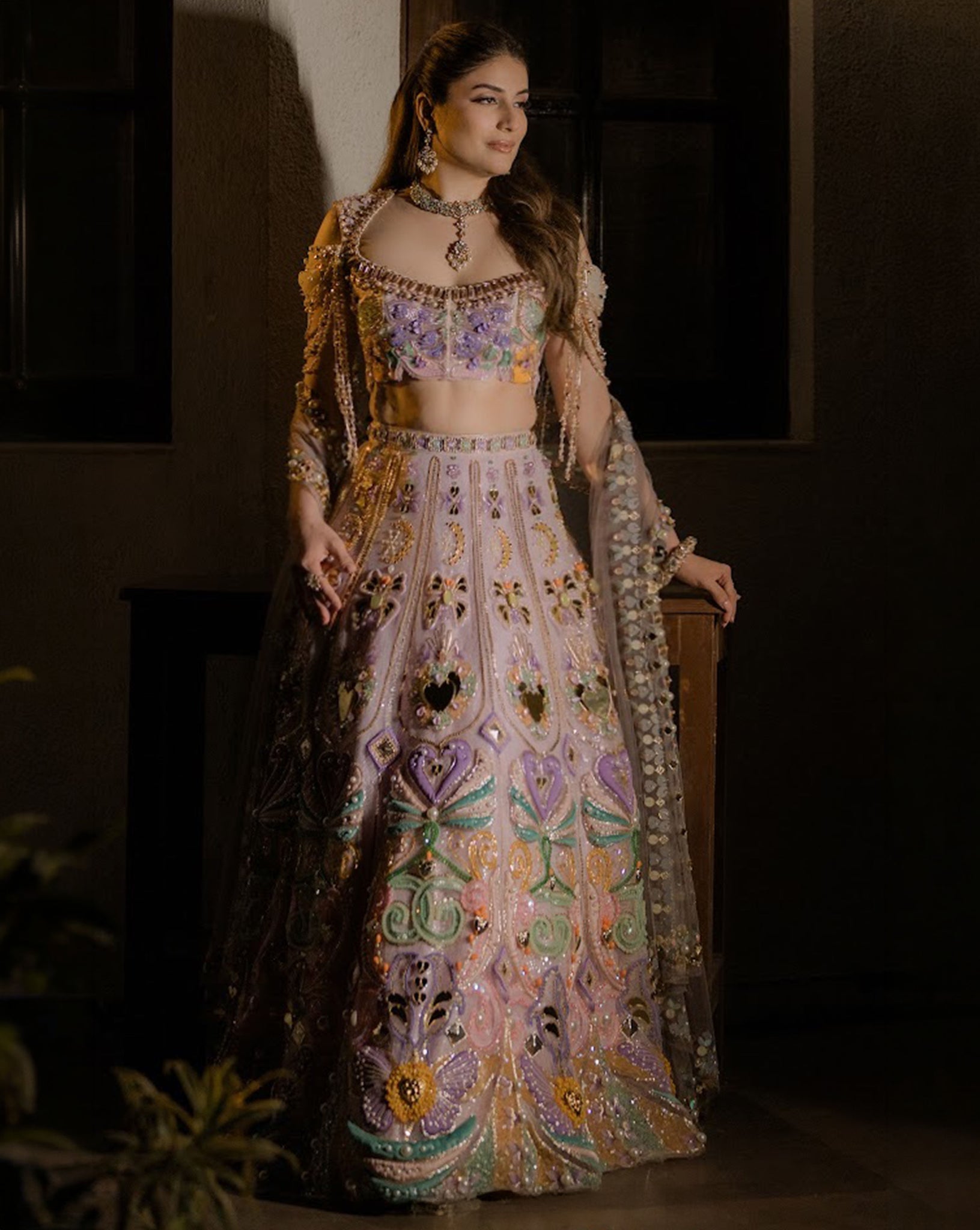 A baby pink lehenga set in shades of lilac, mint, peach, and gold, richly embellished with beads, pearls, sequins, metal accents, and appliqué motifs. Paired with a blouse featuring 3D detailing and soft beaded fringes, it radiates whimsical charm and modern femininity through a blend of texture and tradition.