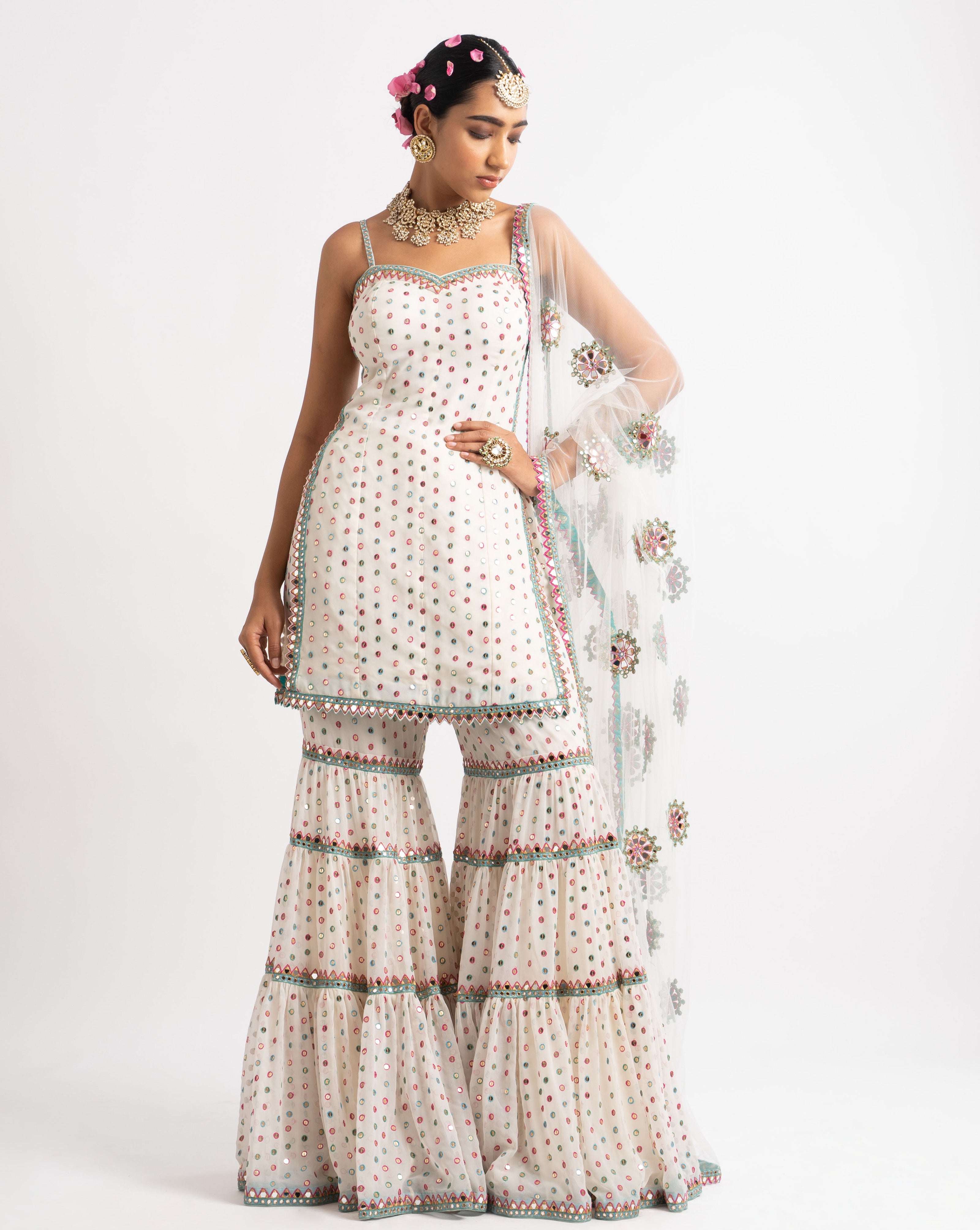 Polka sequins multi color hand embroidered multi-tier sharara and kurta with multi mirror work dupatta.