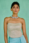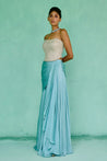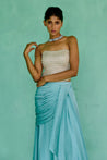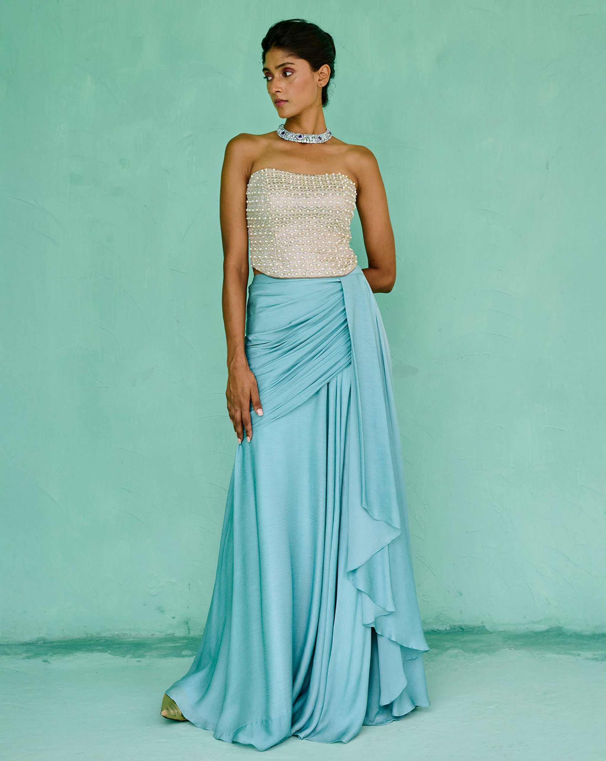 Chiffon cascade drape skirt paired with pearl and glassbeads embroidered corset top.
