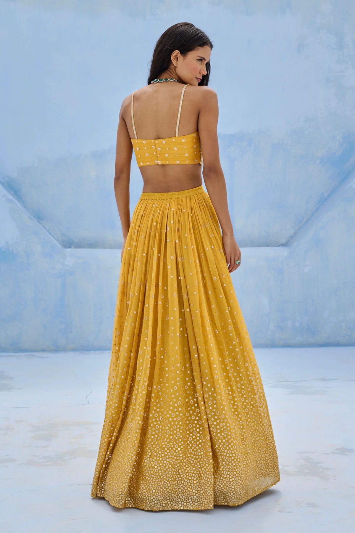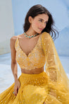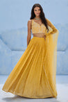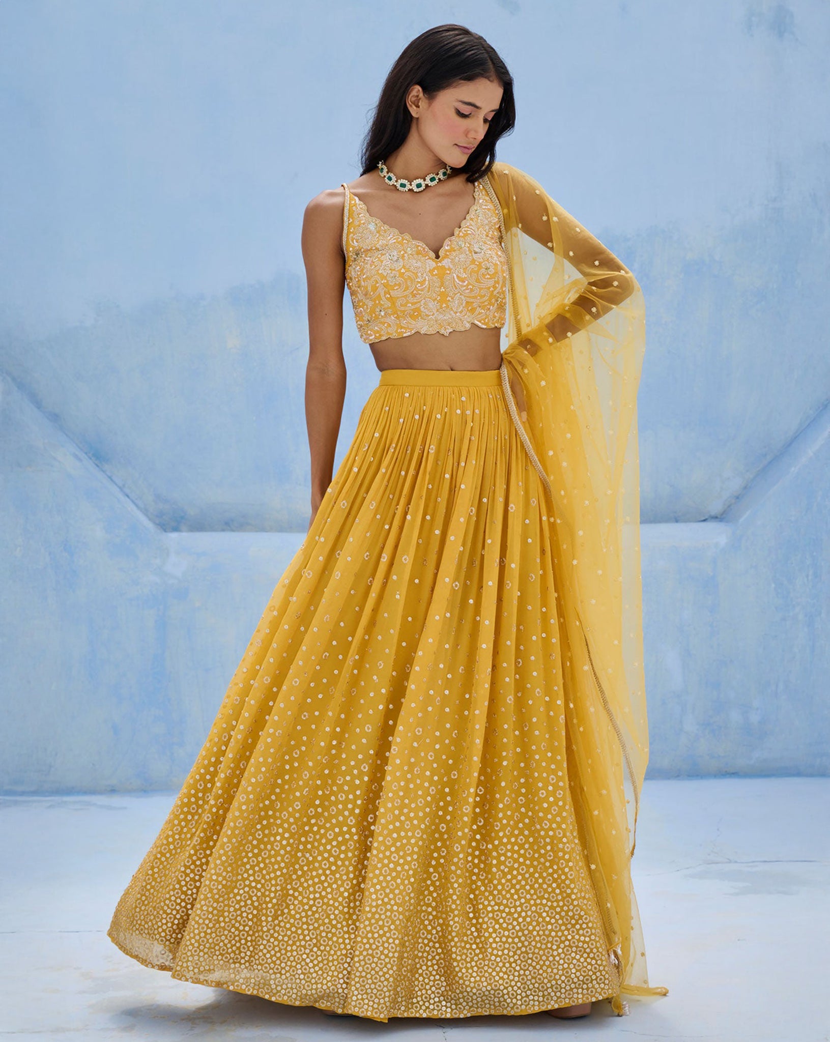 Sequence embellished ruched lehenga paired with sequence and glassbeads embroidered blouse and tulle dupatta.